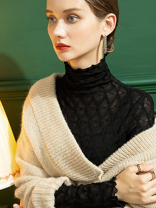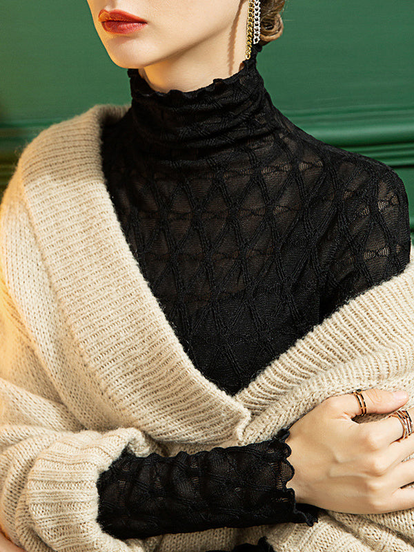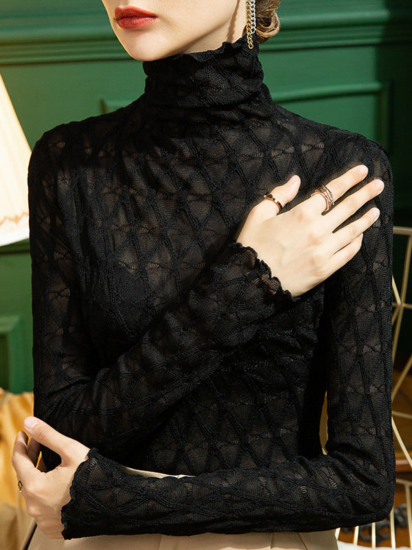 Stylish Lace Skinny Falbala Checkered High-Neck T-Shirts Tops