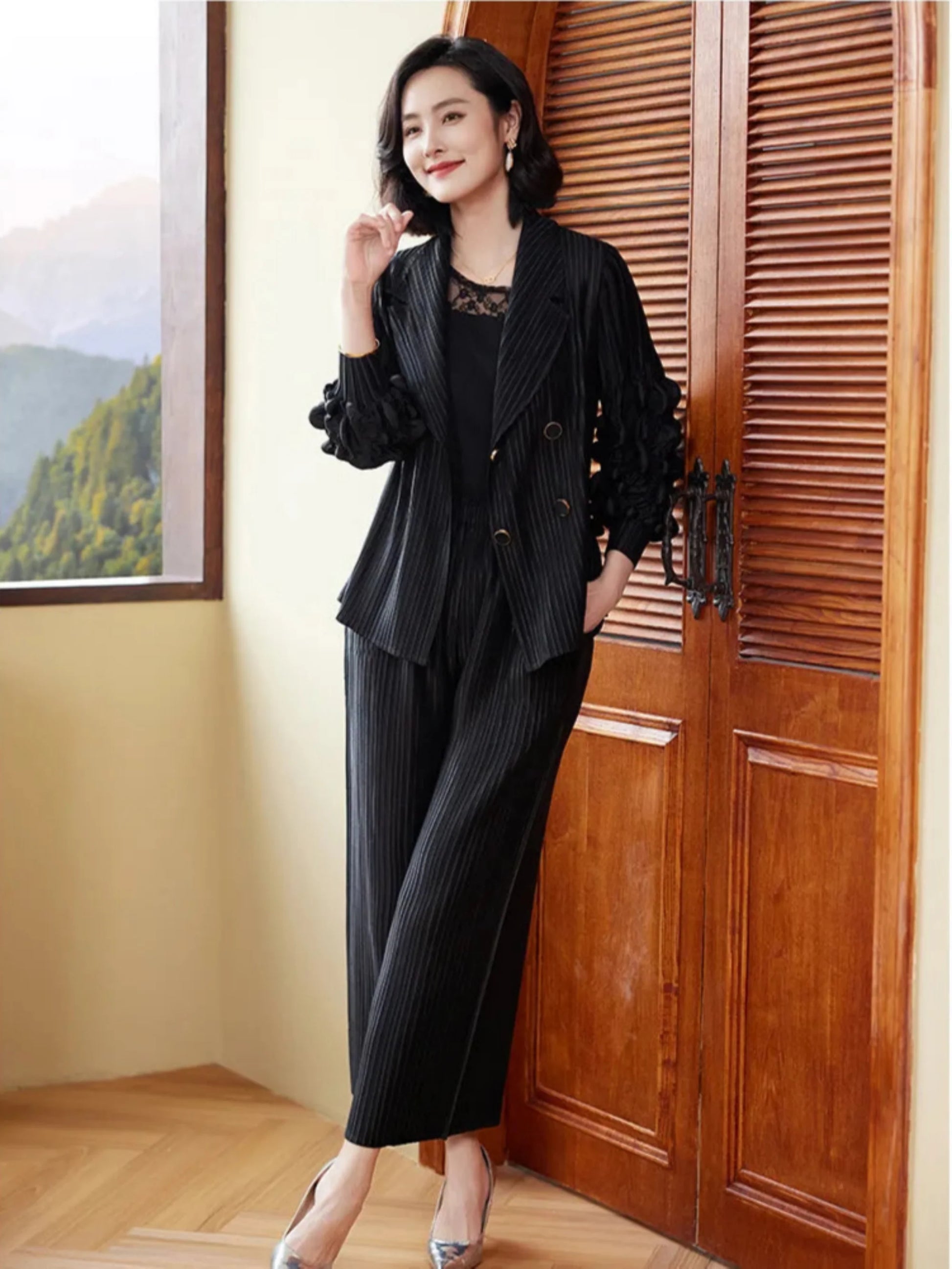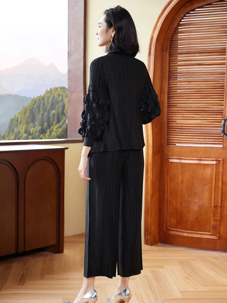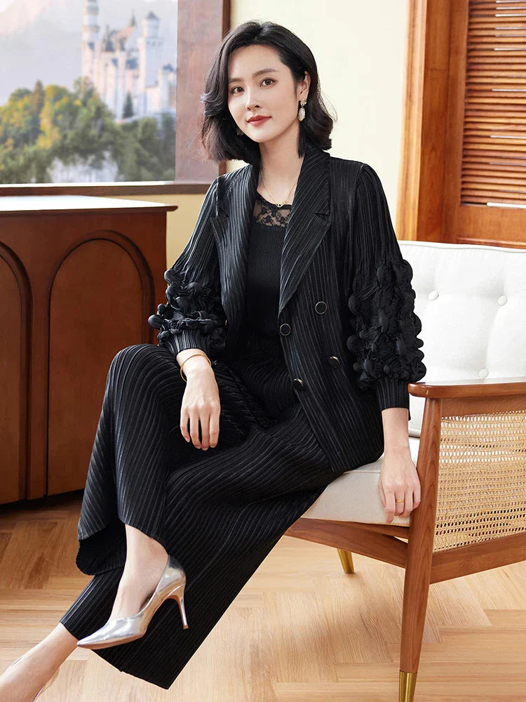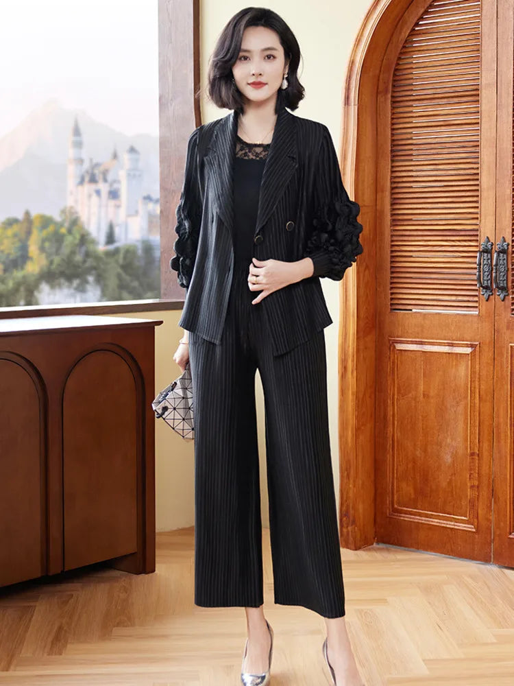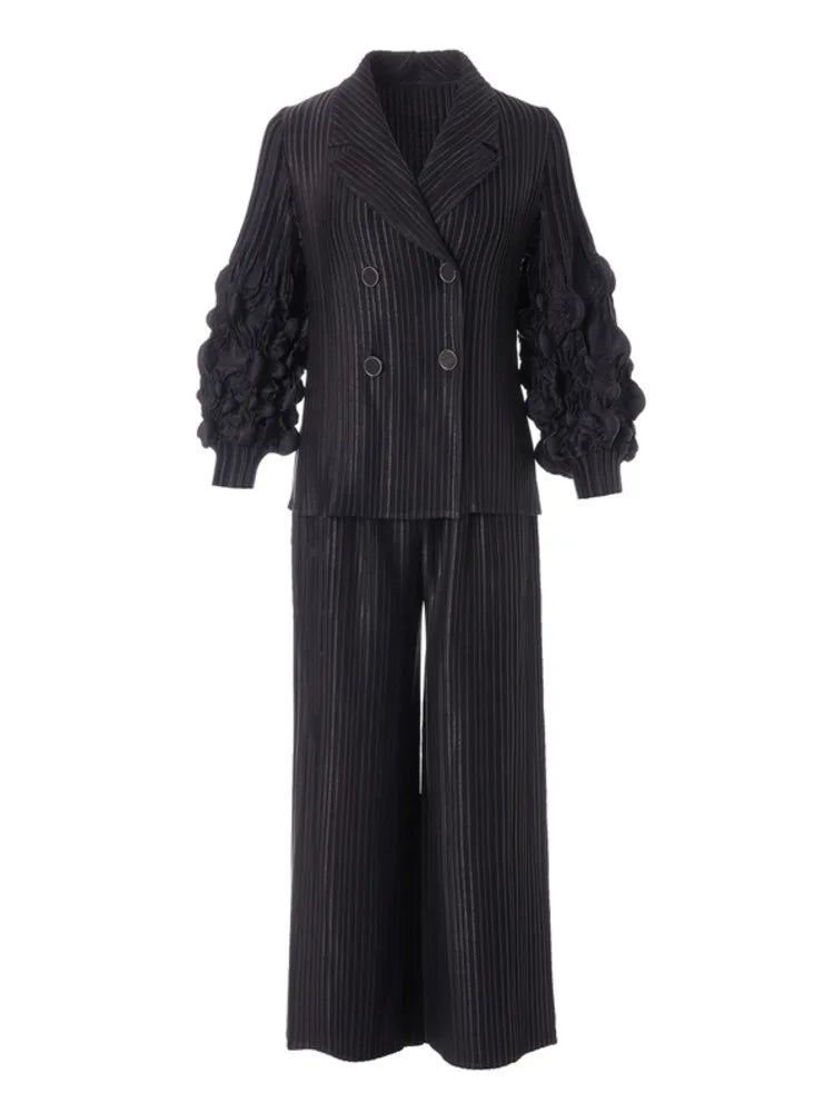 This couture two-piece set features a striped jacket adorned with 3D floral ruffle sleeves and matching wide-leg trousers. The pull-on pants with an elastic waistband ensure comfort. while the ensemble's unique design offers an elegant and stylish look.