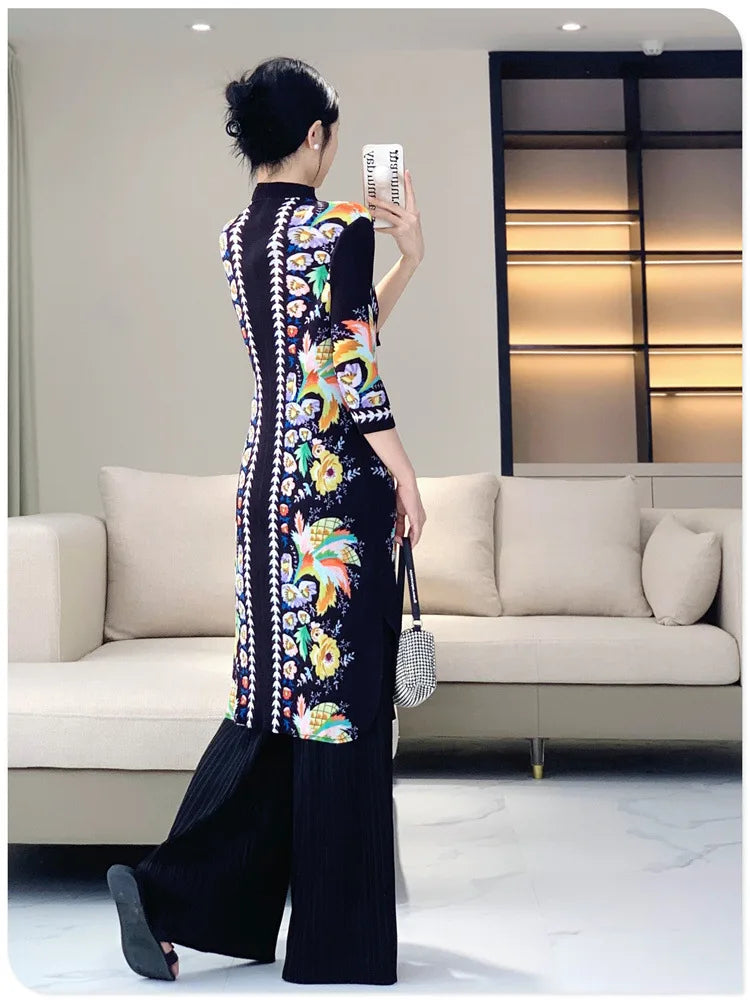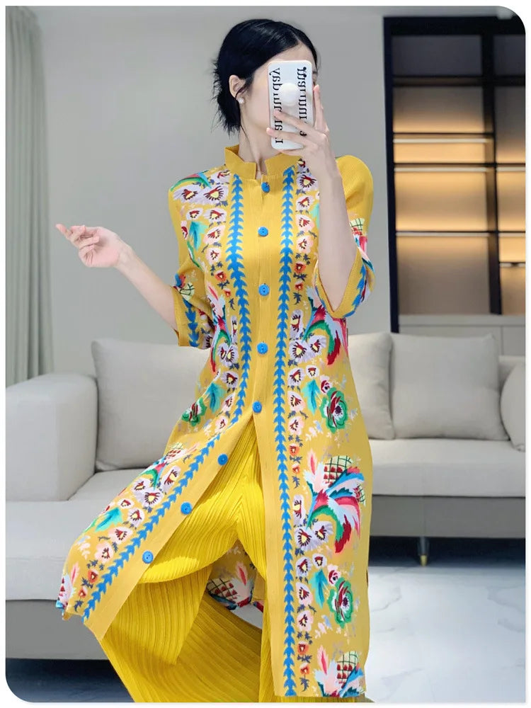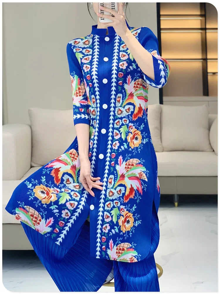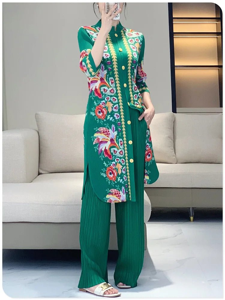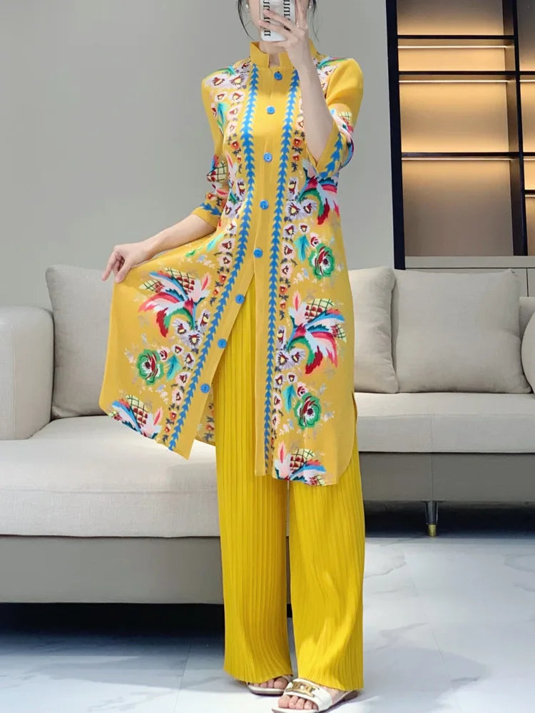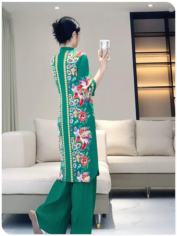 This luxurious ensemble features an extra-long. short-sleeve blouse paired with wide-leg. pull-on pants. The elastic waistband ensures a comfortable fit. while the coordinated design offers an elegant and stylish look.