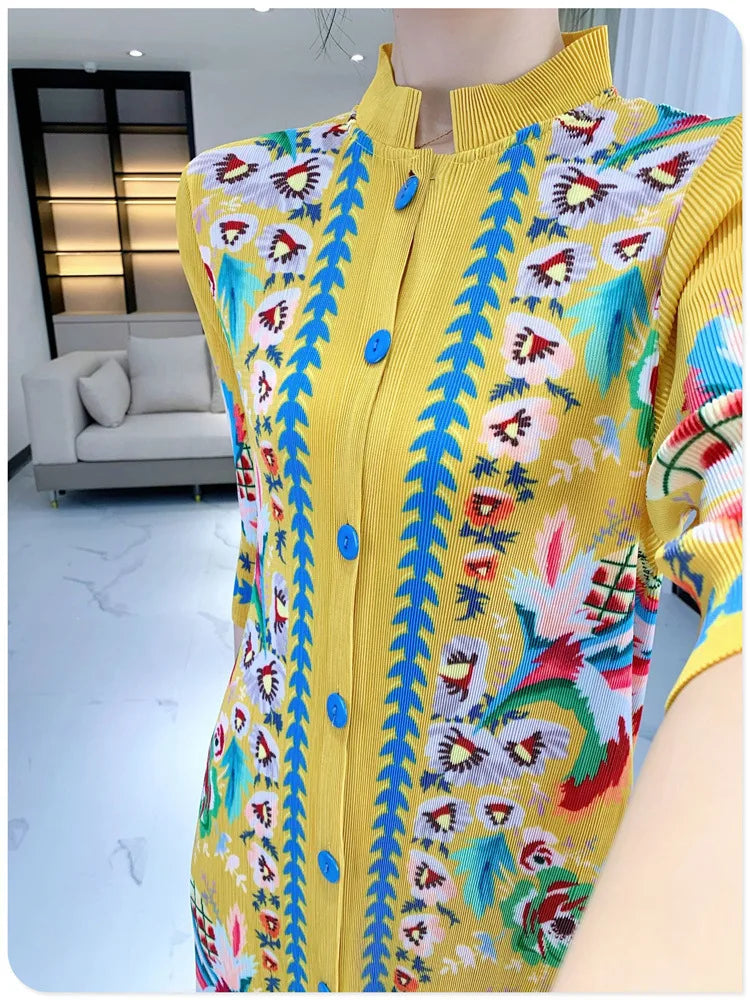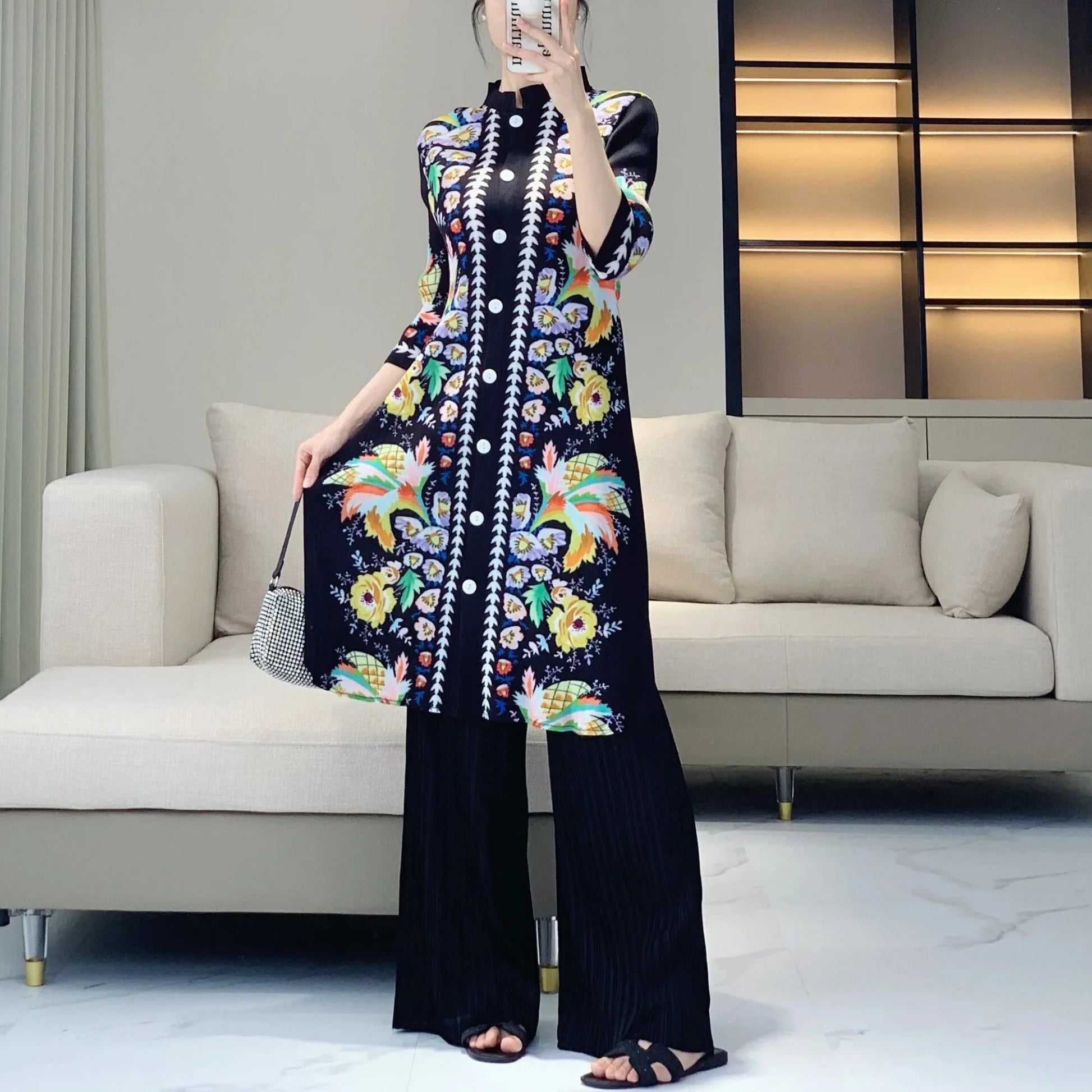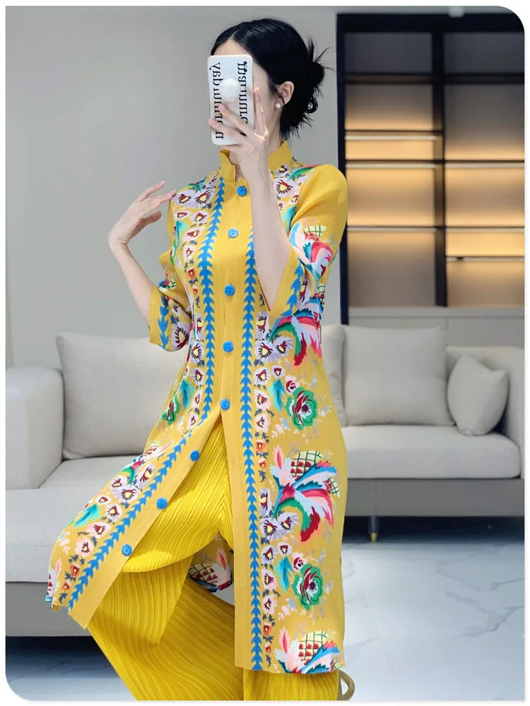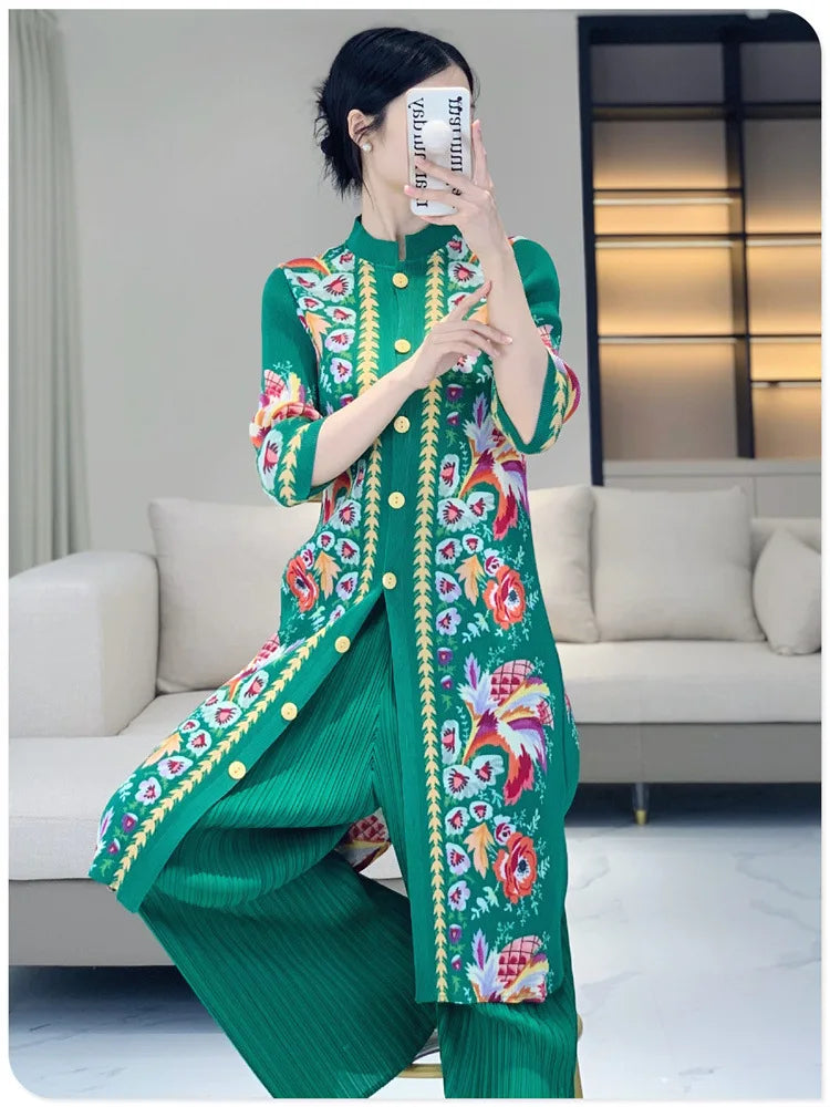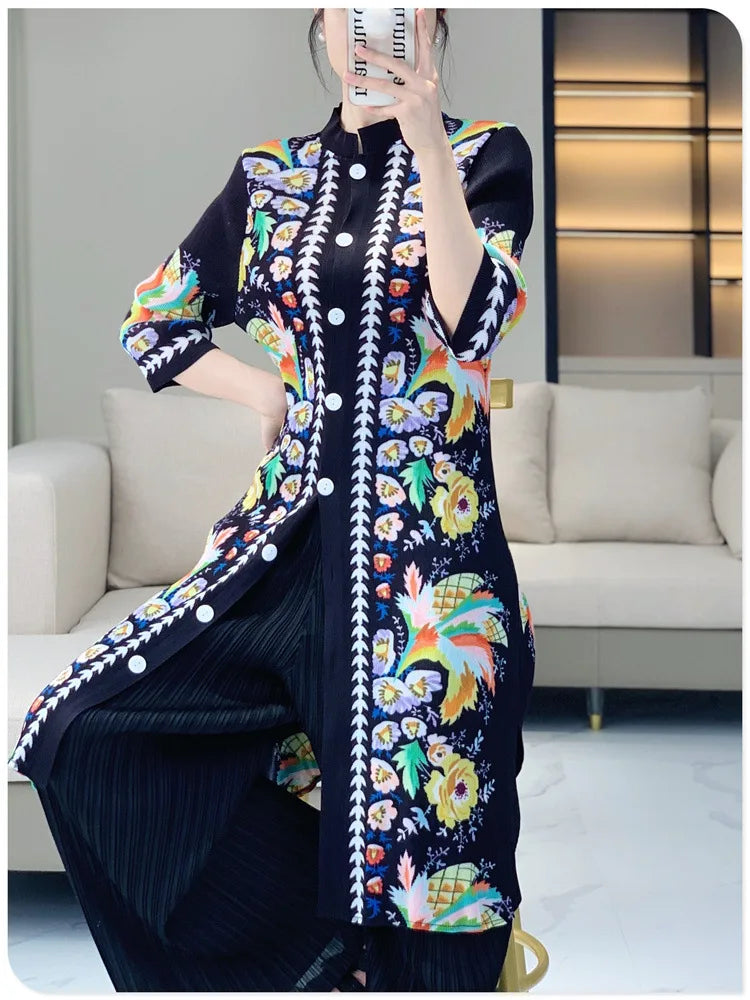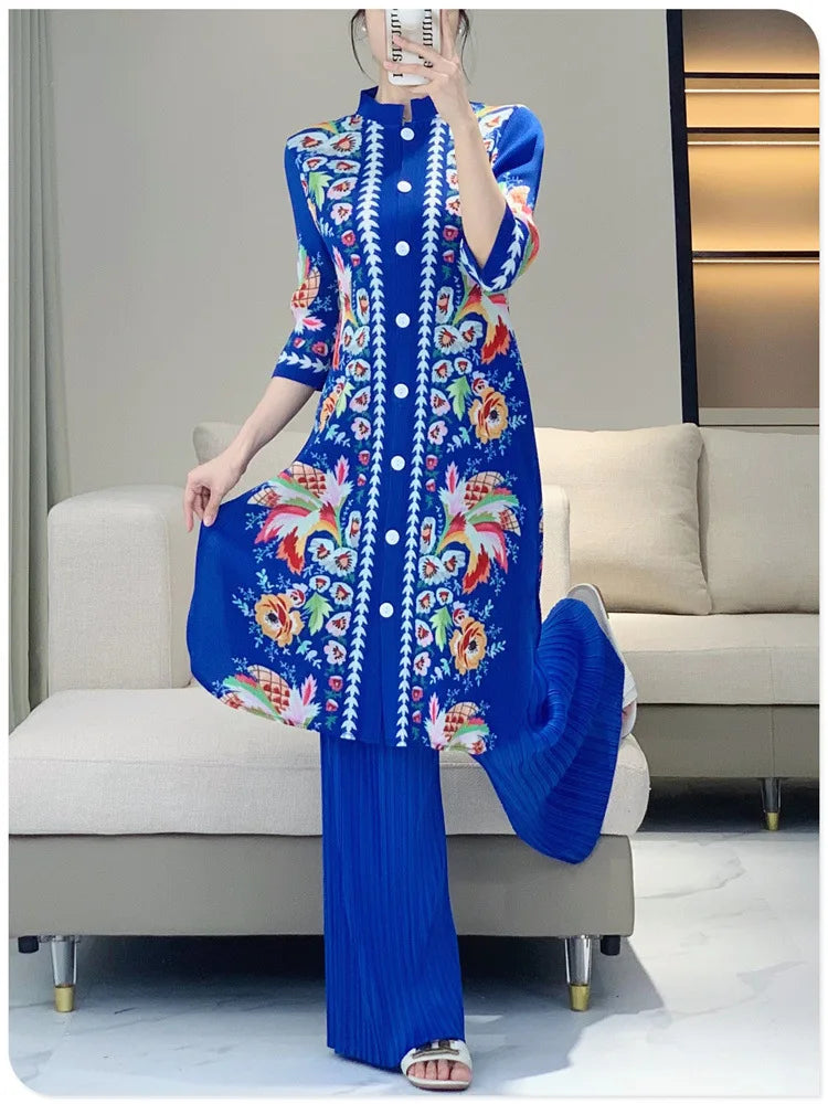 This luxurious ensemble features an extra-long. short-sleeve blouse paired with wide-leg. pull-on pants. The elastic waistband ensures a comfortable fit. while the coordinated design offers an elegant and stylish look.