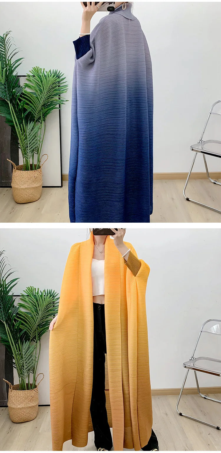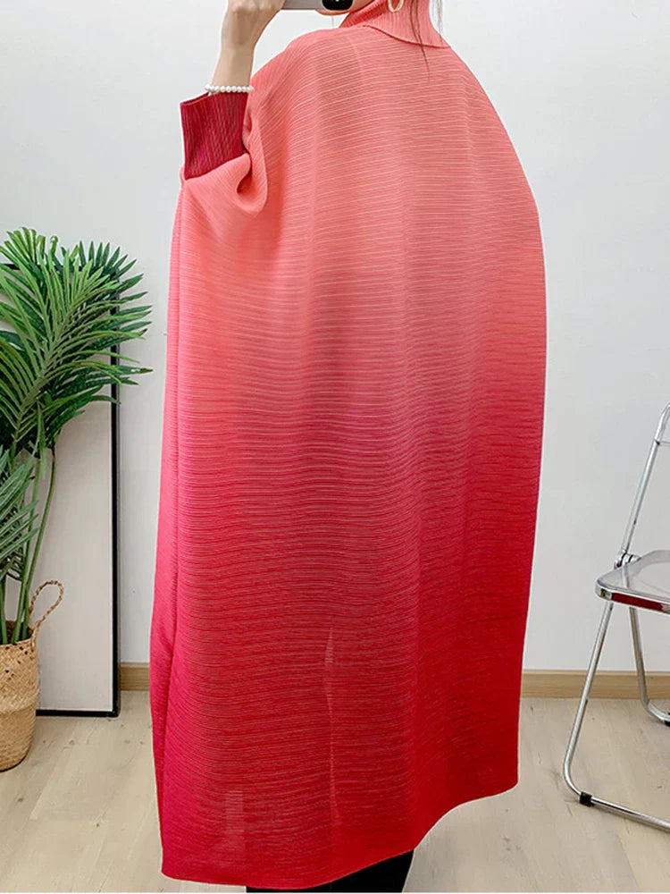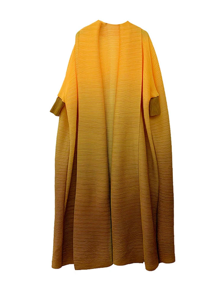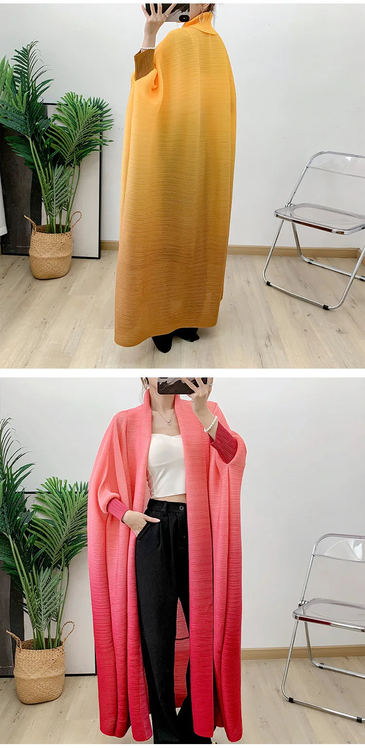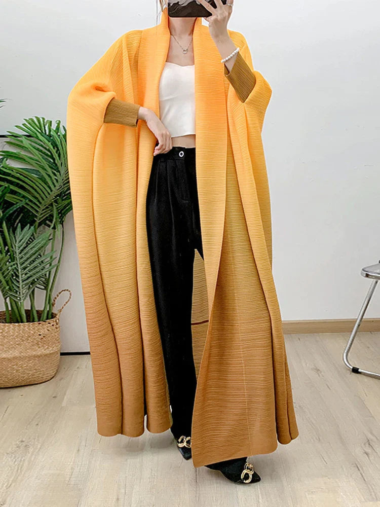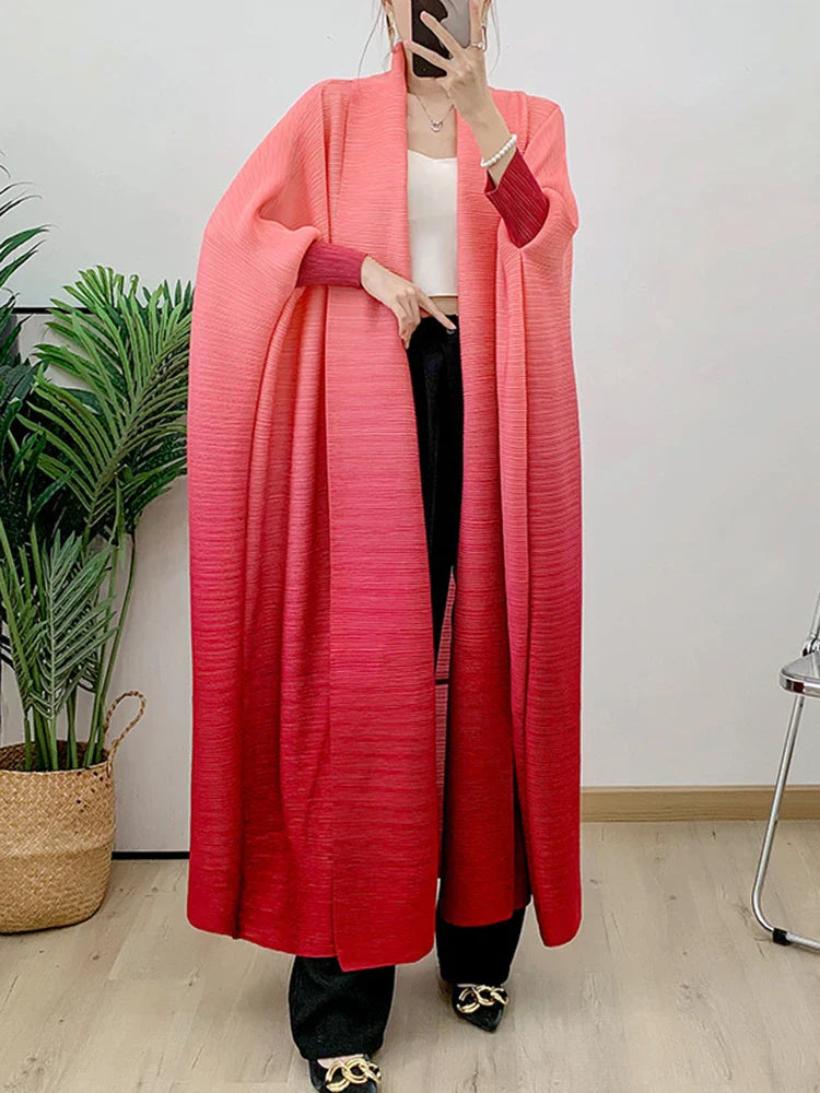This trench coat features elegant pleats and dramatic batwing sleeves. creating a striking silhouette. The vibrant ombre colors add a dynamic touch. making it an eye-catching statement piece for any wardrobe.