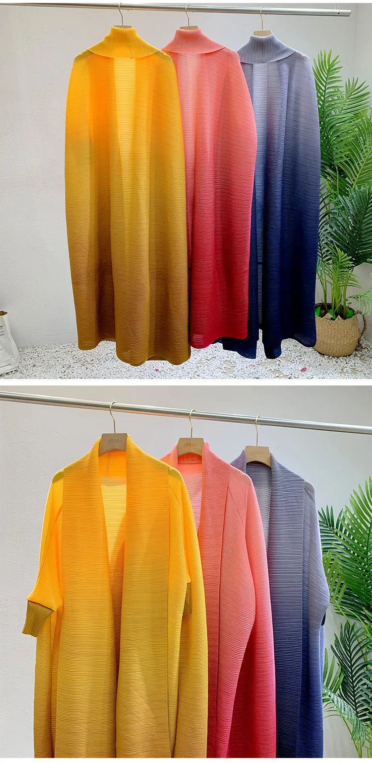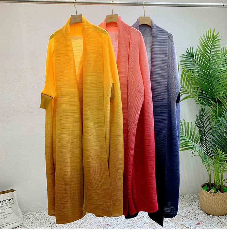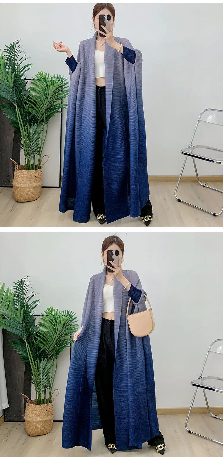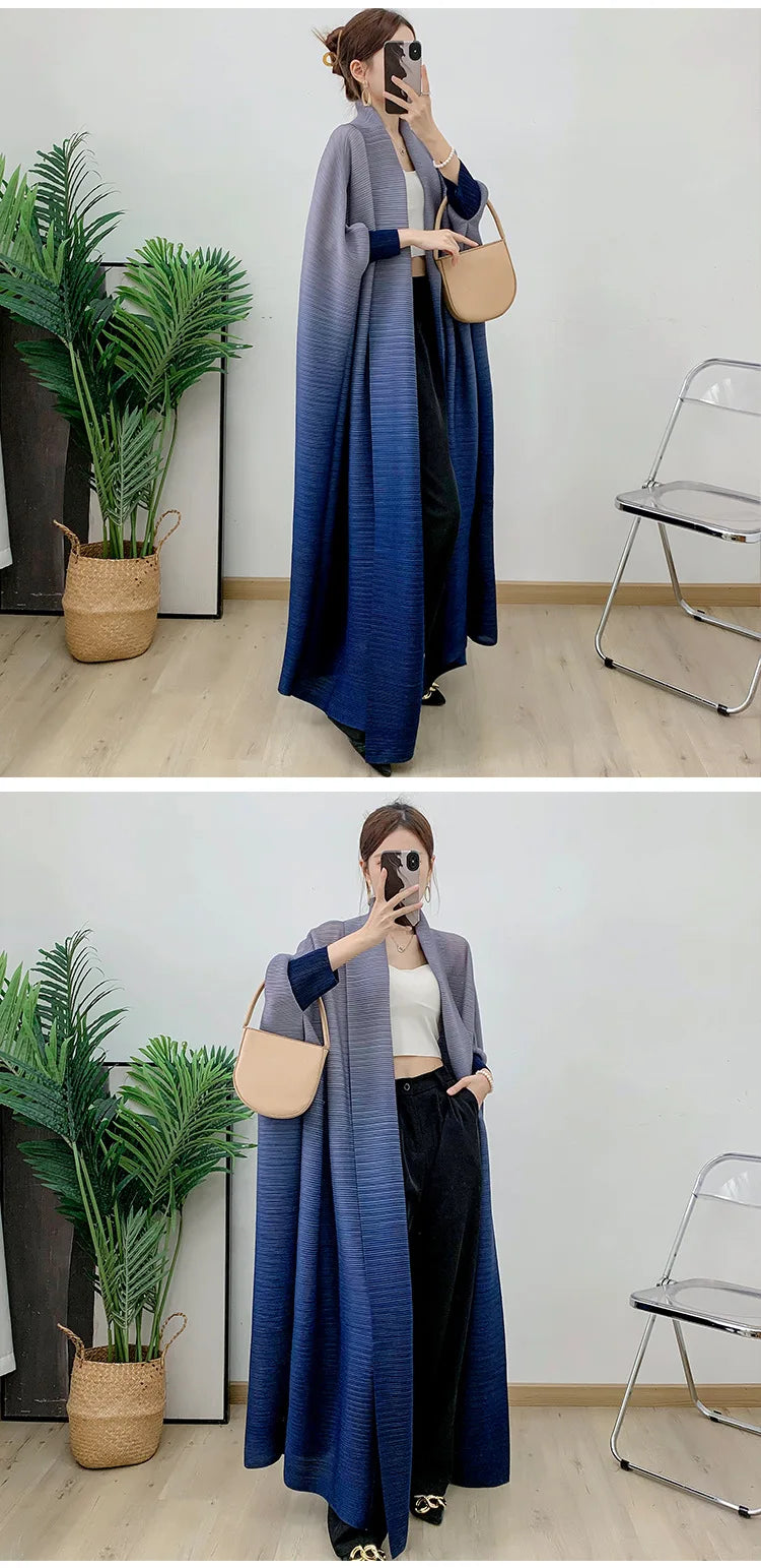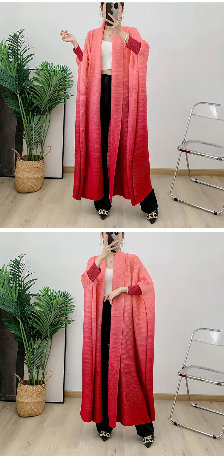 This trench coat features elegant pleats and dramatic batwing sleeves. creating a striking silhouette. The vibrant ombre colors add a dynamic touch. making it an eye-catching statement piece for any wardrobe.