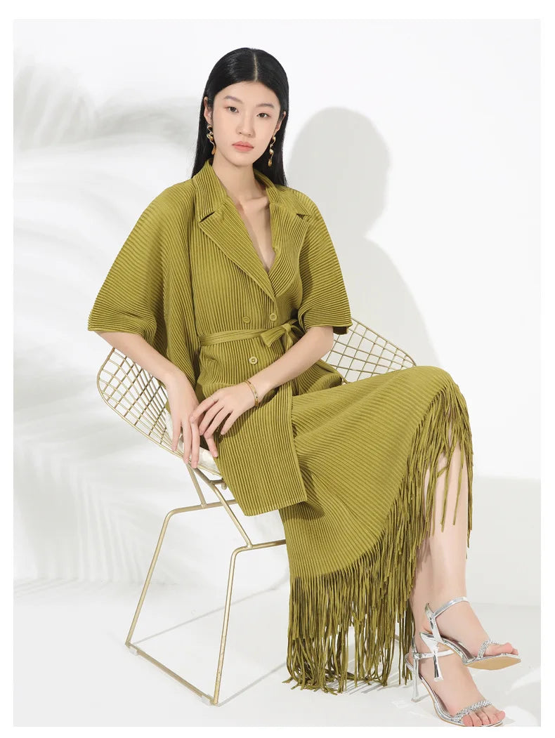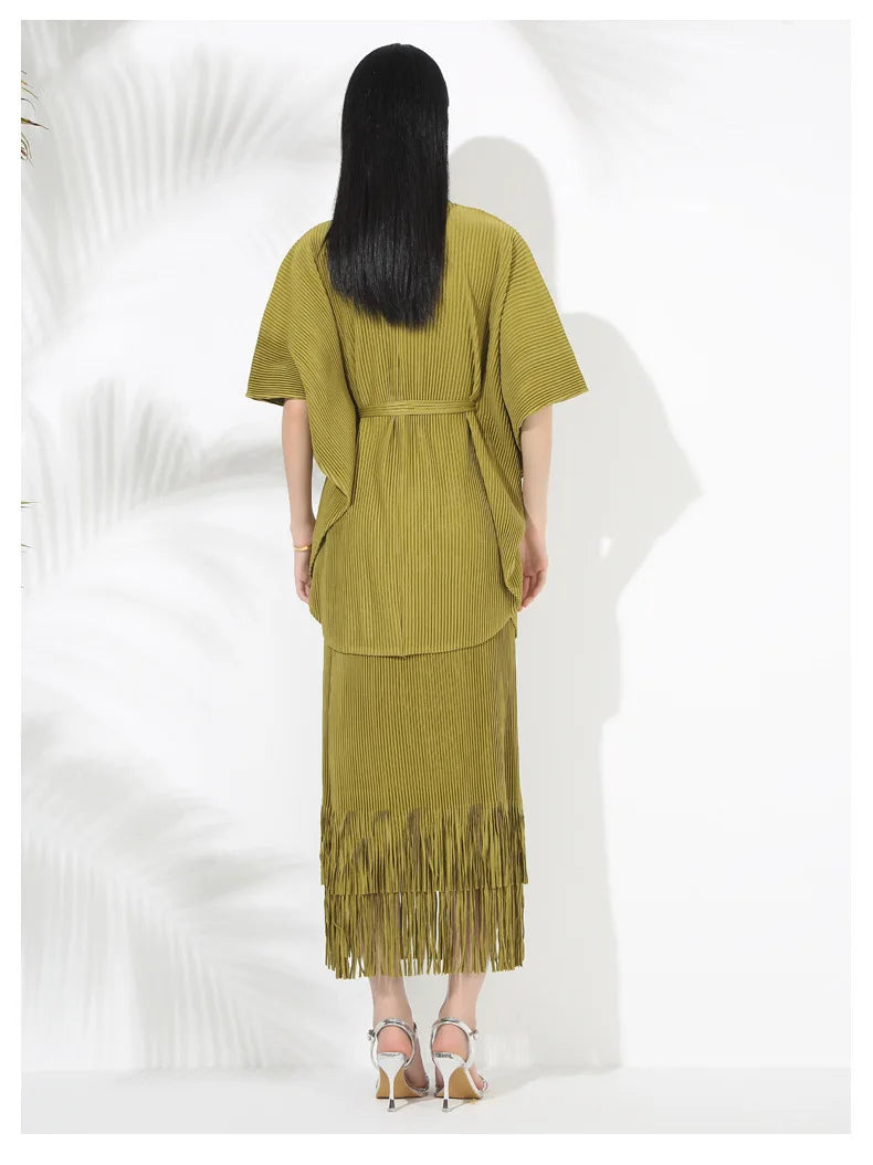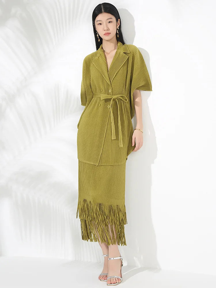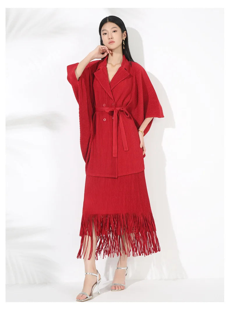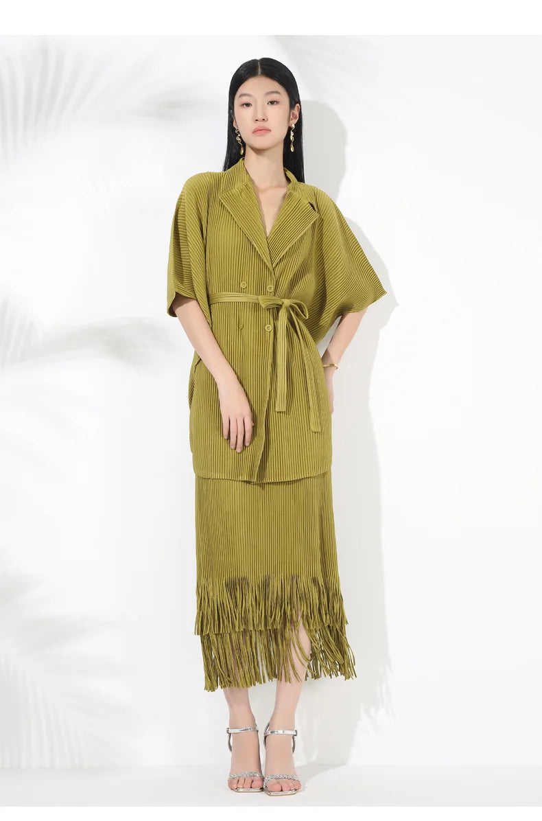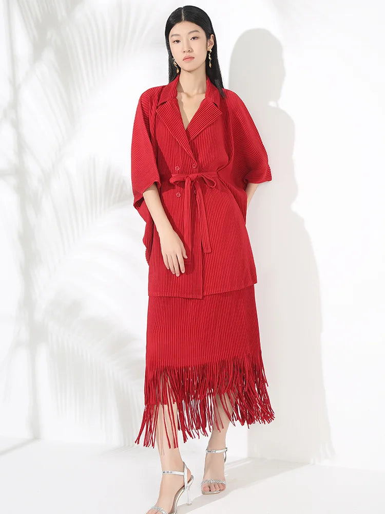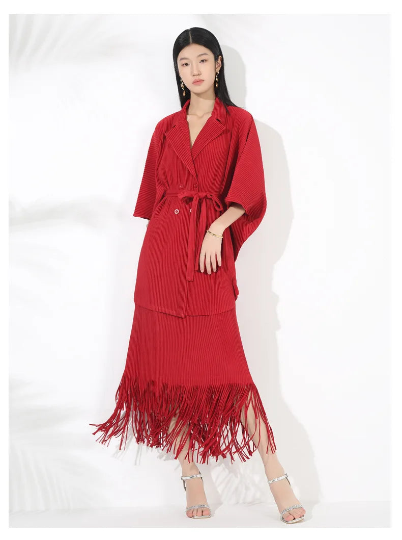 The Truly Pleated Couture Long Skirt Suit Set blends elegance and comfort with its sleek design. Featuring a tailored blazer and a flattering long skirt. this set is adorned with tassels for a touch of refinement.