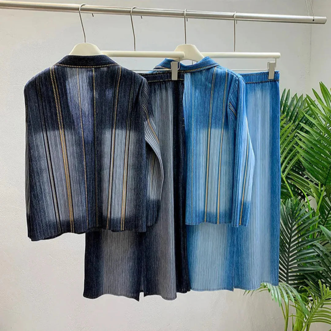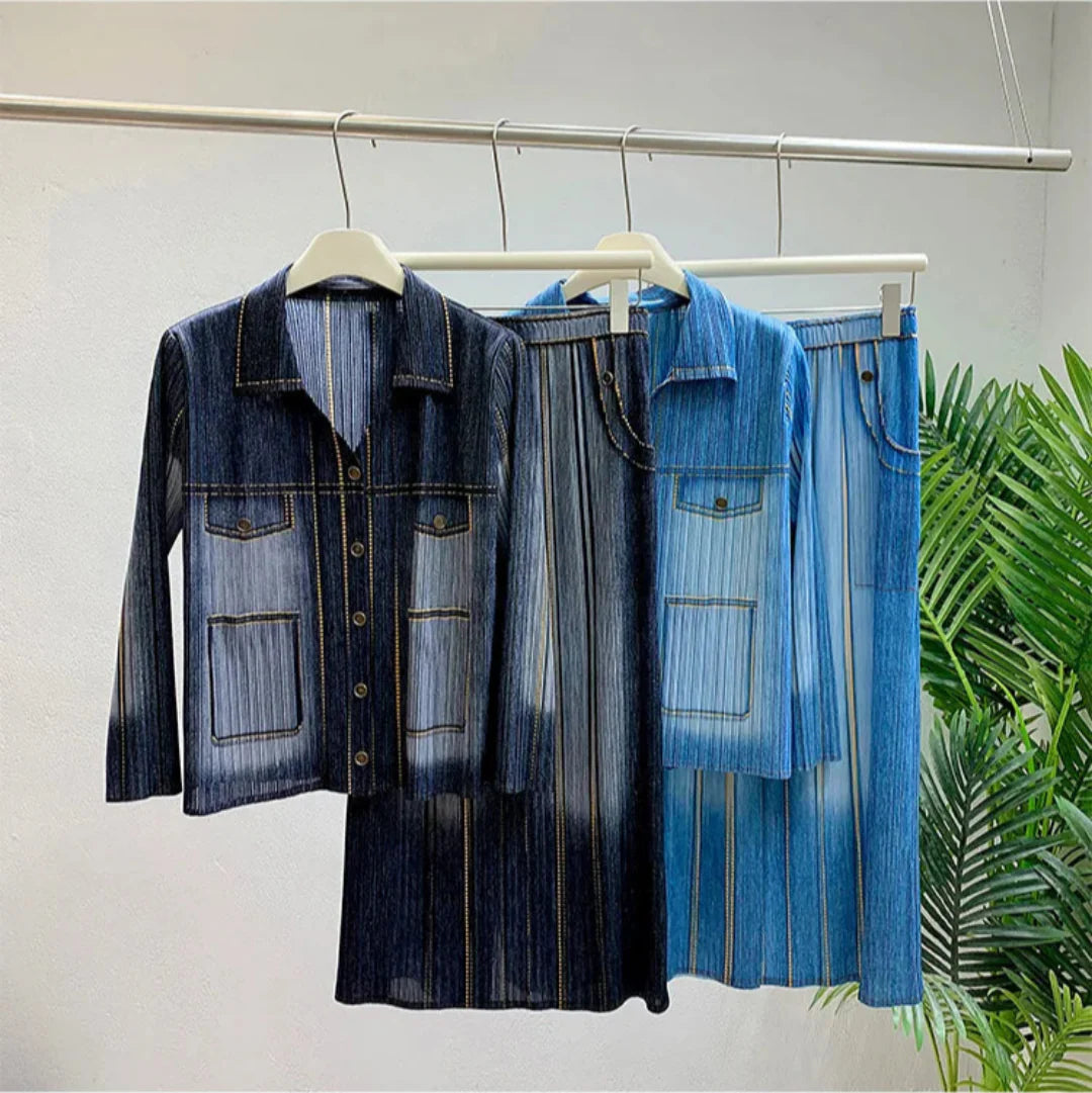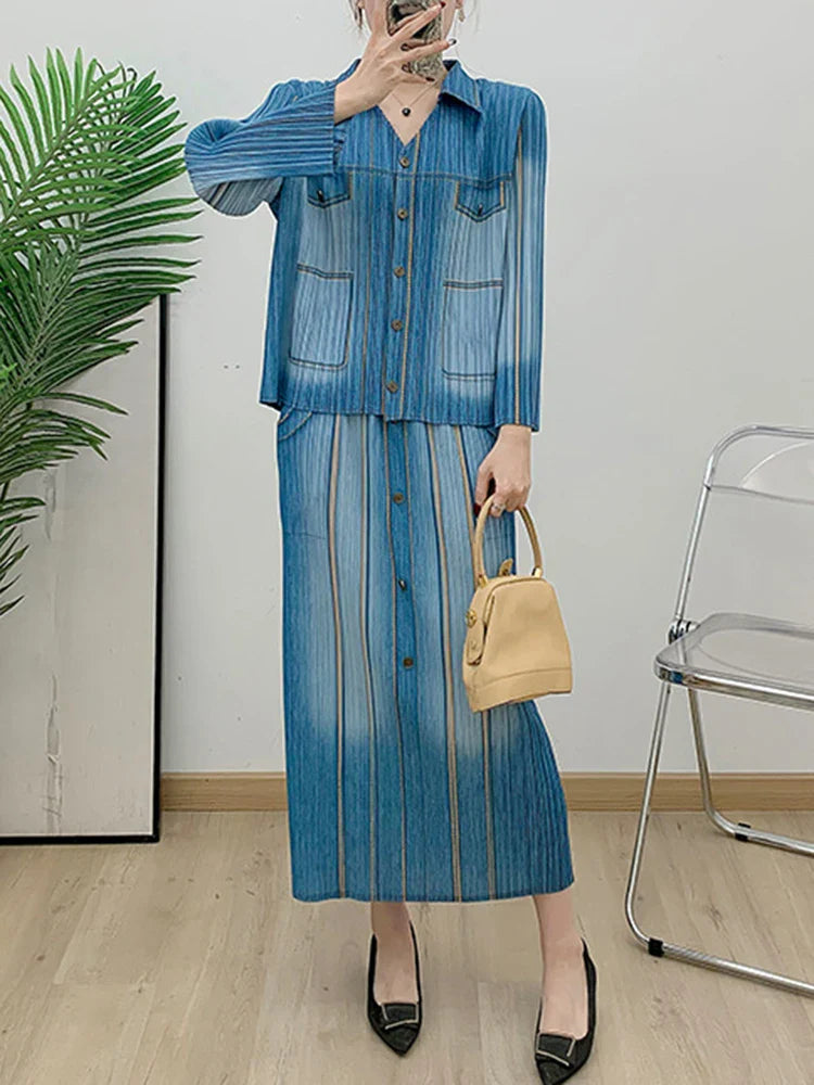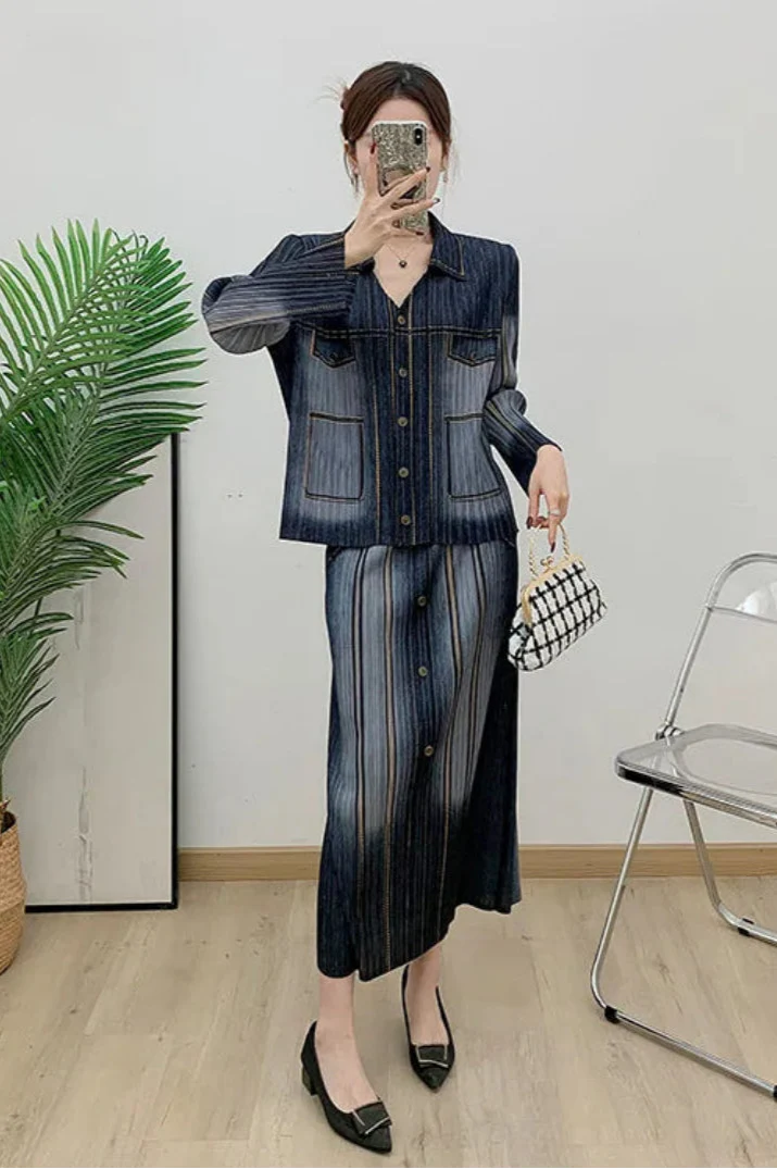This set includes a long sleeve top and a midi-length skirt. The design blends denim inspiration with the luxurious feel of genuine pleated fabric. The premium quality fabric offers comfort. while the elastic waistband skirt ensures a perfect fit.