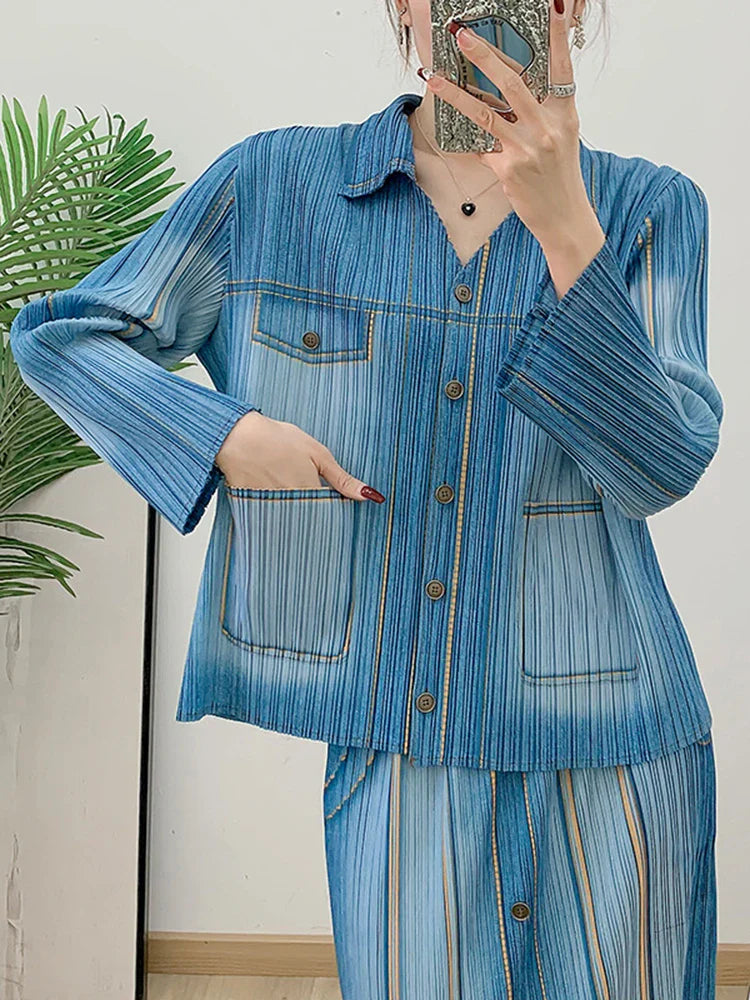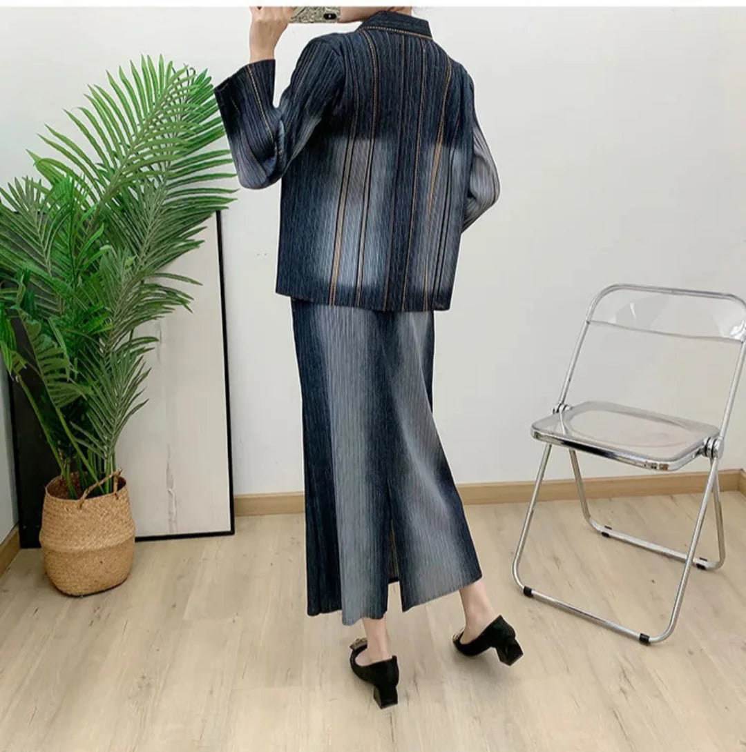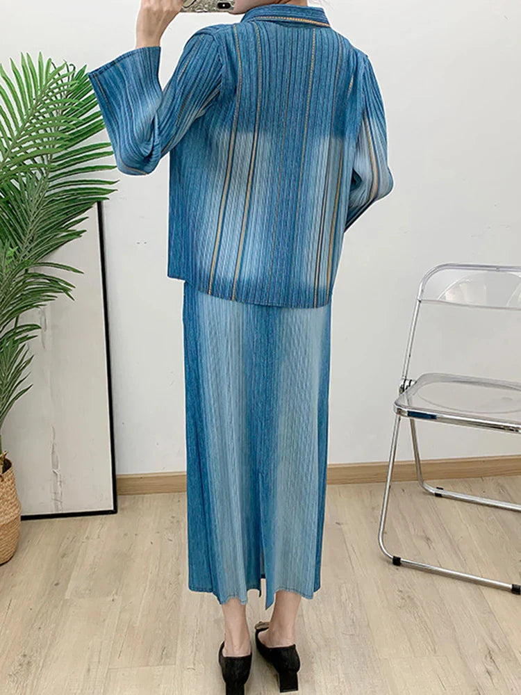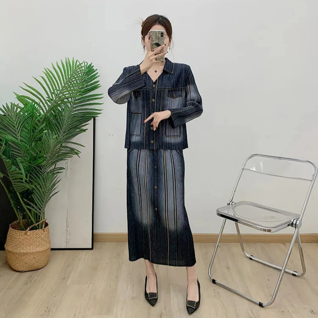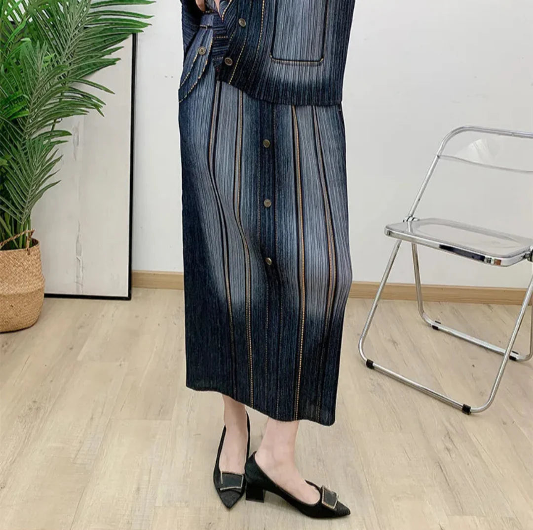 This set includes a long sleeve top and a midi-length skirt. The design blends denim inspiration with the luxurious feel of genuine pleated fabric. The premium quality fabric offers comfort. while the elastic waistband skirt ensures a perfect fit.