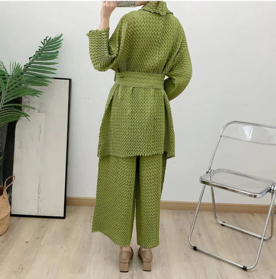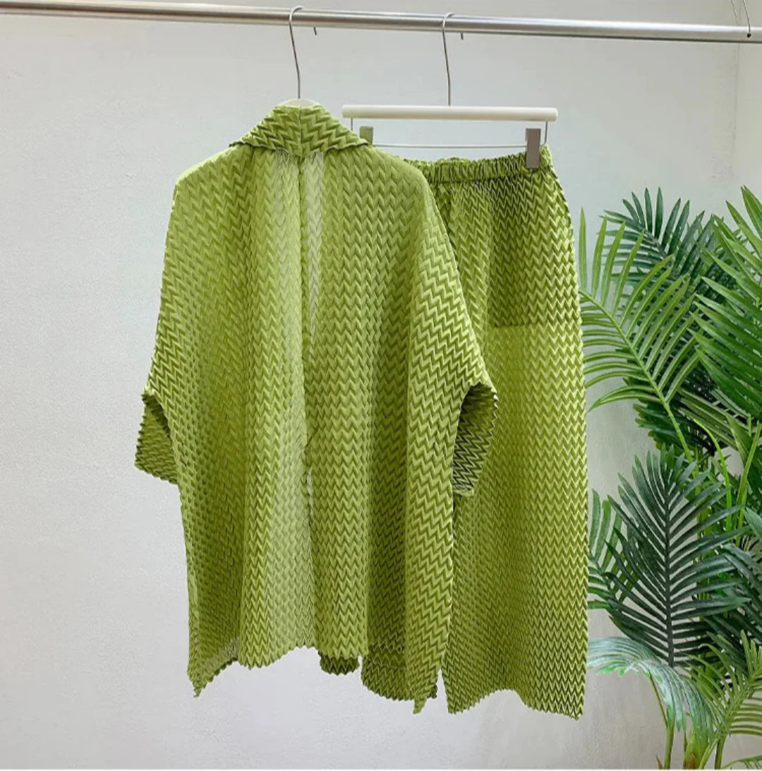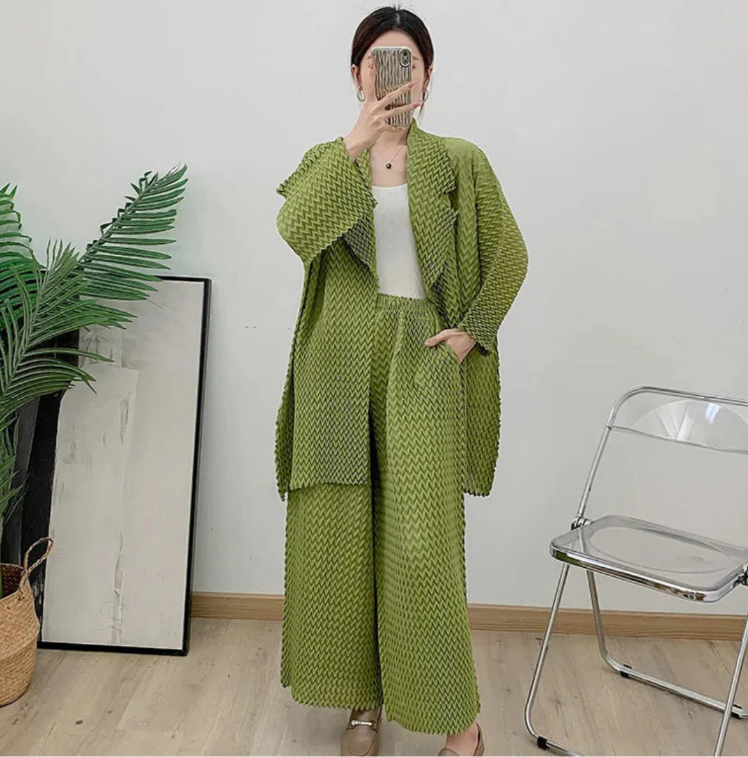 This green pleated set features a long. oversized cardigan paired with ankle-length wide-leg pants. Crafted from genuine pleated fabric. it offers both comfort and elegance.