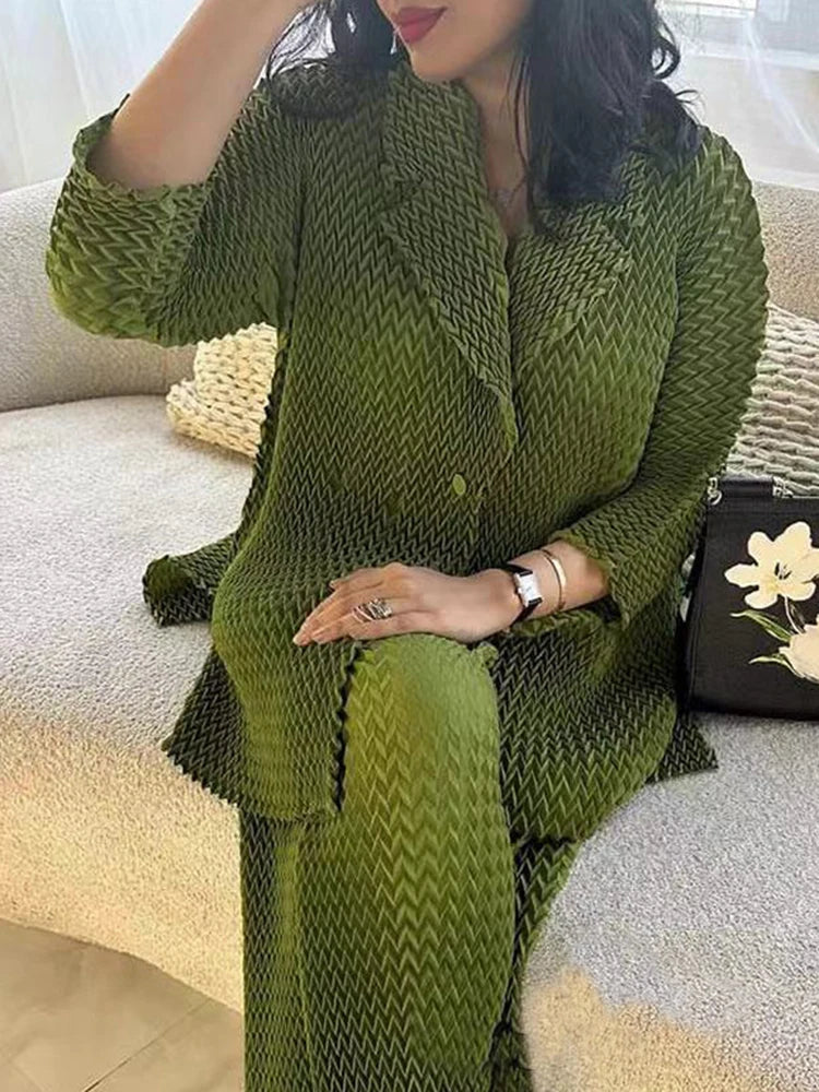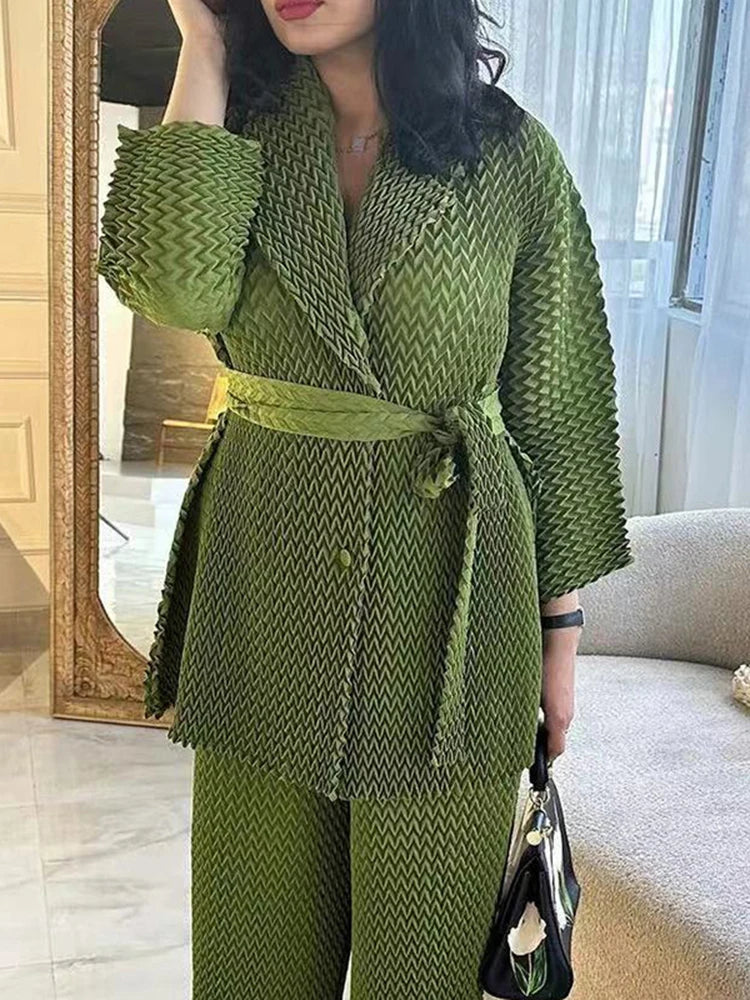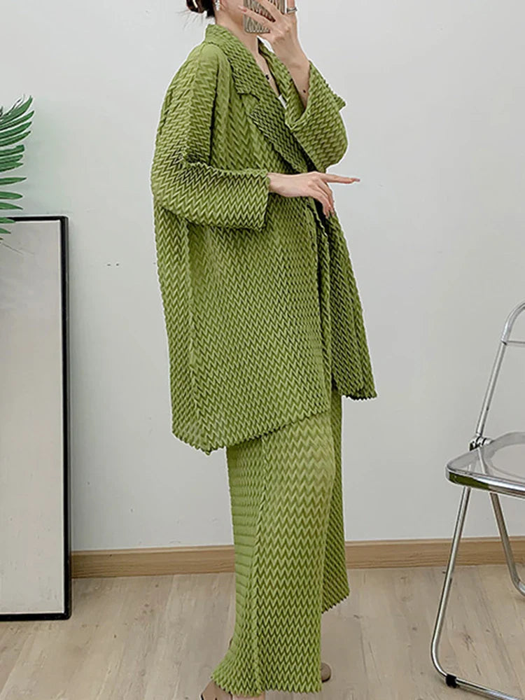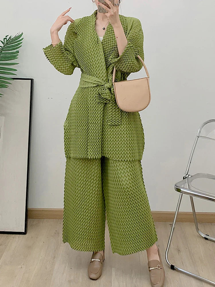 This green pleated set features a long. oversized cardigan paired with ankle-length wide-leg pants. Crafted from genuine pleated fabric. it offers both comfort and elegance.