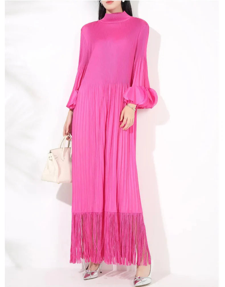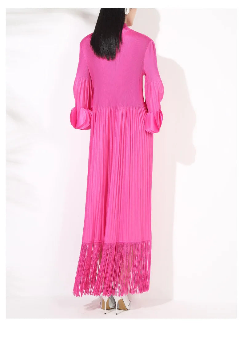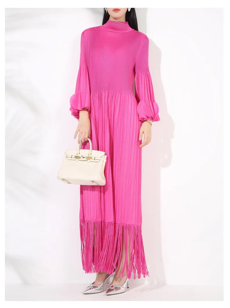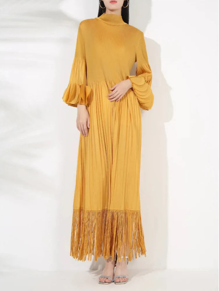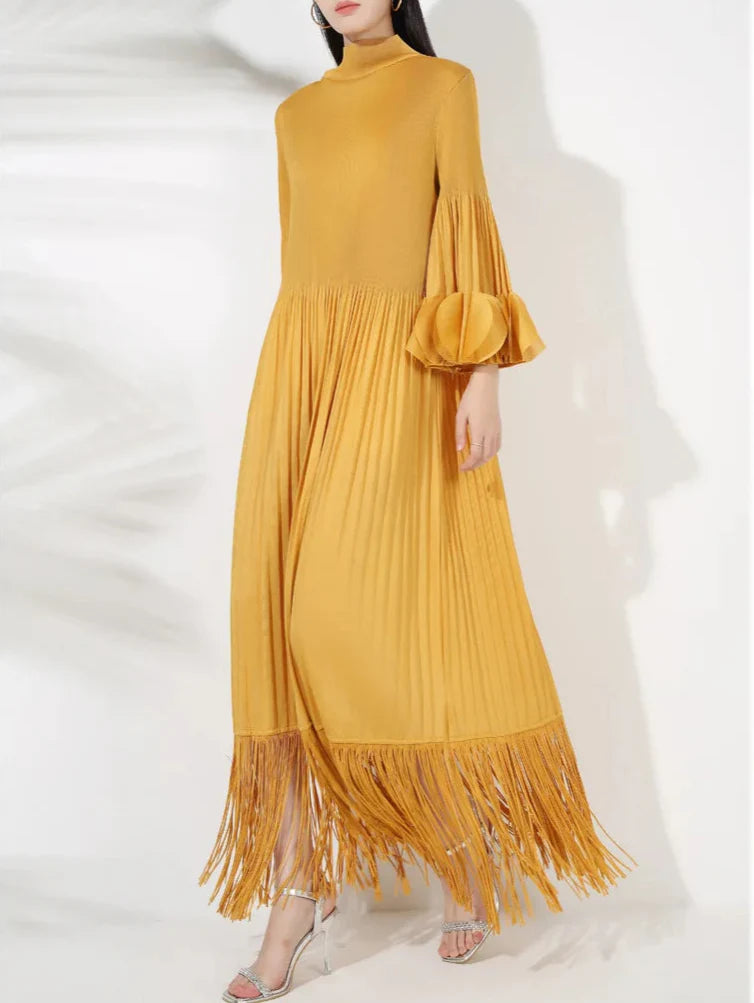 The Truly Pleated Oversized Sleeve Midi Dress combines elegance and luxury. Crafted from genuine pleated fabric. it features tassels at the hem for a unique touch.