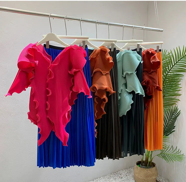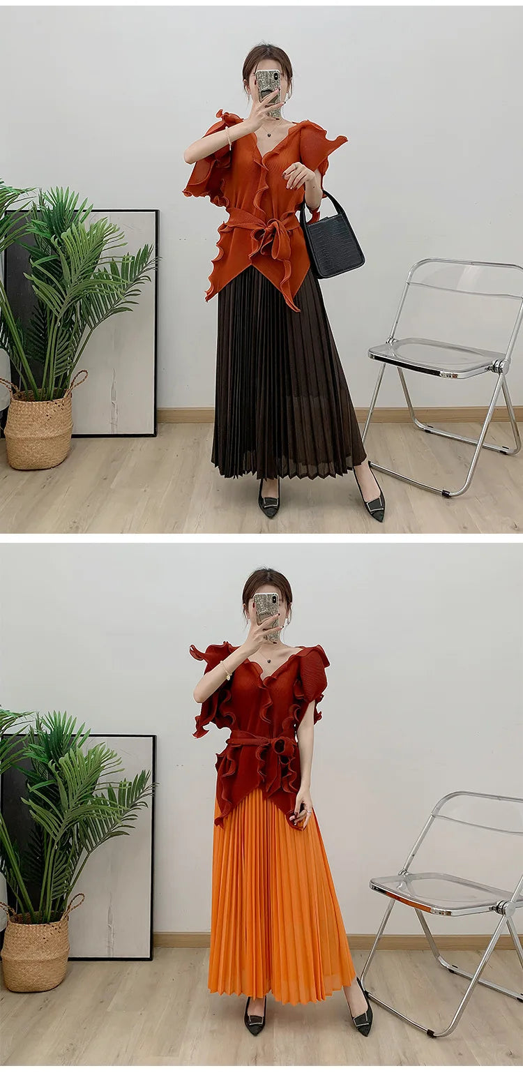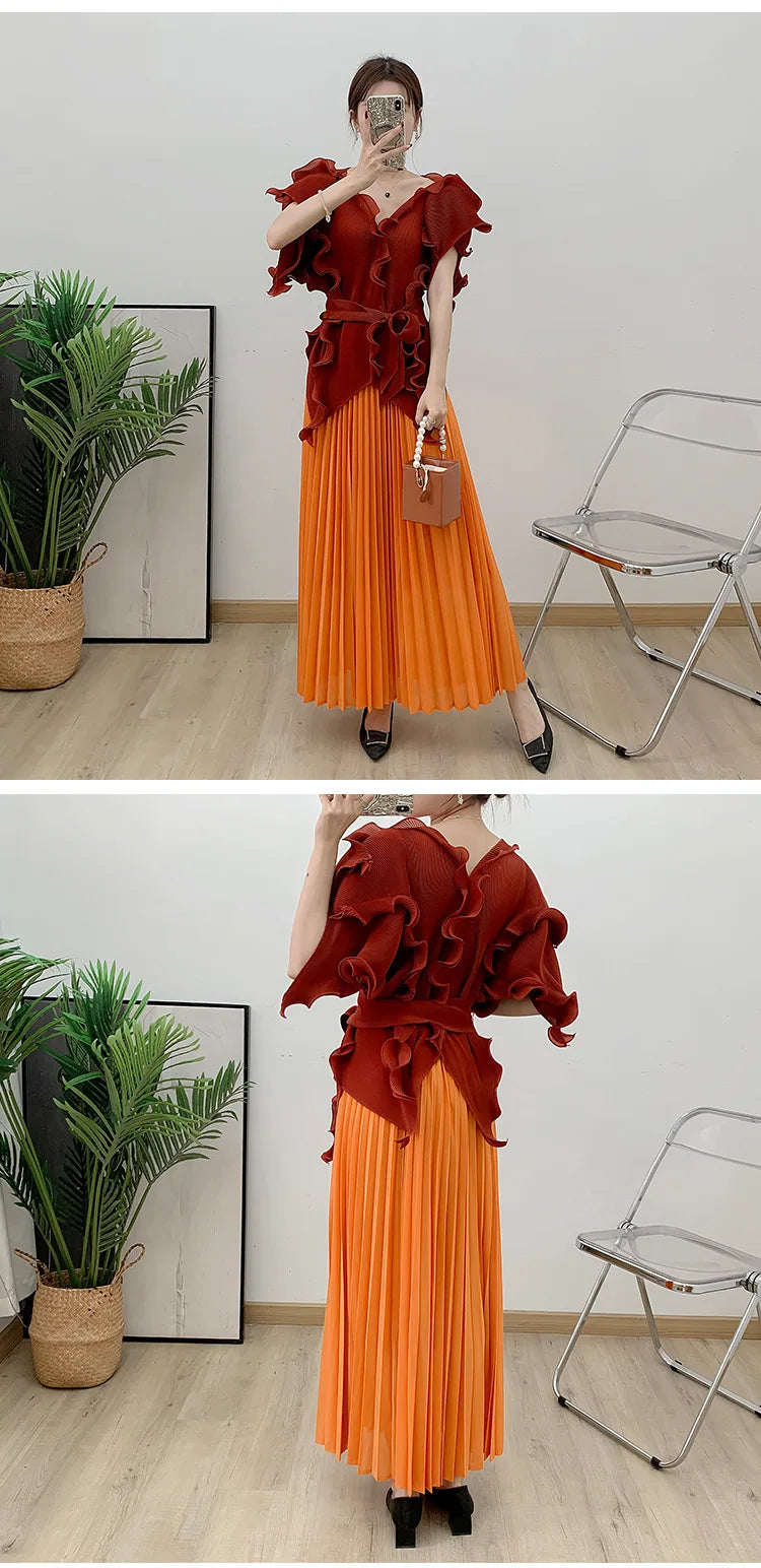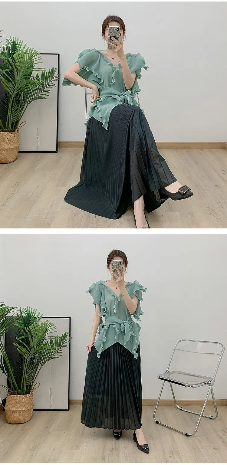 A wardrobe essential. this pleated set blends effortless elegance with luxurious comfort. The avant-garde short sleeve top flows gracefully. while the genuine pleated maxi skirt. with an elastic waistband. offers both style and ease.