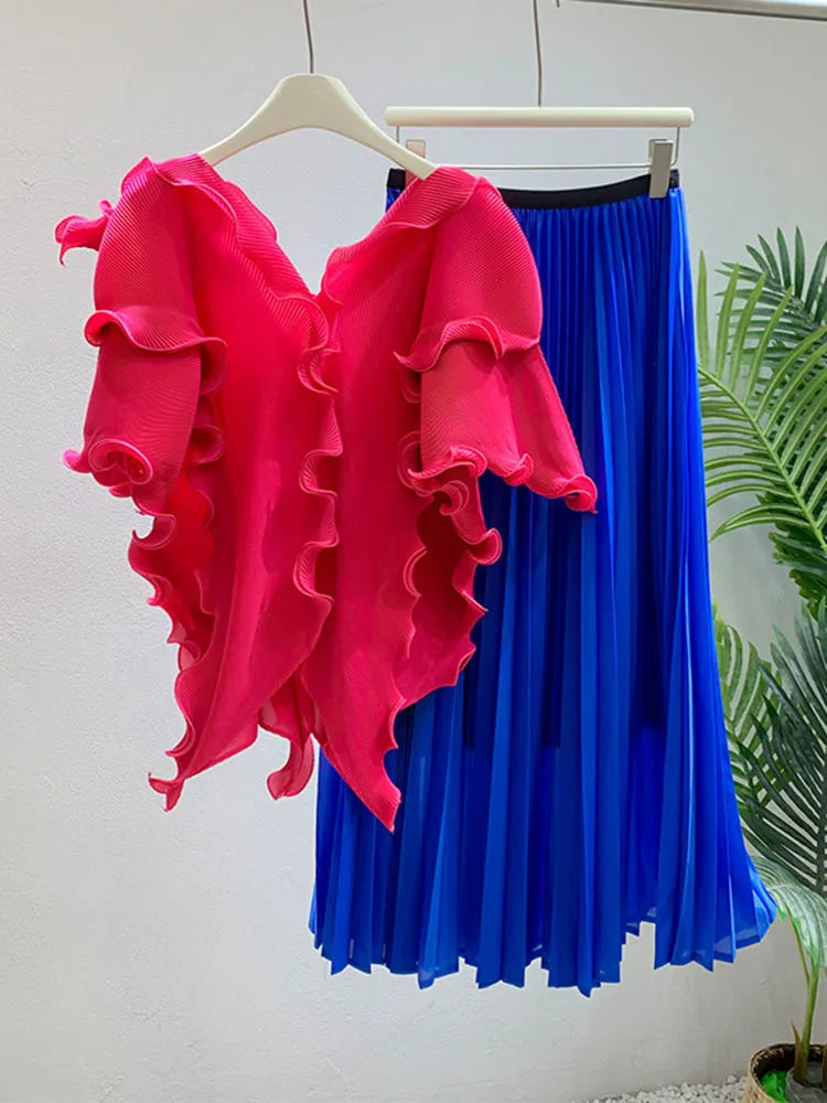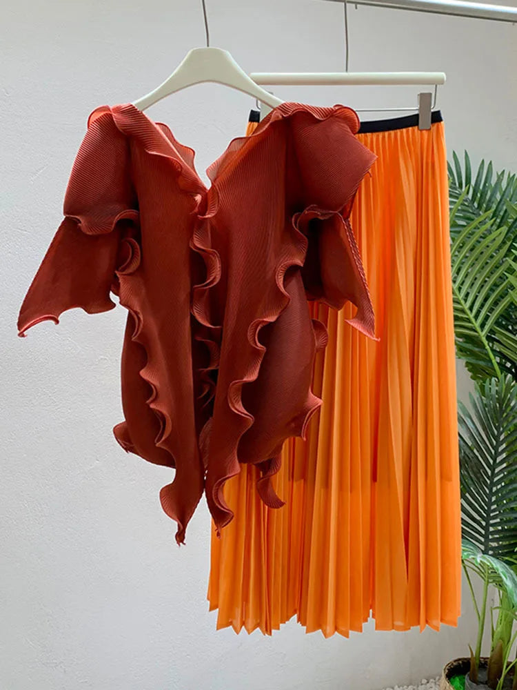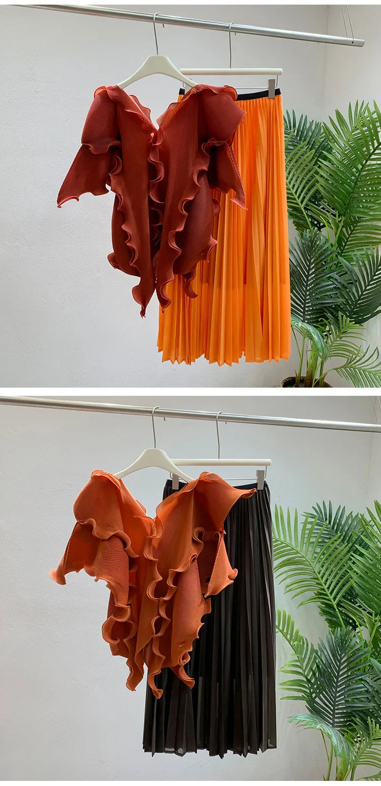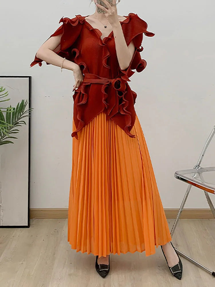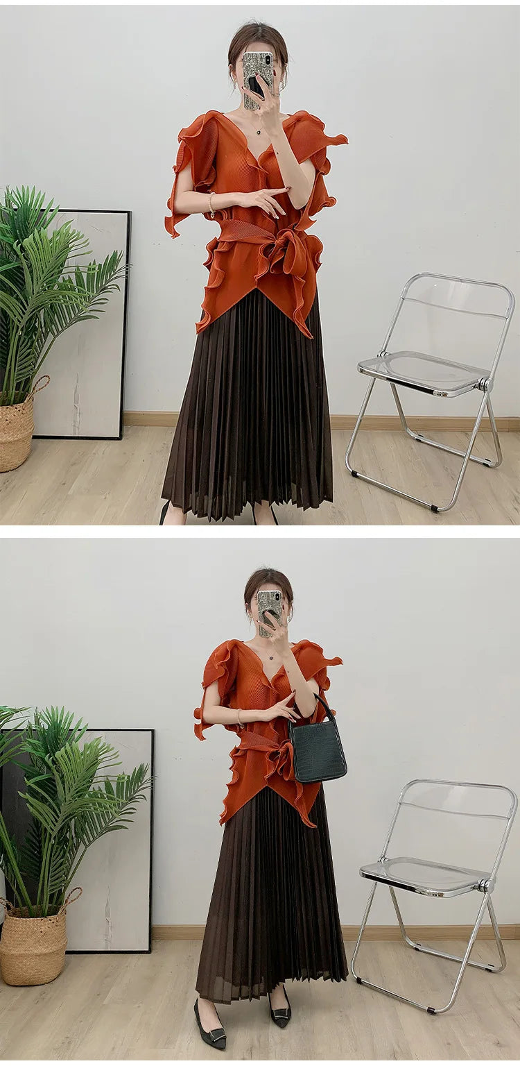 A wardrobe essential. this pleated set blends effortless elegance with luxurious comfort. The avant-garde short sleeve top flows gracefully. while the genuine pleated maxi skirt. with an elastic waistband. offers both style and ease.