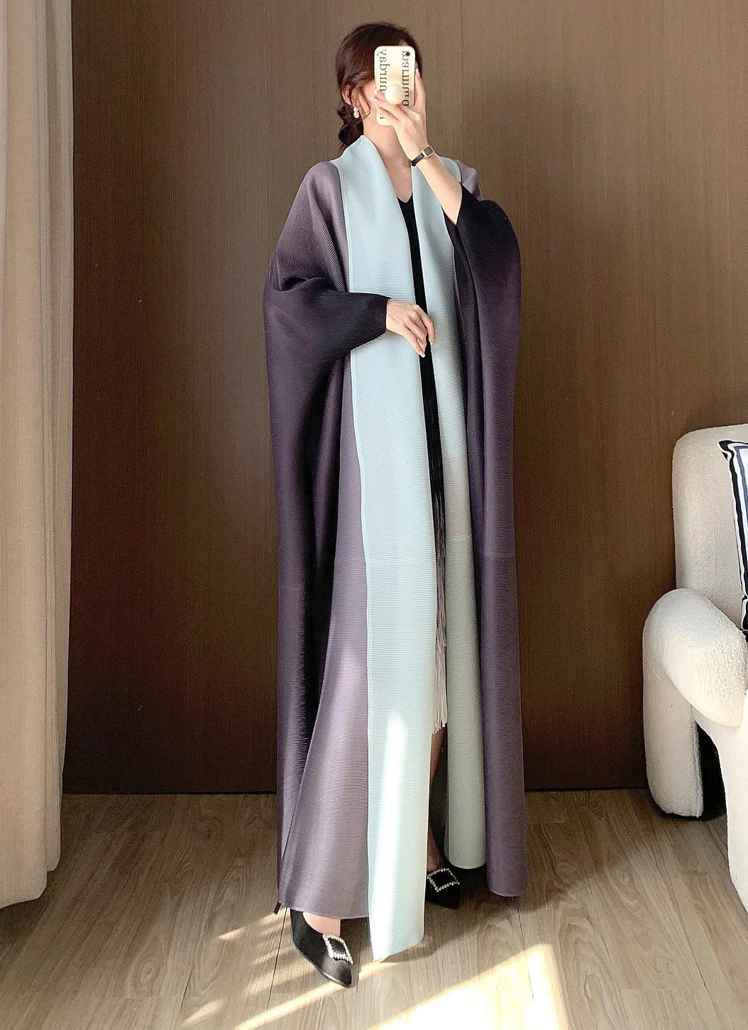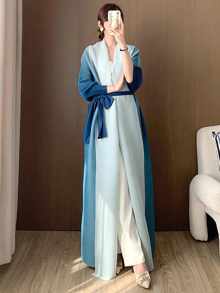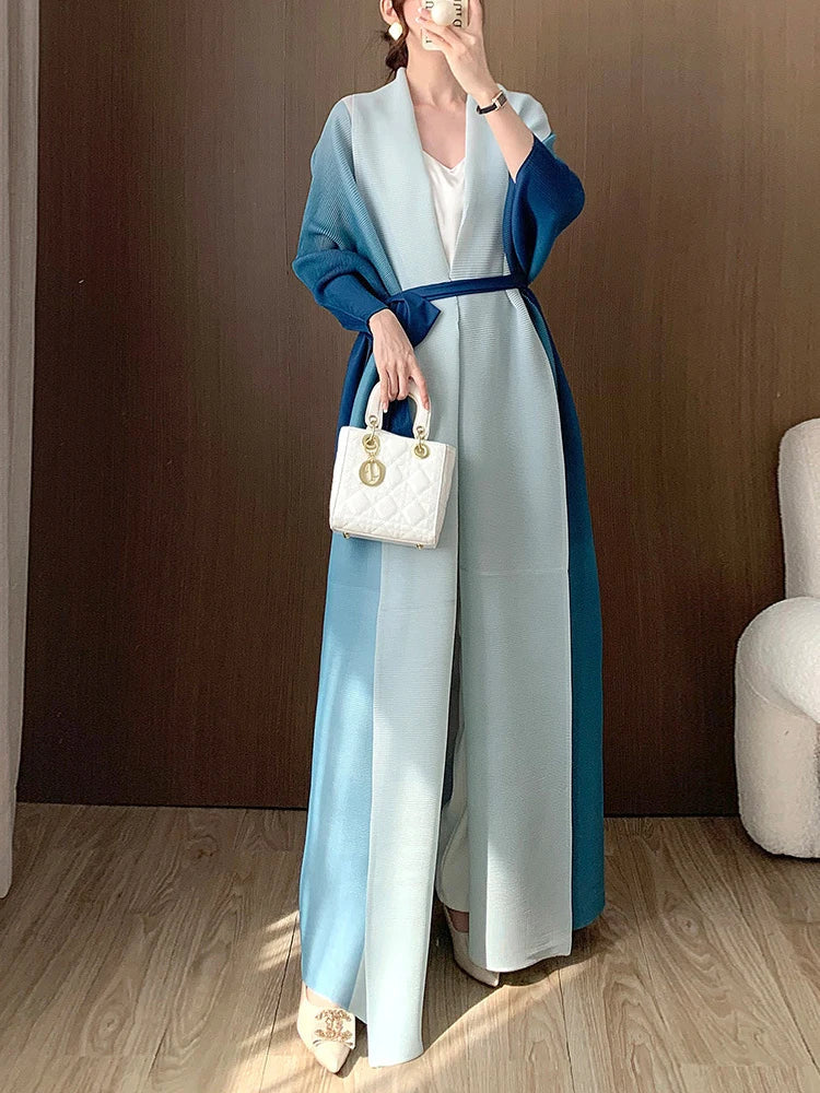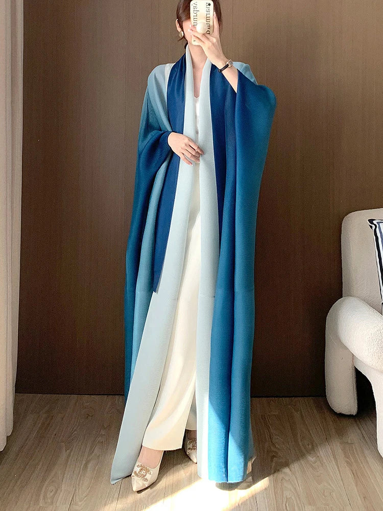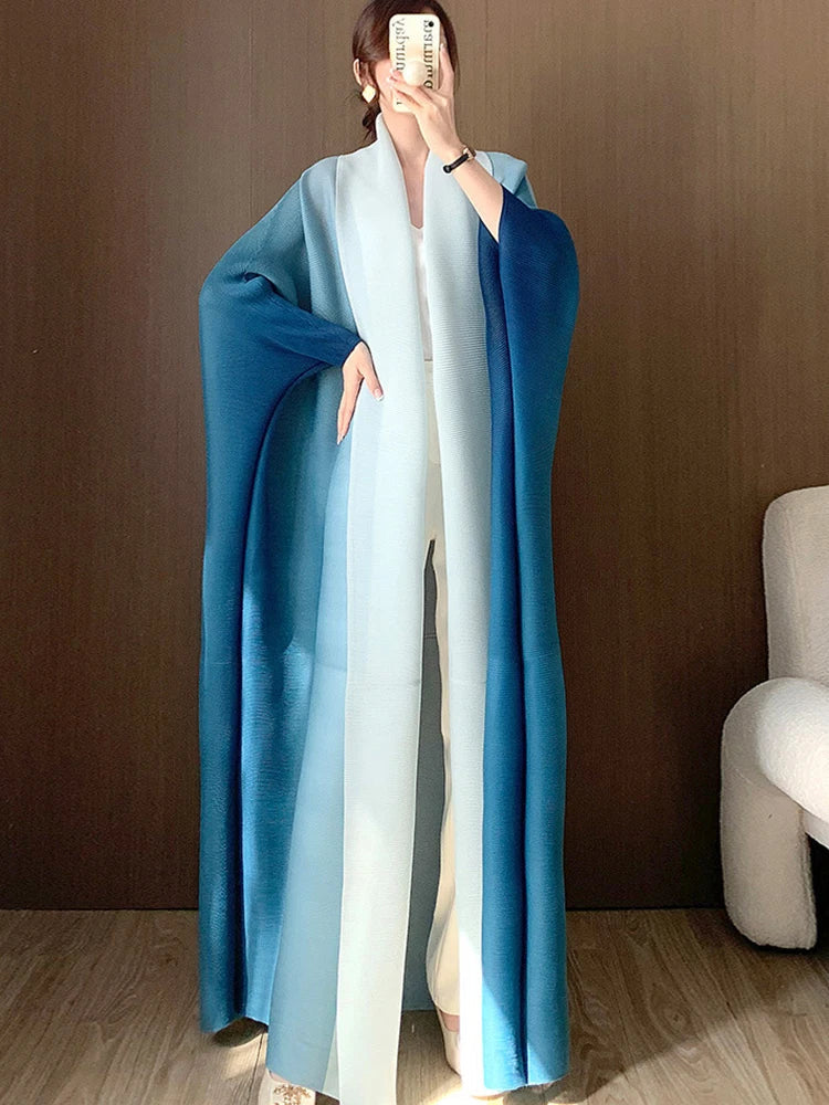 A statement piece. this luxurious trench coat features a unique gradient color design. long batwing sleeves. and an oversized fit. The plissé pleats add texture and dimension. creating a sophisticated look that's both elegant and comfortable for any occasion.
