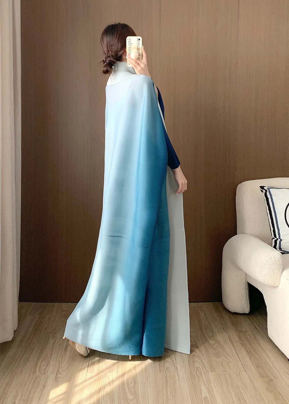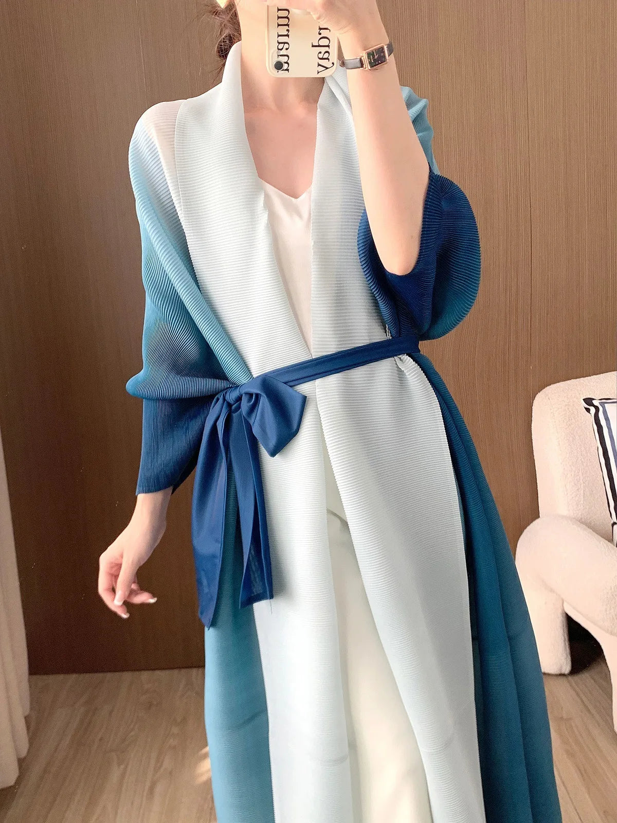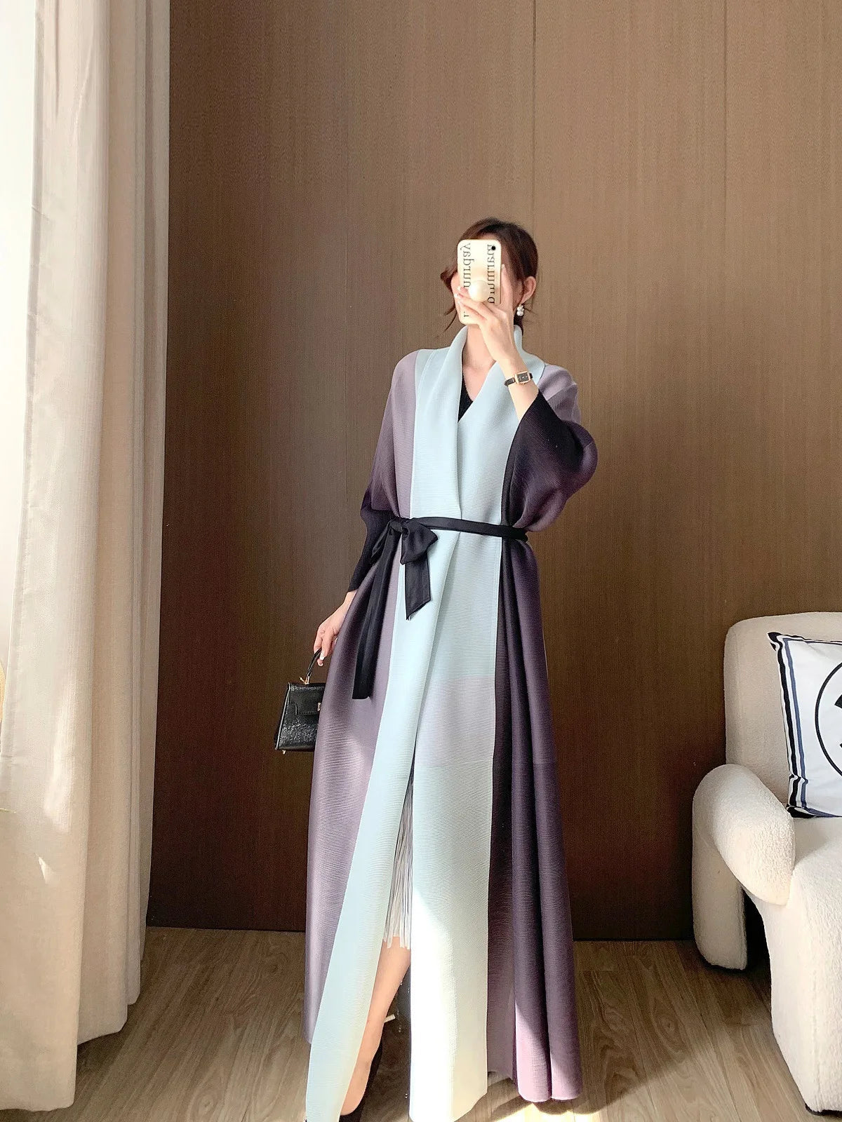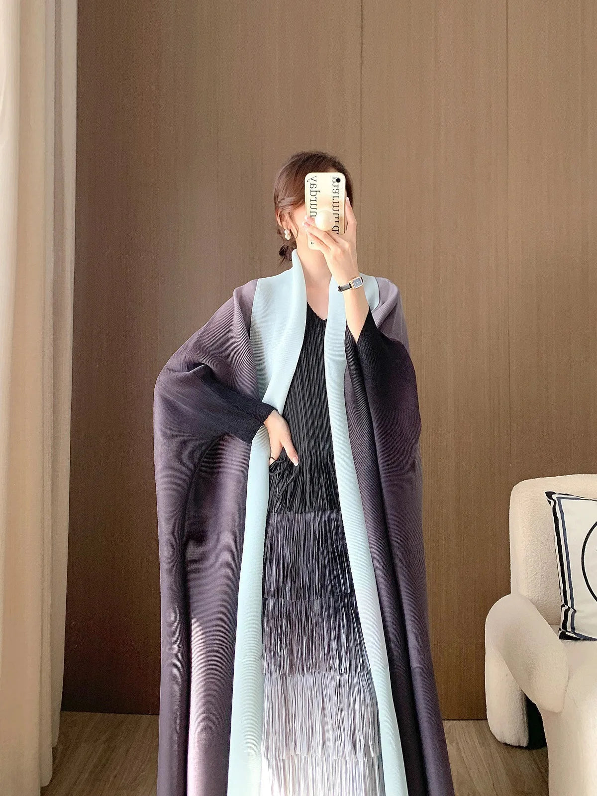 A statement piece. this luxurious trench coat features a unique gradient color design. long batwing sleeves. and an oversized fit. The plissé pleats add texture and dimension. creating a sophisticated look that's both elegant and comfortable for any occasion.
