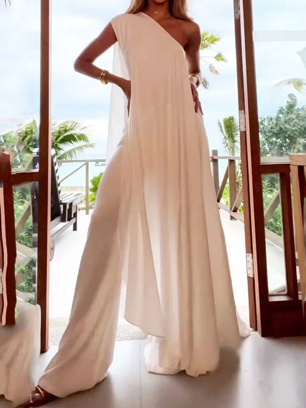 Wide Leg Asymmetric Solid Color One-Shoulder Jumpsuits