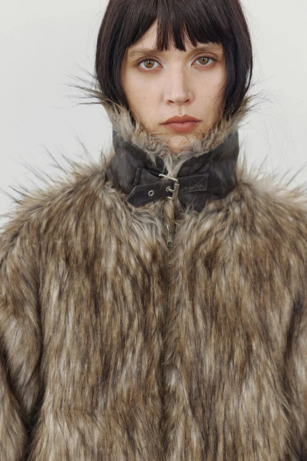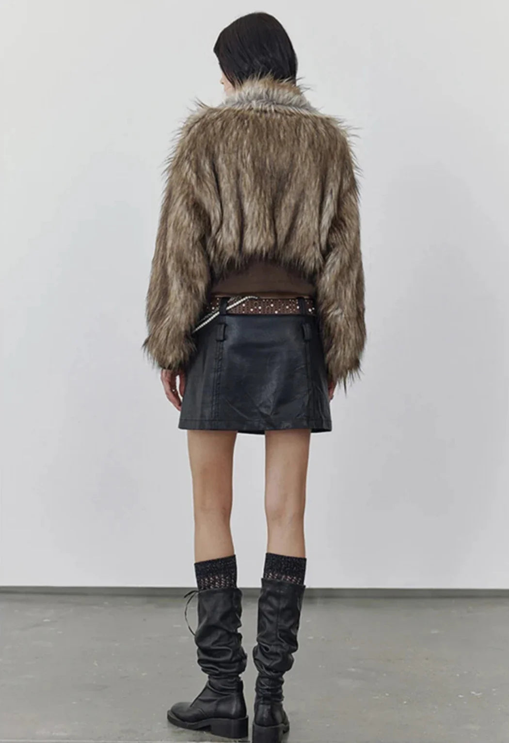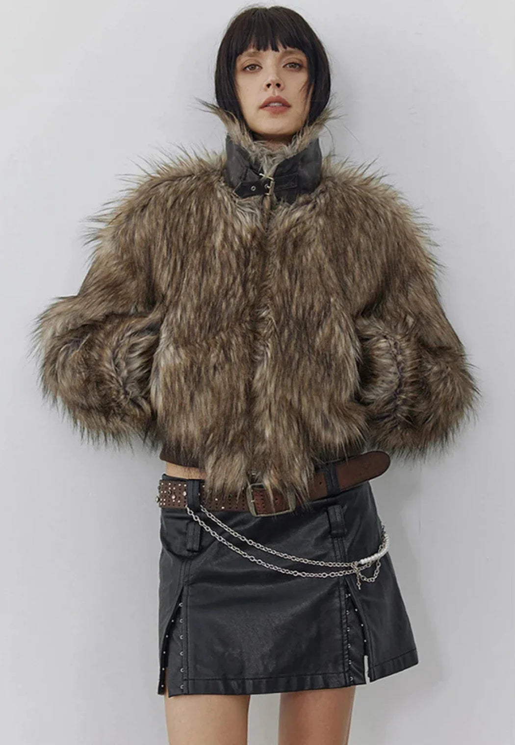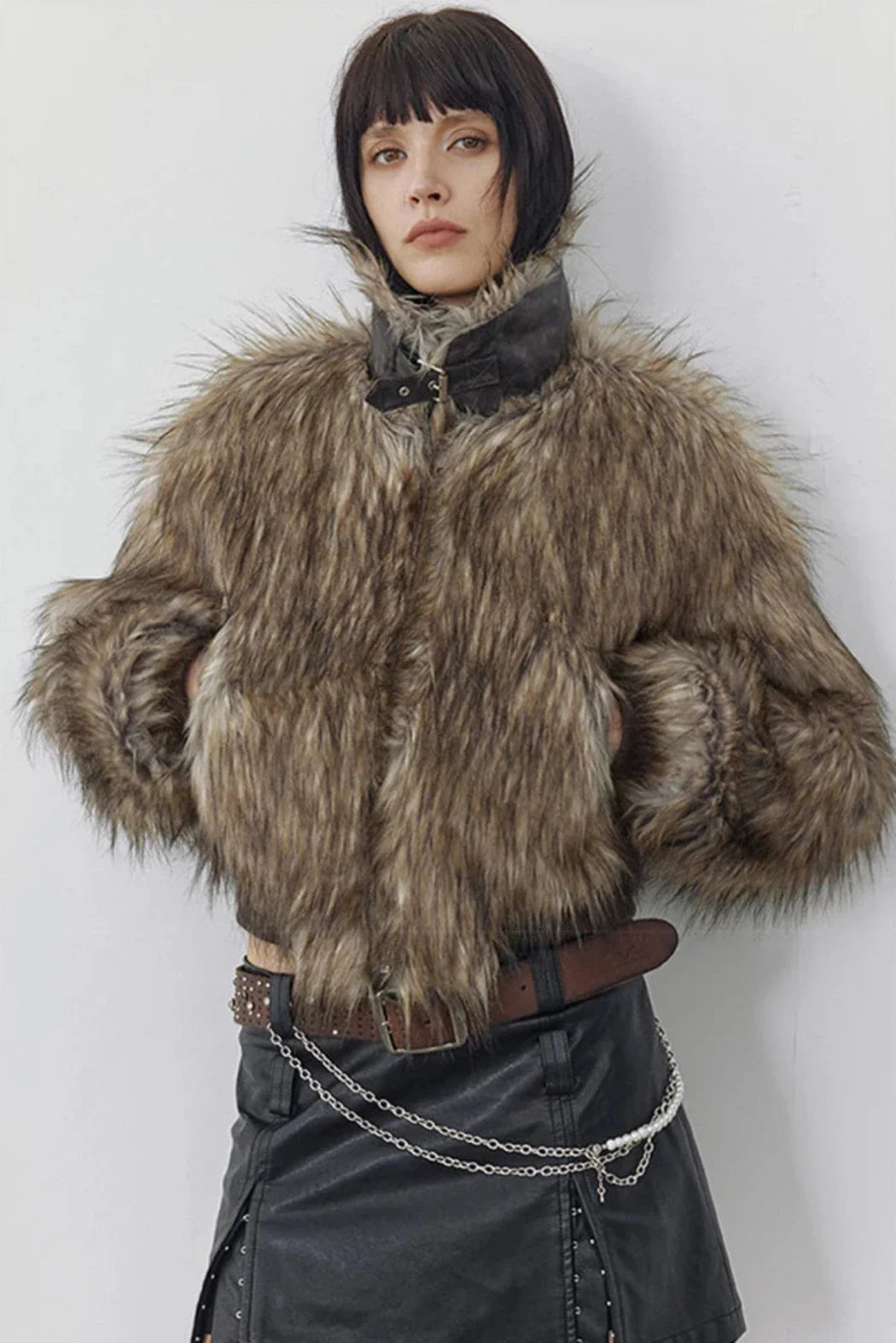Indulge in luxury with this brown shaggy faux fur cropped jacket. Featuring long. soft faux fur and an oversized fit. it combines warmth and style with a touch of elegance for any occasion.
