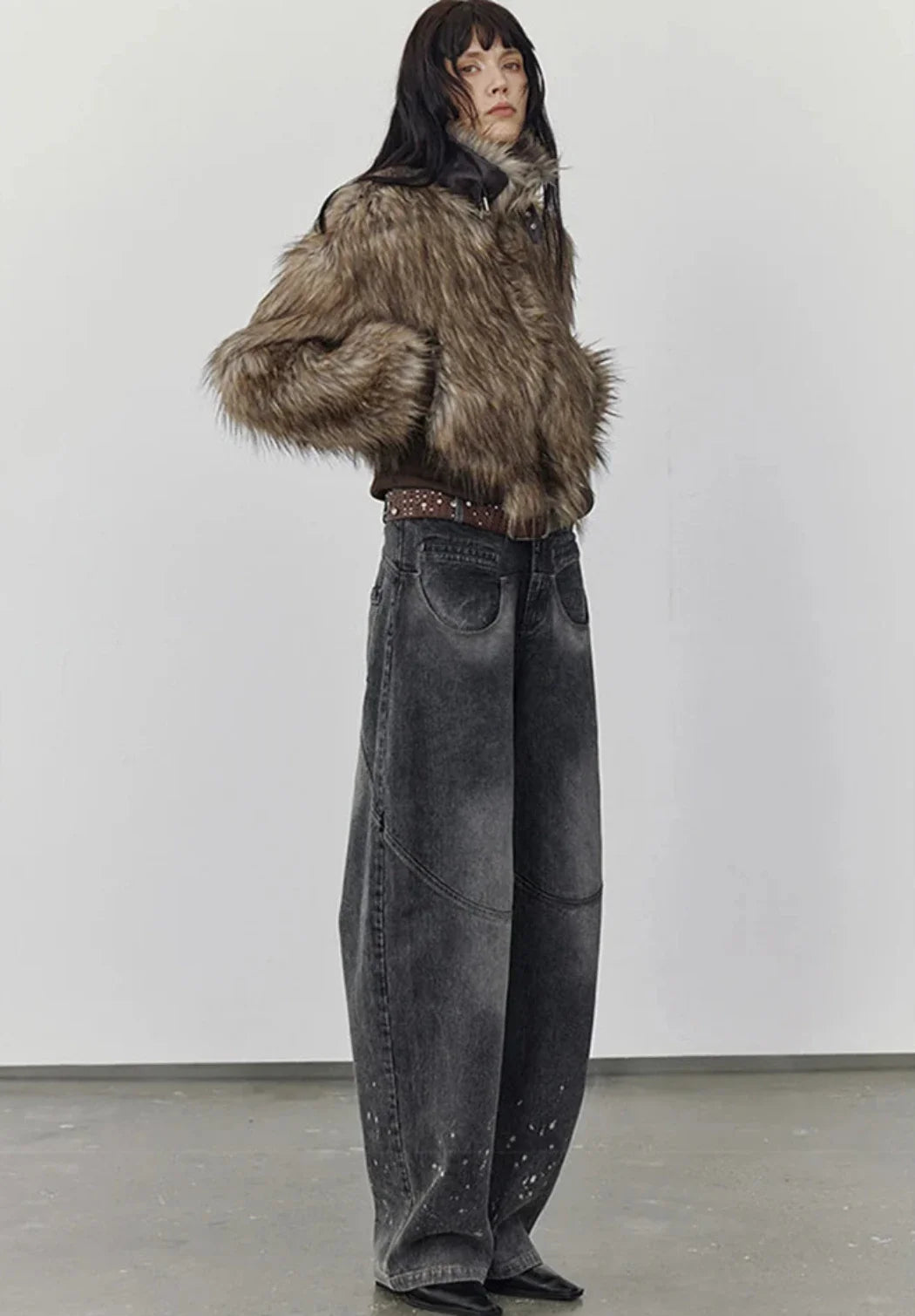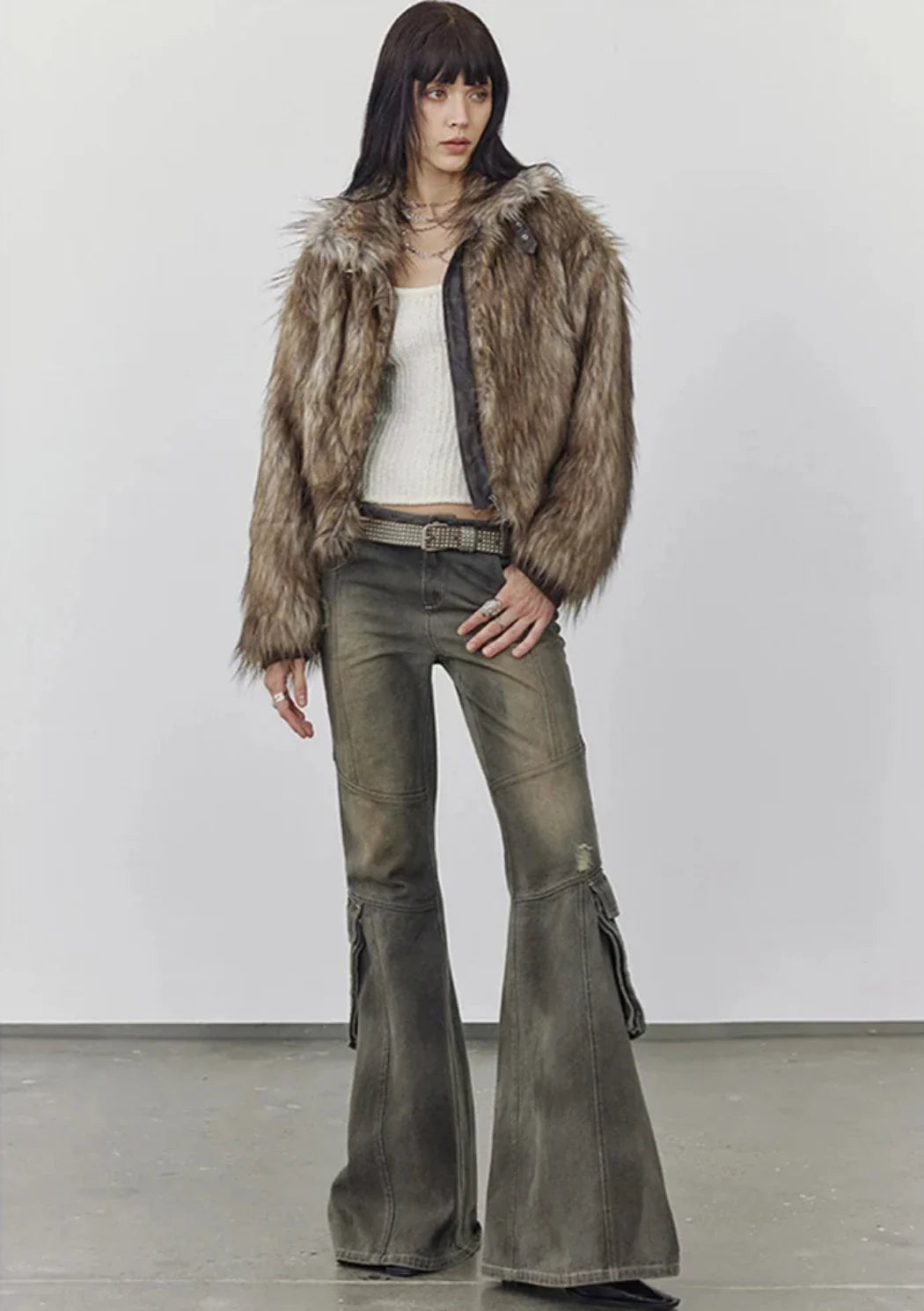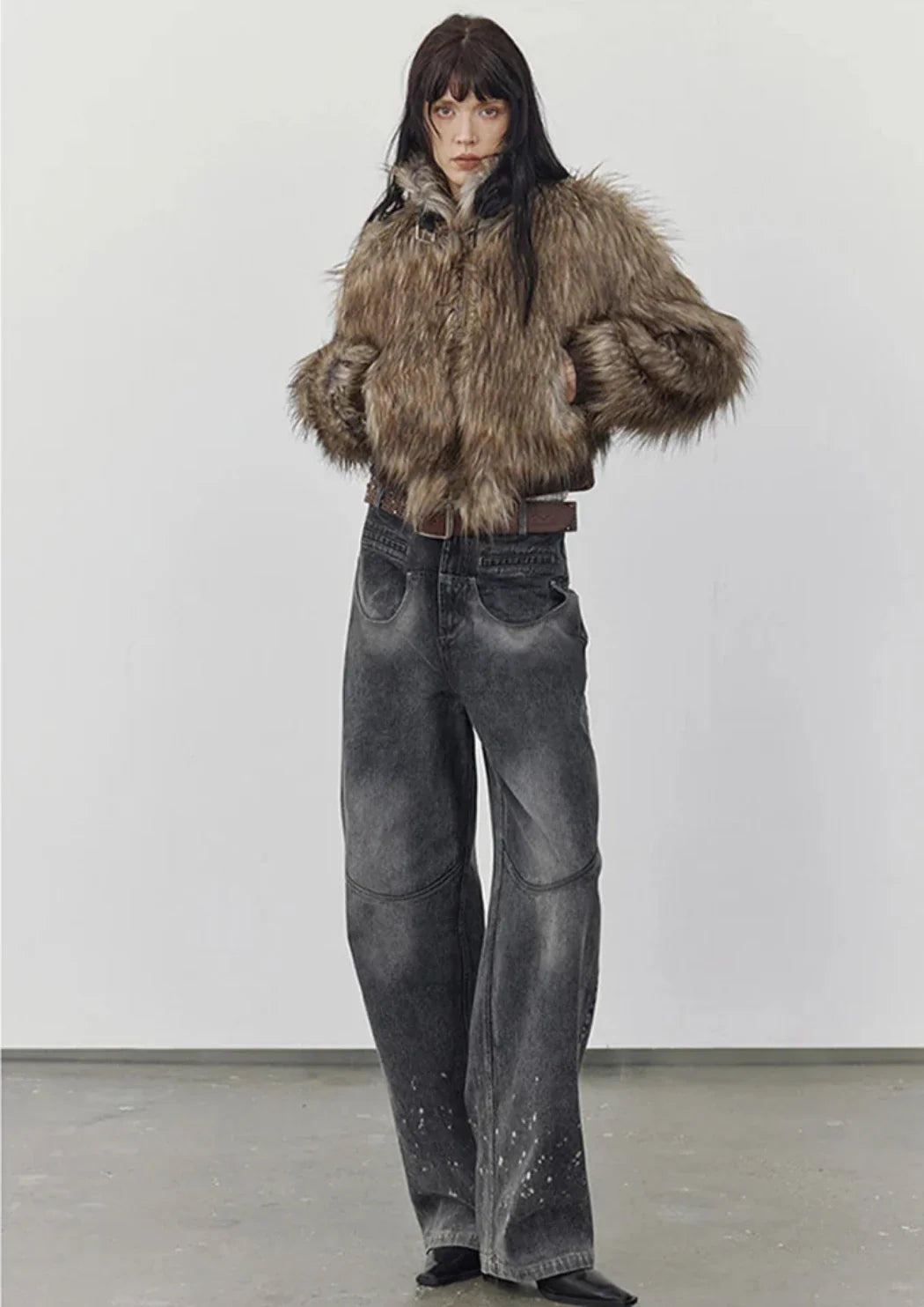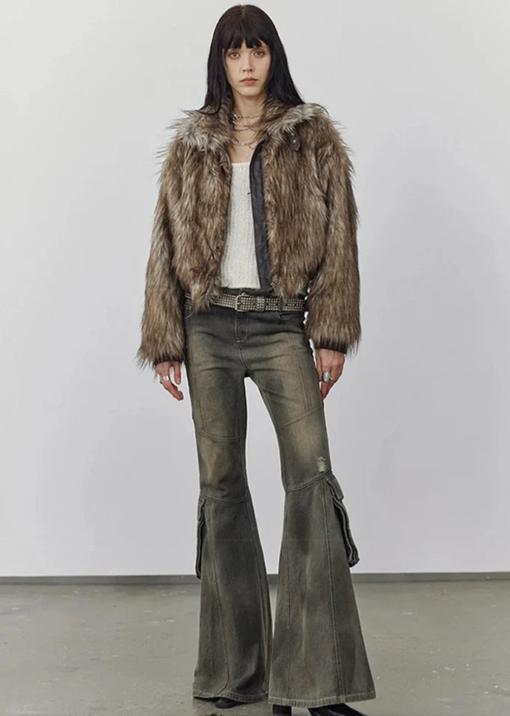 Indulge in luxury with this brown shaggy faux fur cropped jacket. Featuring long. soft faux fur and an oversized fit. it combines warmth and style with a touch of elegance for any occasion.