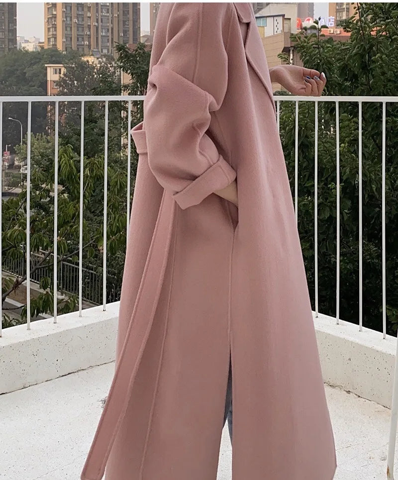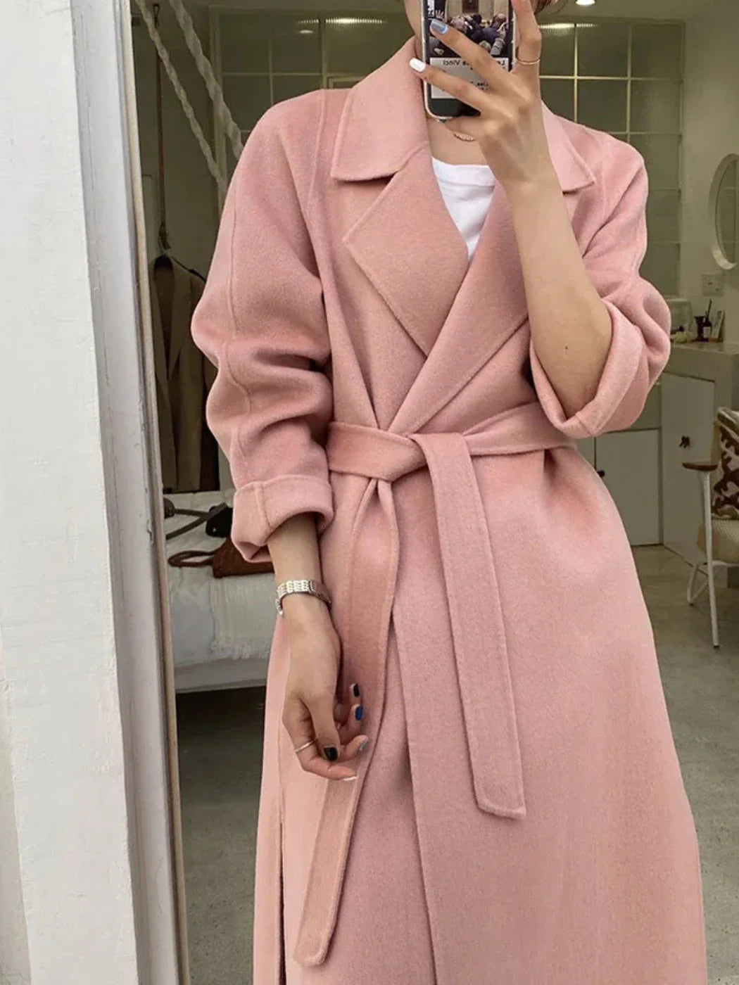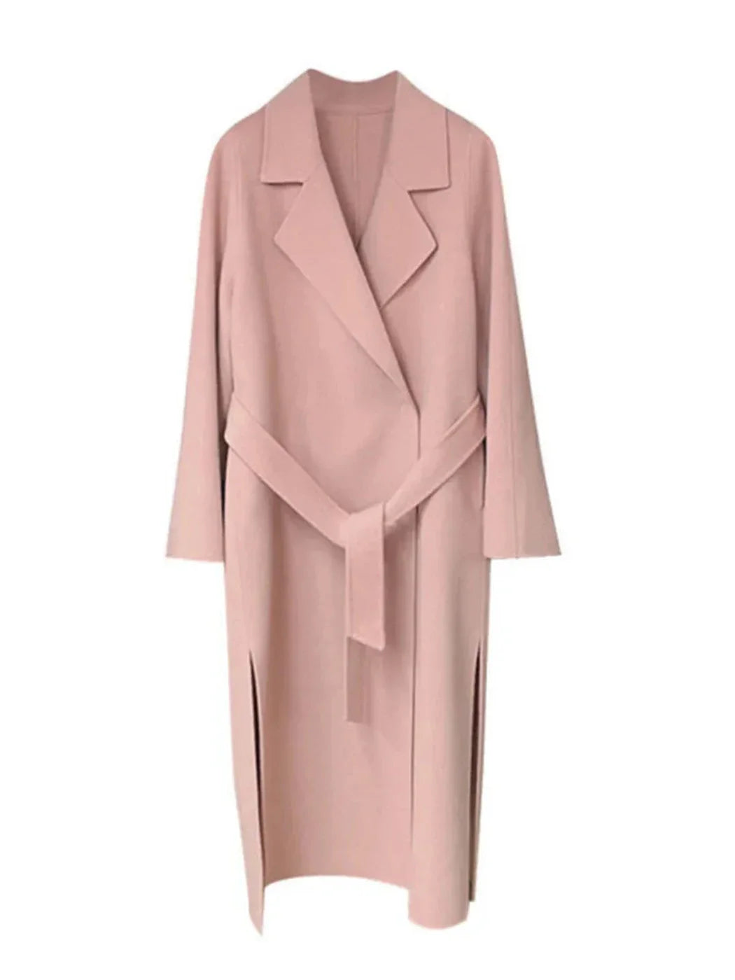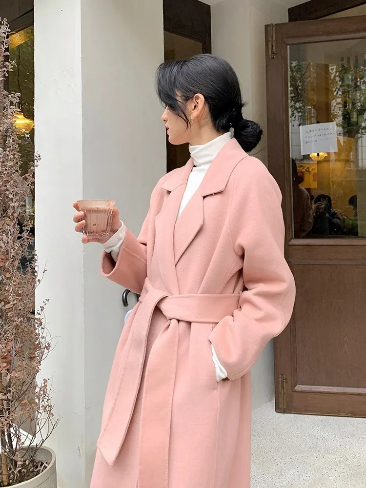 Embrace elegance with this double-faced cashmere coat in a soft pink hue.