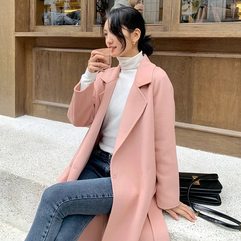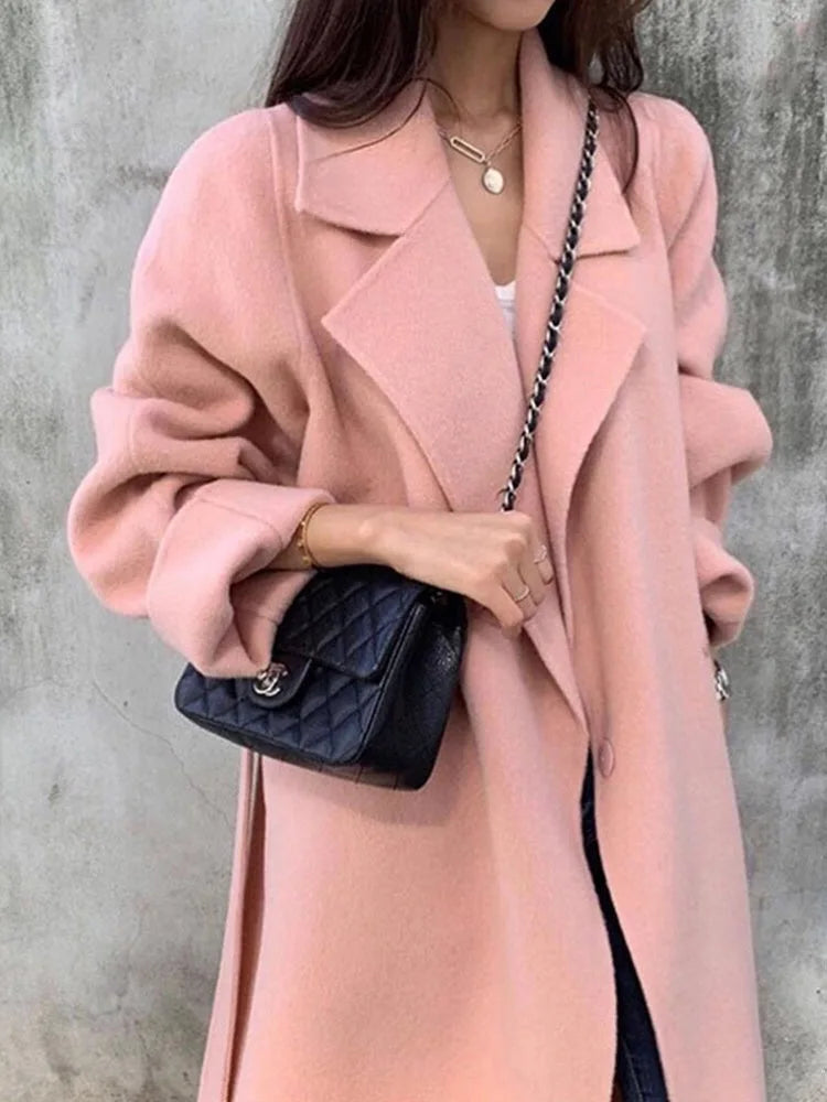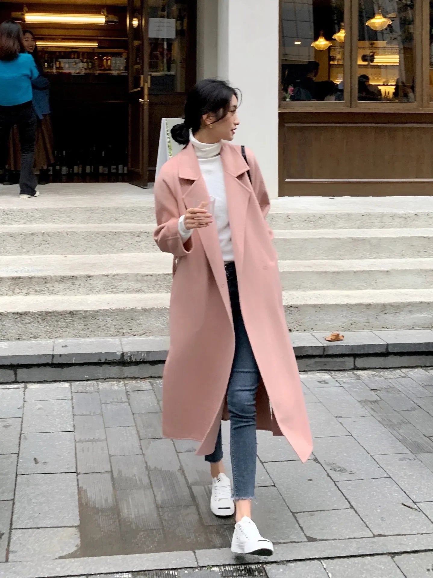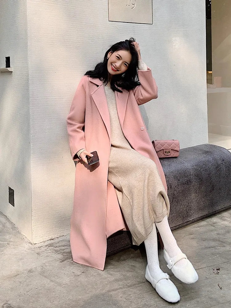 Embrace elegance with this double-faced cashmere coat in a soft pink hue.