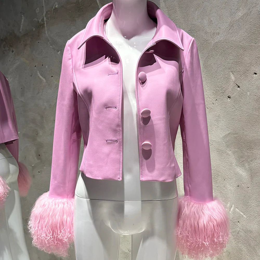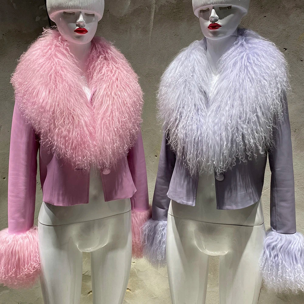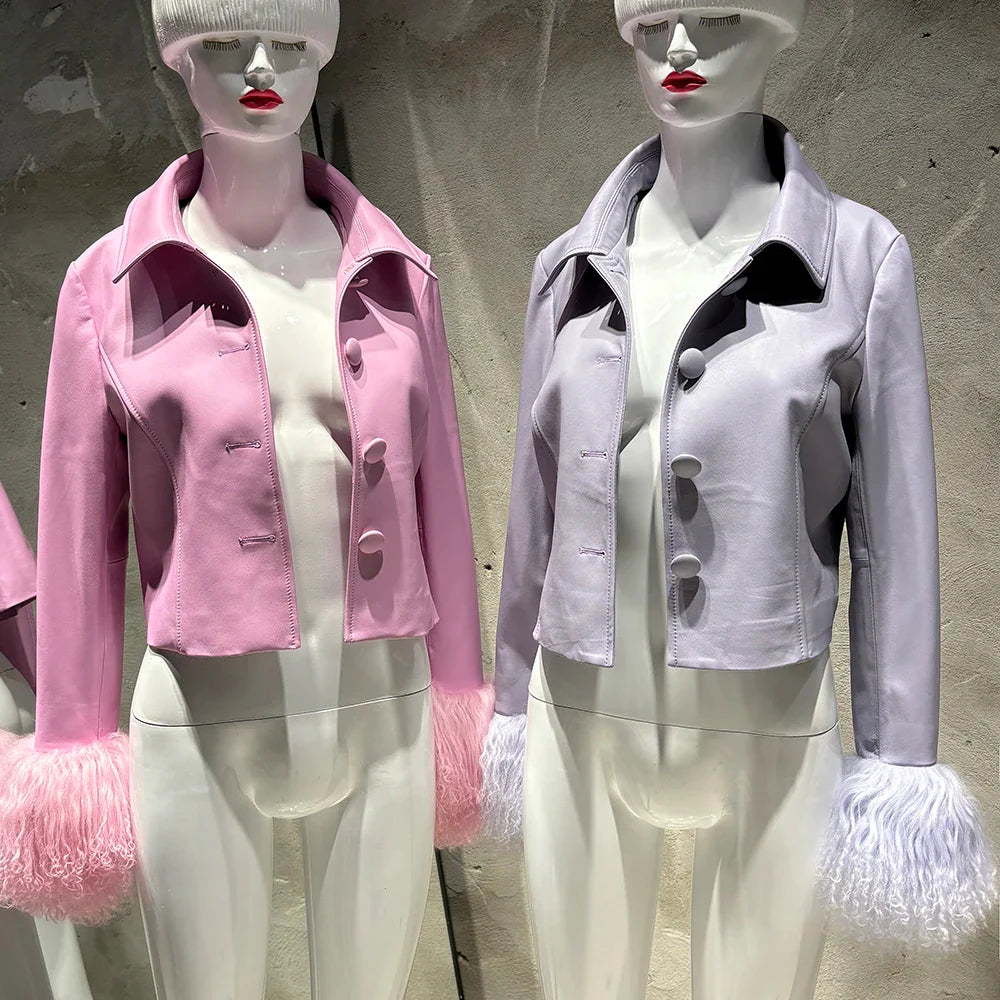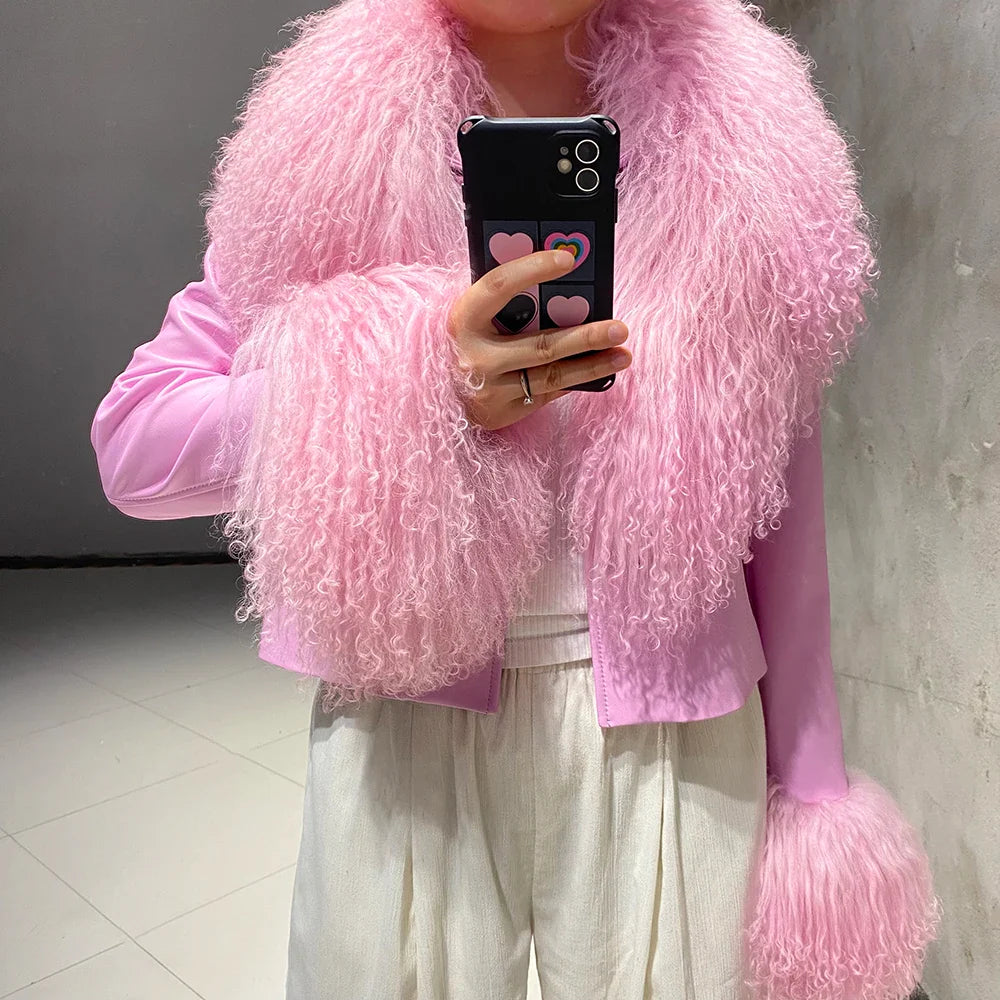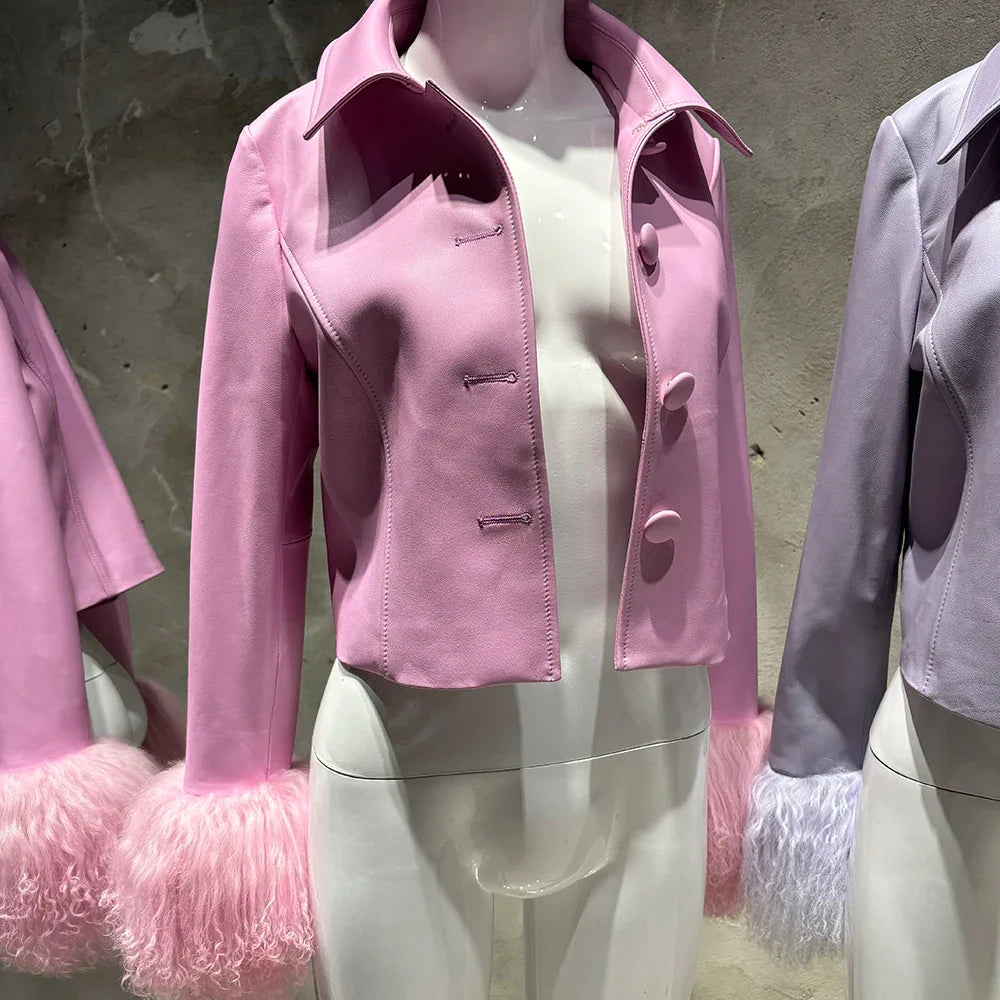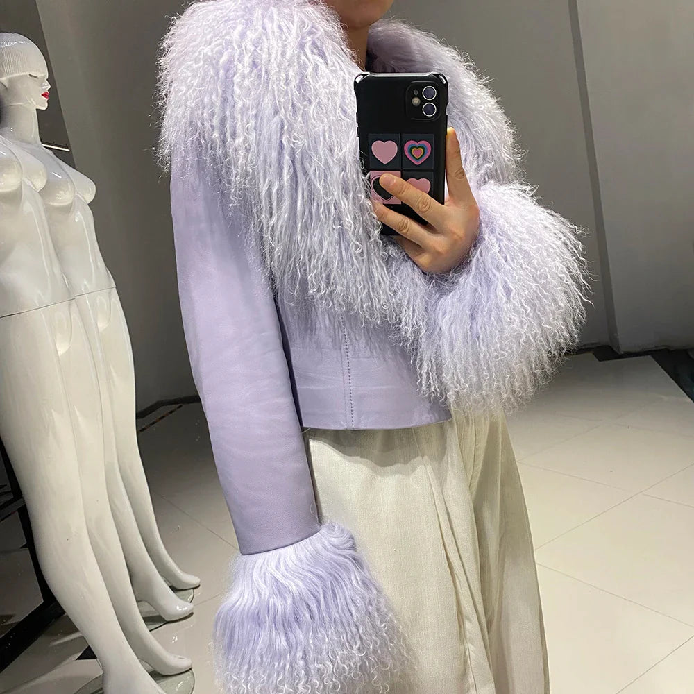 Cozy up in luxury. Stay warm and stylish in this cropped jacket. crafted from genuine leather and suede with plush Mongolian curly sheep fur on the collar and cuffs.