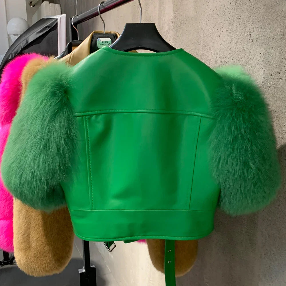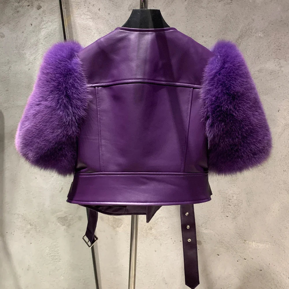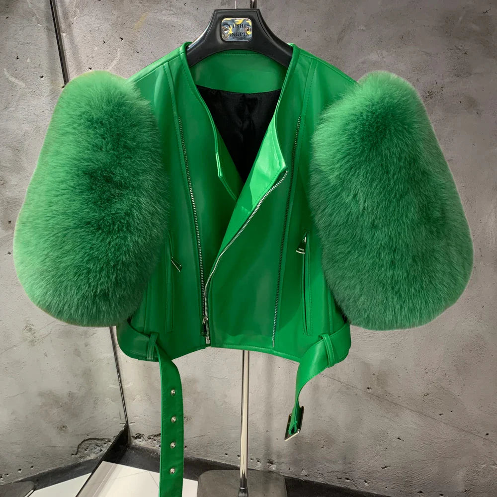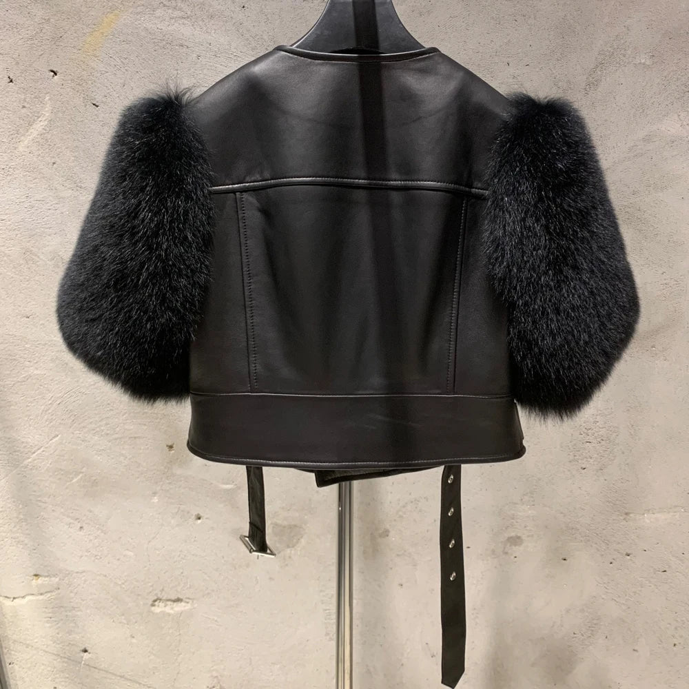 Featuring a belted waist and premium fox fur sleeves. it combines edgy style with unparalleled elegance. A true statement piece that exudes confidence and sophistication.