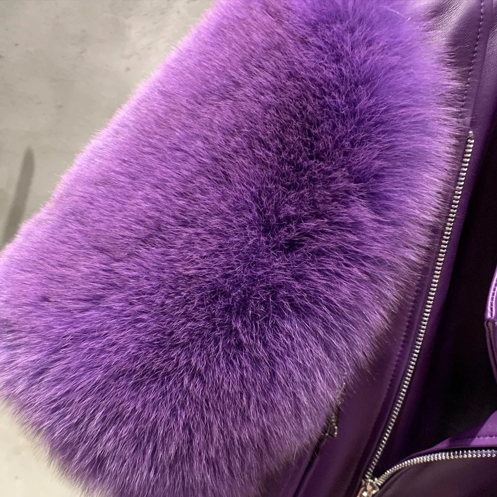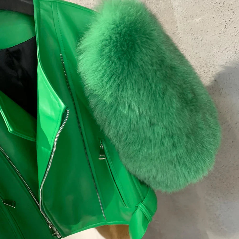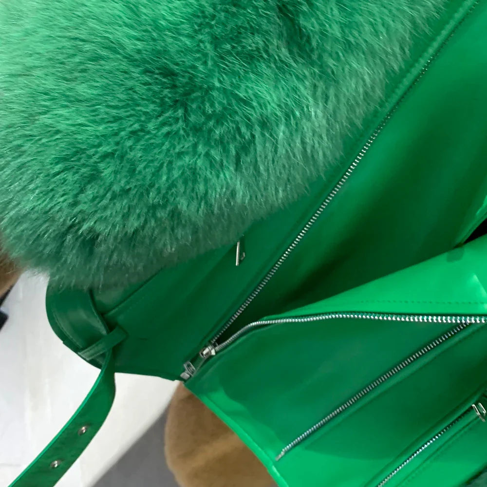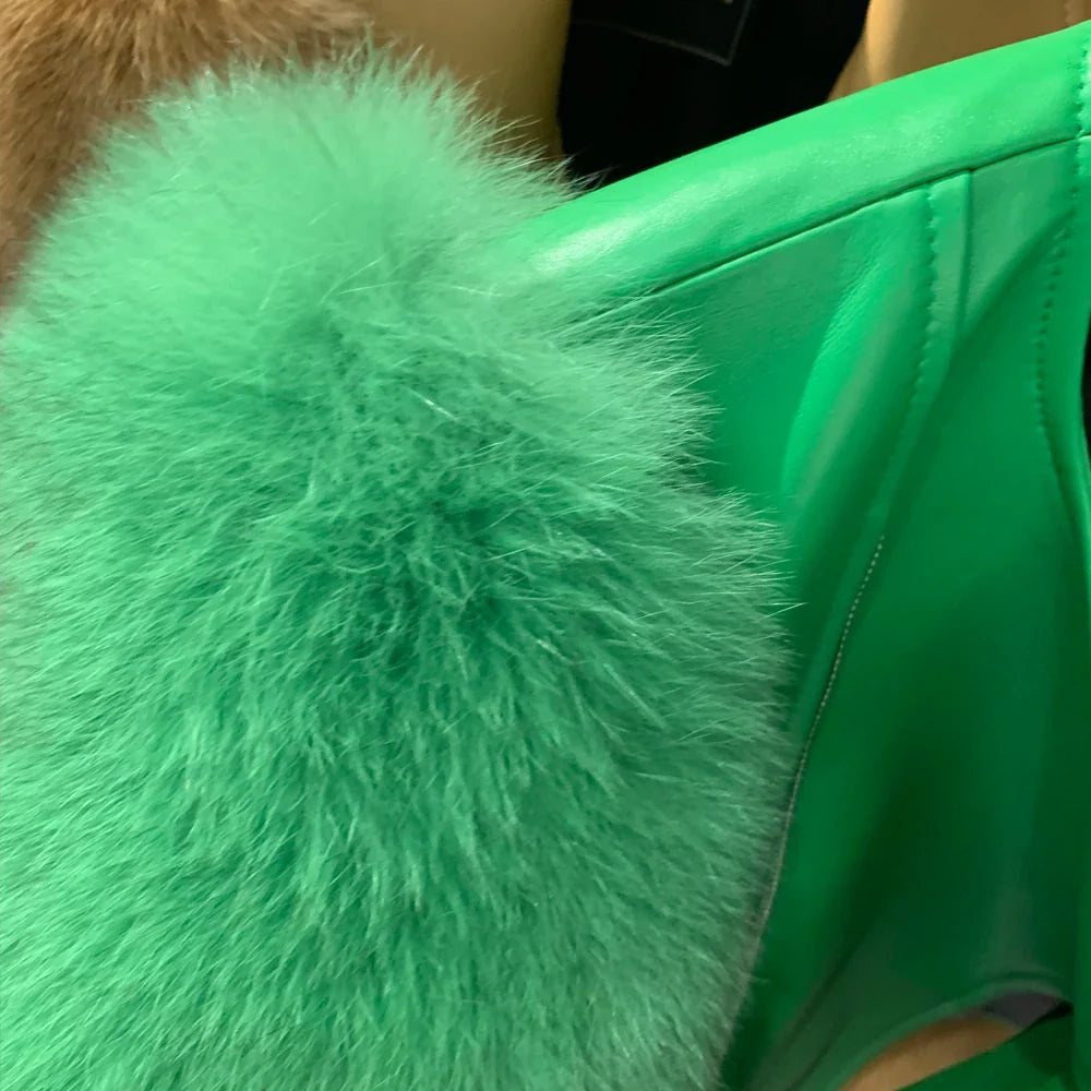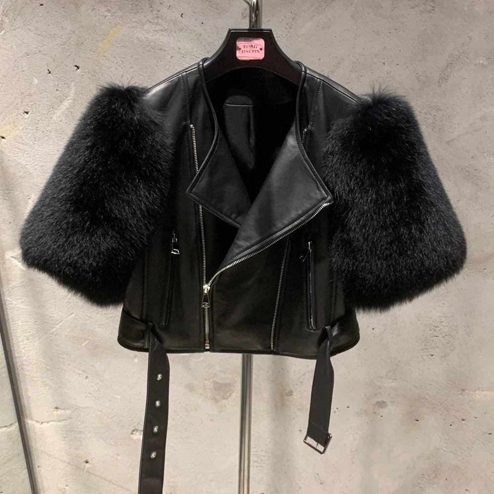 Featuring a belted waist and premium fox fur sleeves. it combines edgy style with unparalleled elegance. A true statement piece that exudes confidence and sophistication.