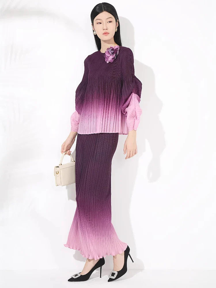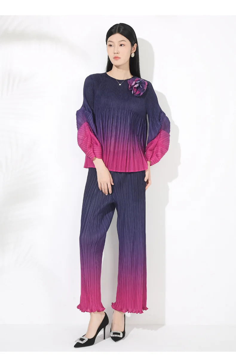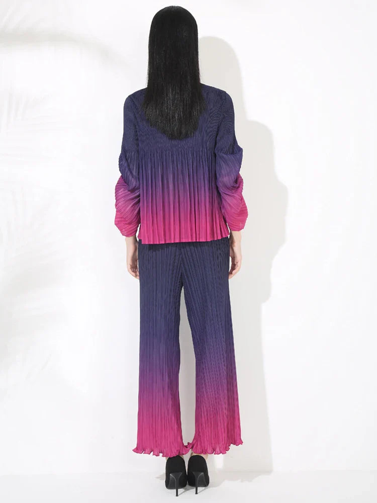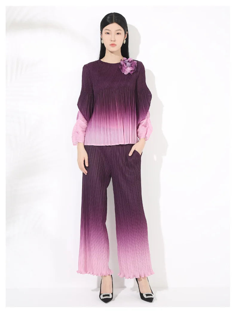 Soft ombre hues and authentic Japanese pleats define this breathable. comfortable two-piece pants set designed for both casual outings and formal occasions. The loose fit allows for unrestricted movement. while the elastic waistband adds extra comfort and flexibility.
