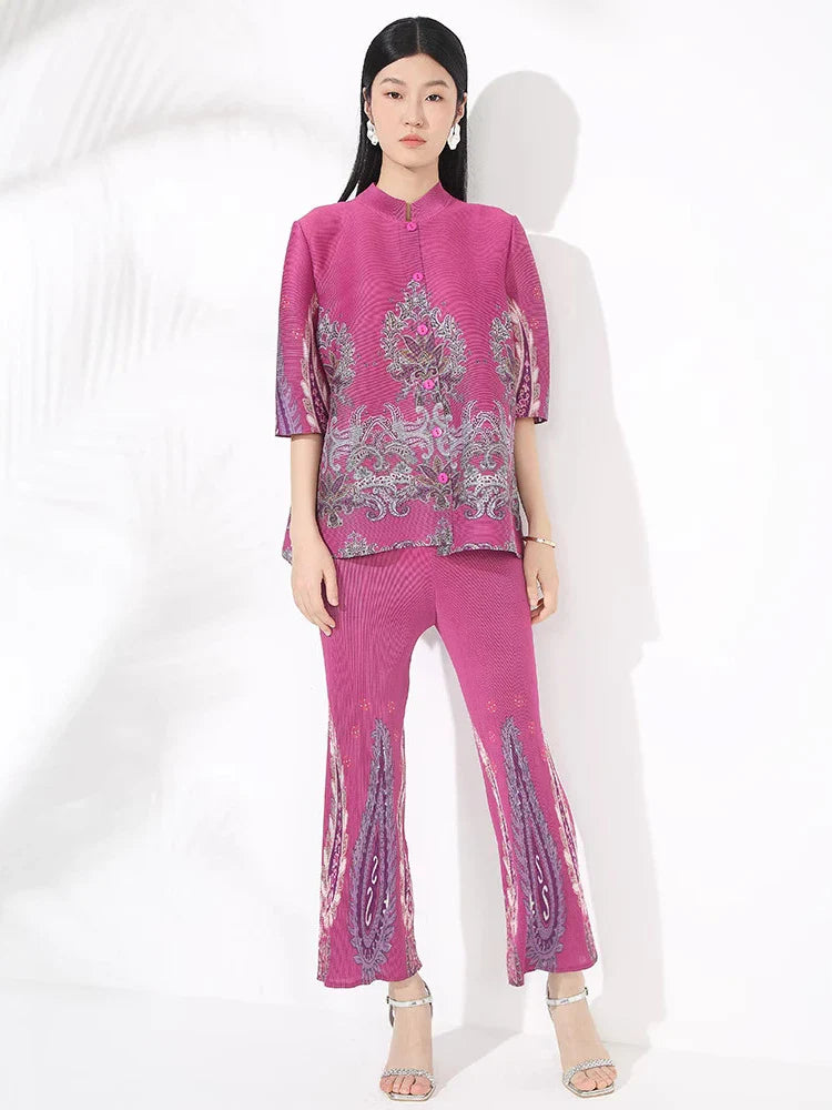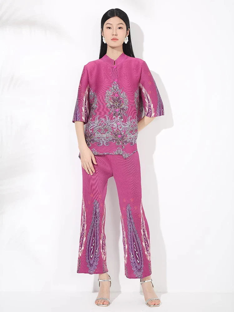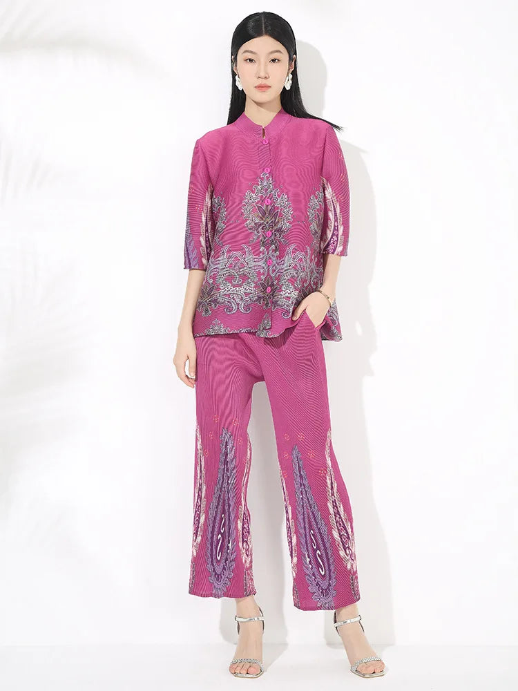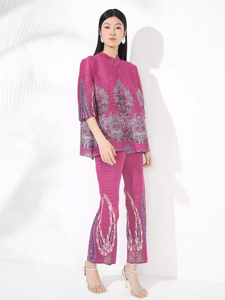 An iconic blend of refined pleats and sleek tailoring. This set features a fitted button-up top paired with wide-leg ankle-length pants. crafted for comfort and movement.