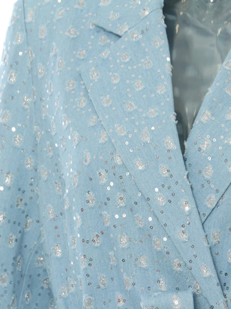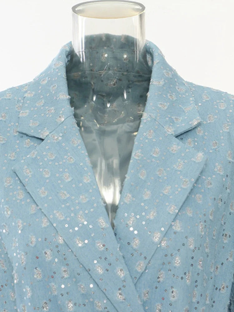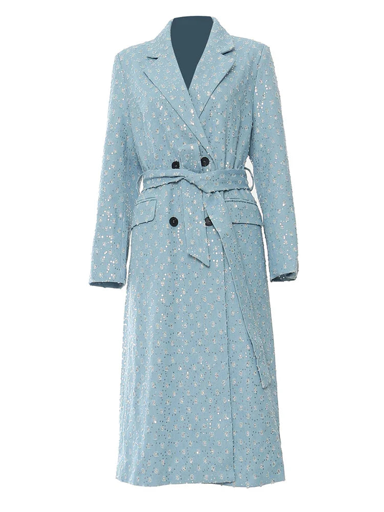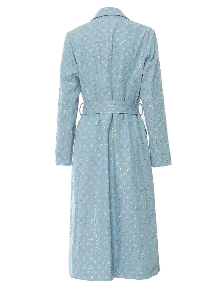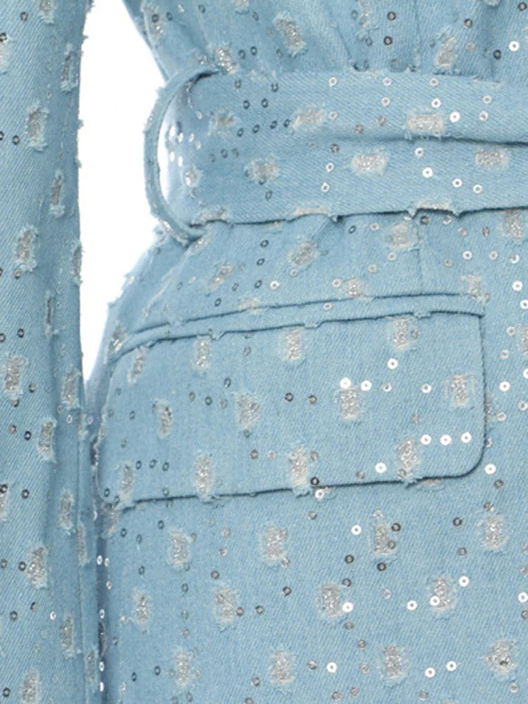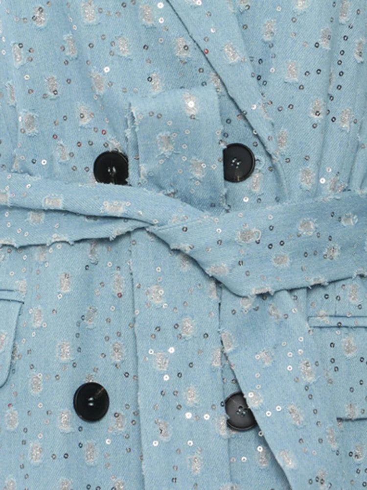 Designed for those who embrace edgy elegance. this distressed denim trench coat is elevated with shimmering sequins.