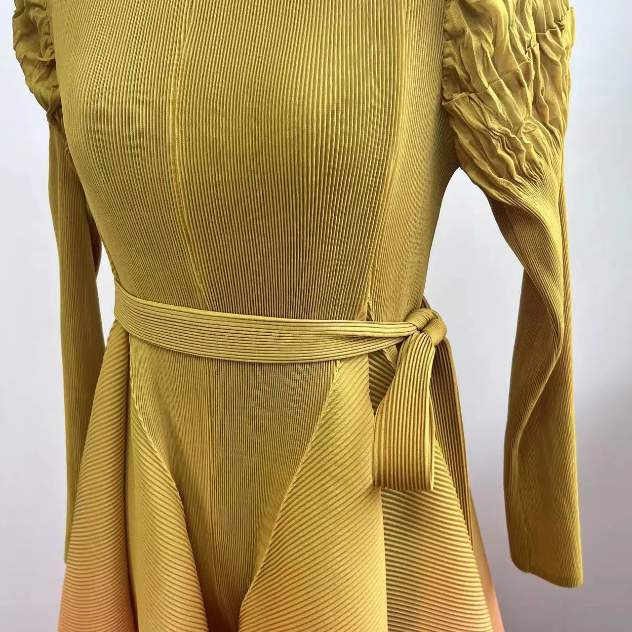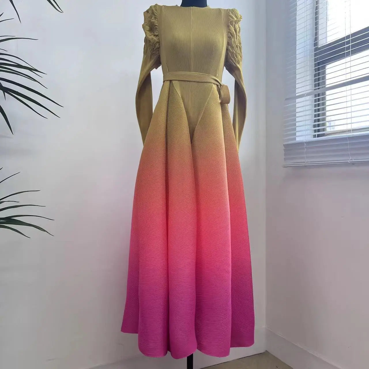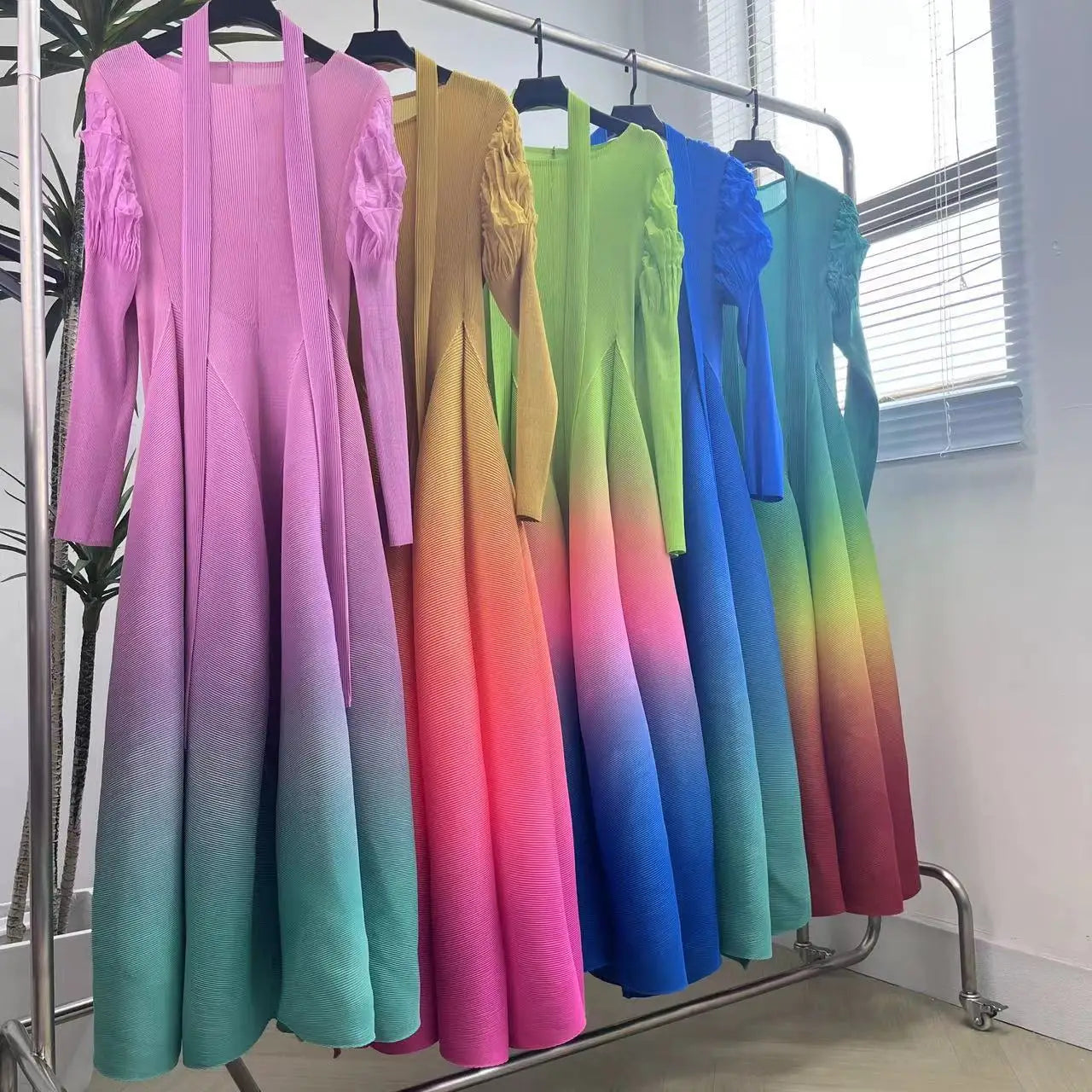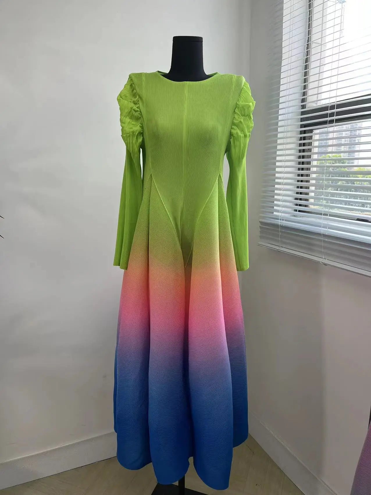 The gradient of different colors flows seamlessly. creating a visually stunning effect. Made from authentic Japanese pleated fabric. it features chic puff shoulder sleeves and offers an elegant yet modest look.Perfect for both casual outings and special events. this limited edition piece is a must-have for your wardrobe.