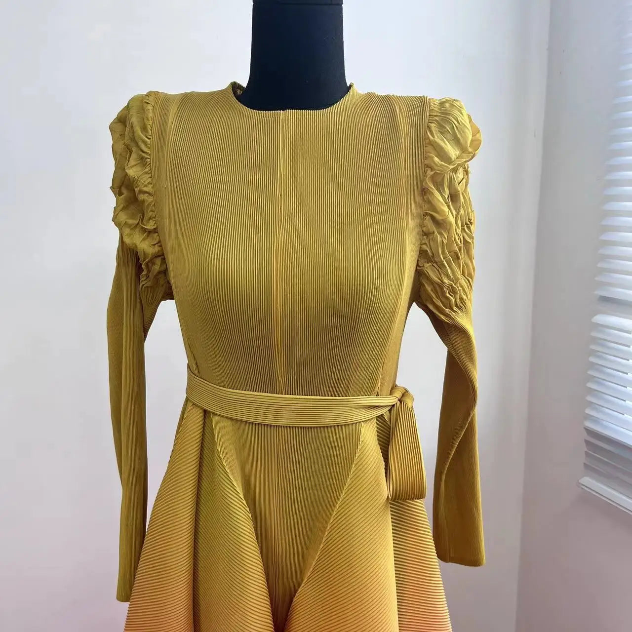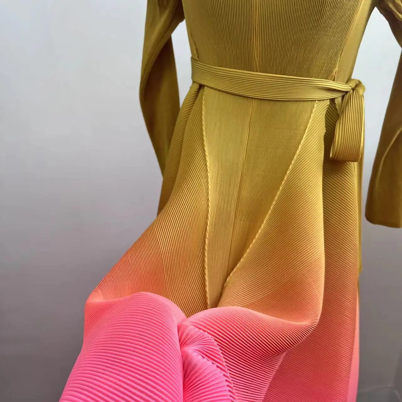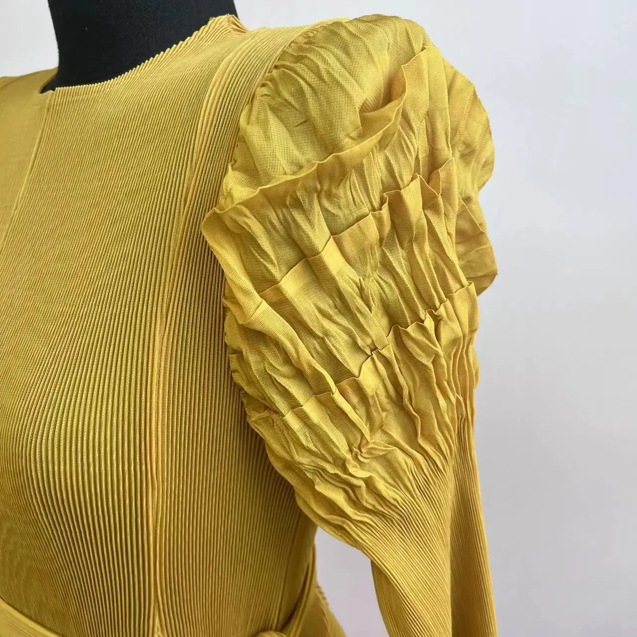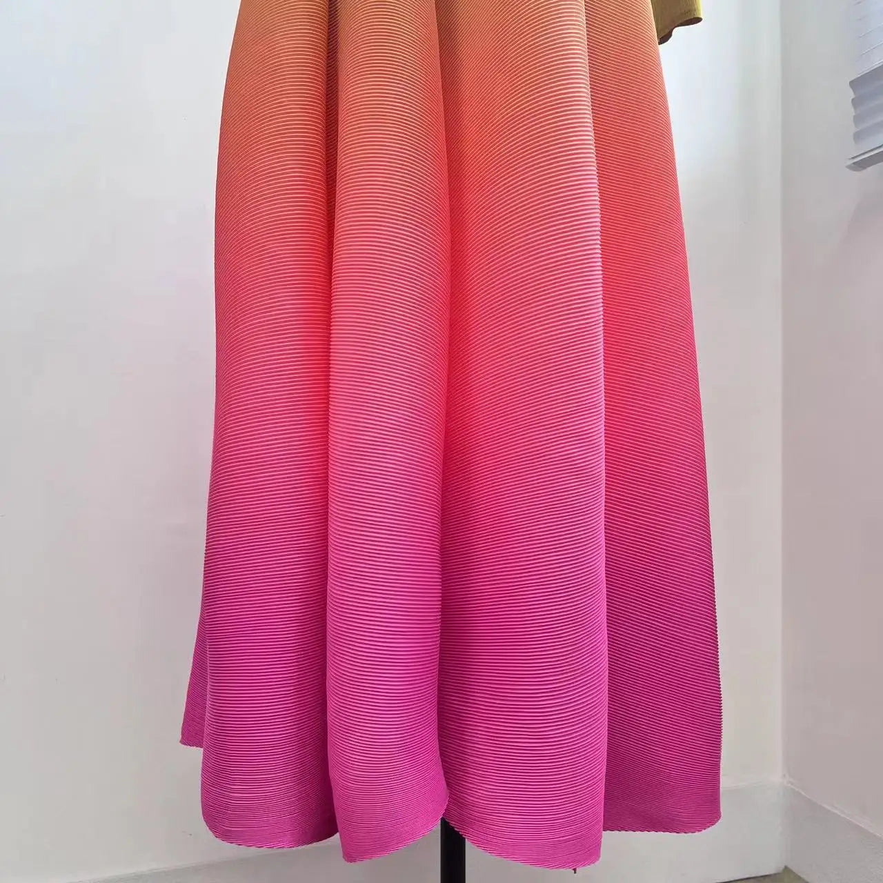 The gradient of different colors flows seamlessly. creating a visually stunning effect. Made from authentic Japanese pleated fabric. it features chic puff shoulder sleeves and offers an elegant yet modest look.Perfect for both casual outings and special events. this limited edition piece is a must-have for your wardrobe.