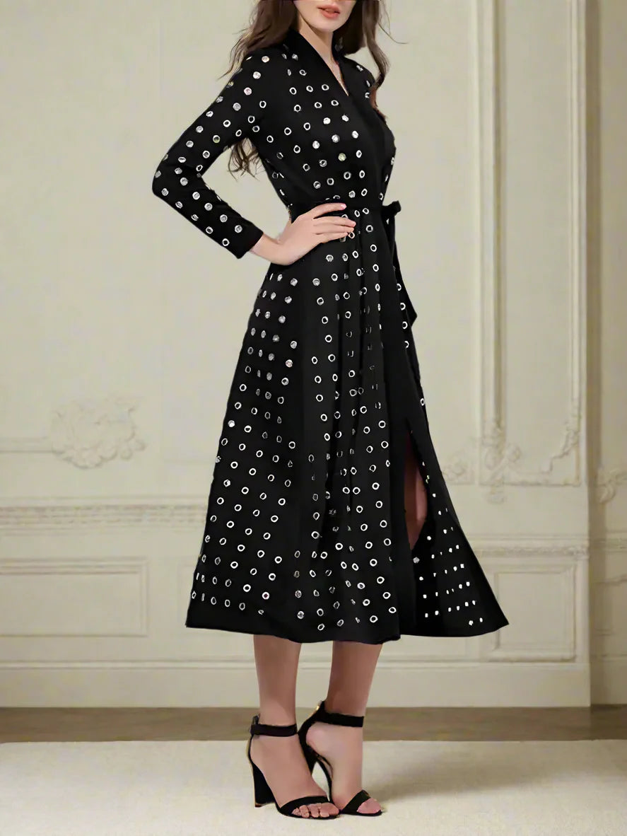 Laid-back. but never ordinary. This lightweight black cardigan takes classic tailoring and gives it a bold twist with an all-over pierced pattern. The long wrap design flows with you—easy to throw on. but hard to forget.