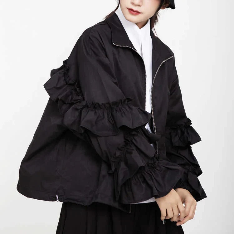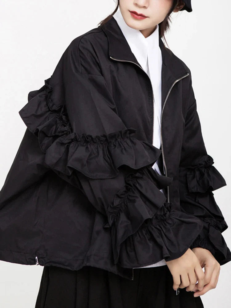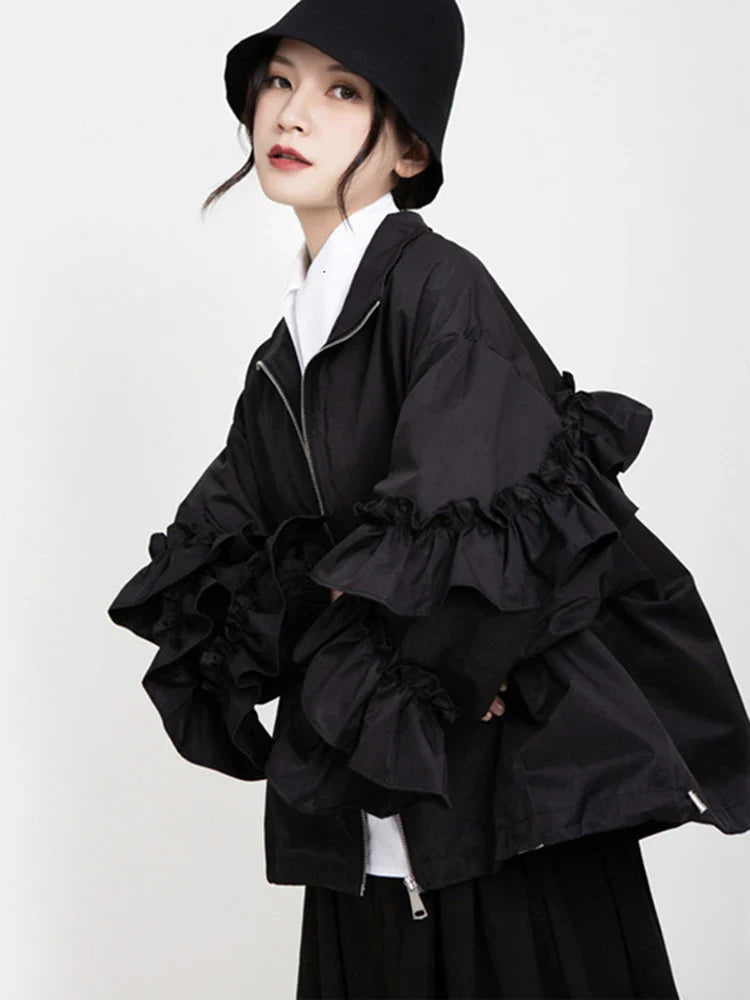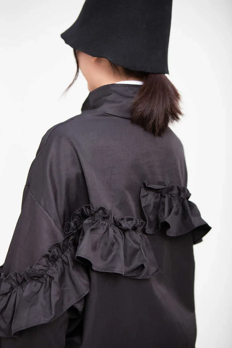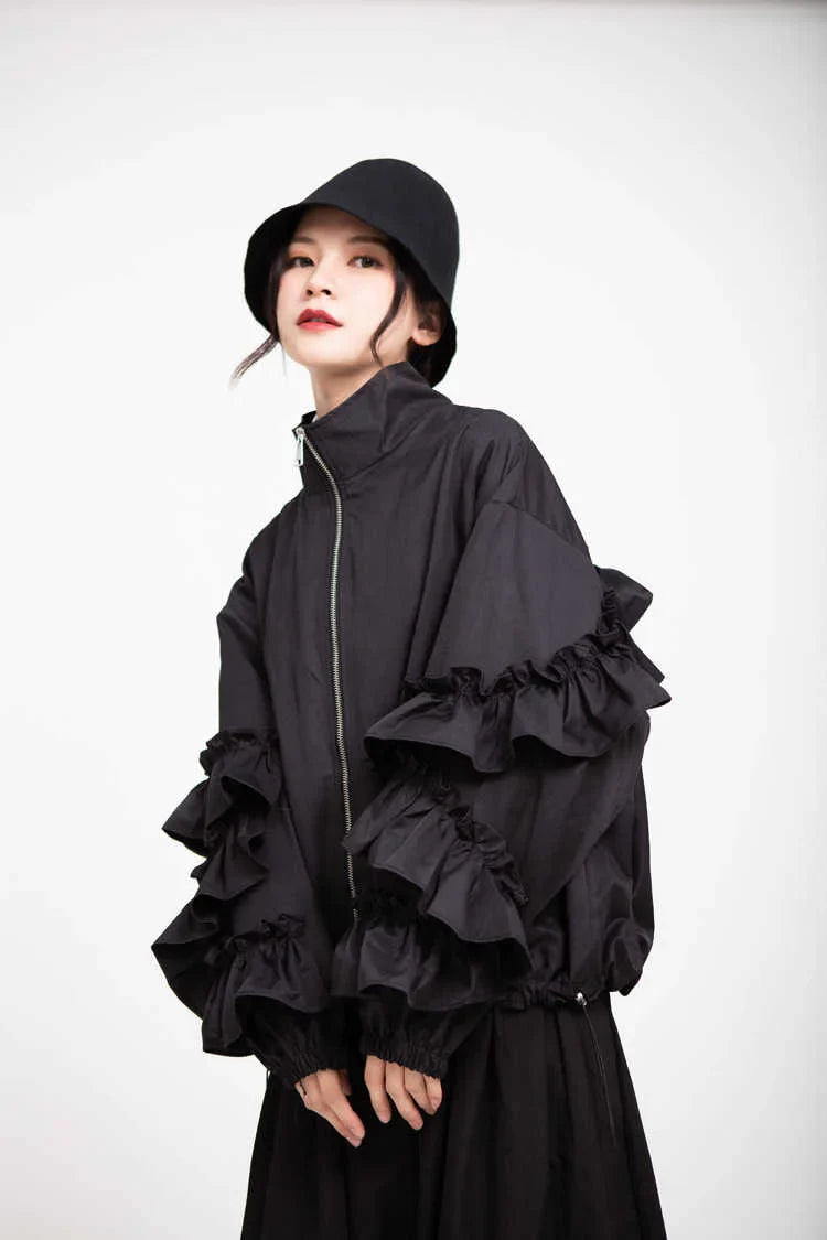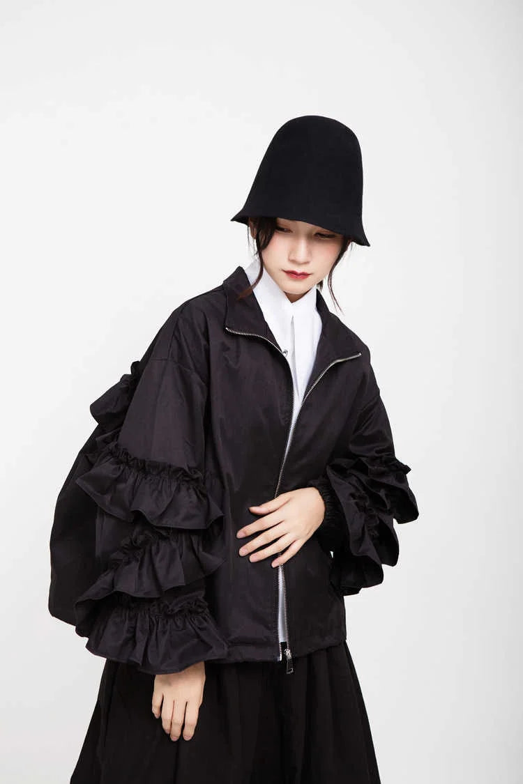 For the woman who commands attention with every detail. This oversized jacket features dramatic tiered ruffled sleeves that exude elegance and sophistication.