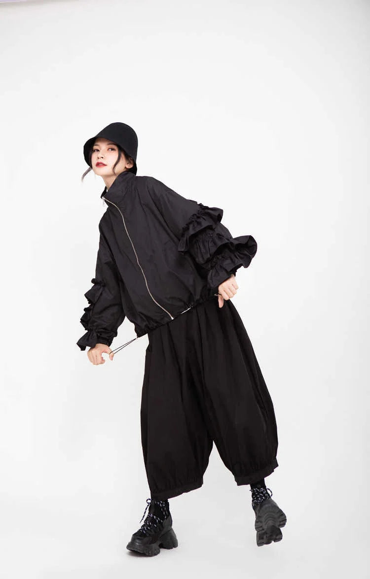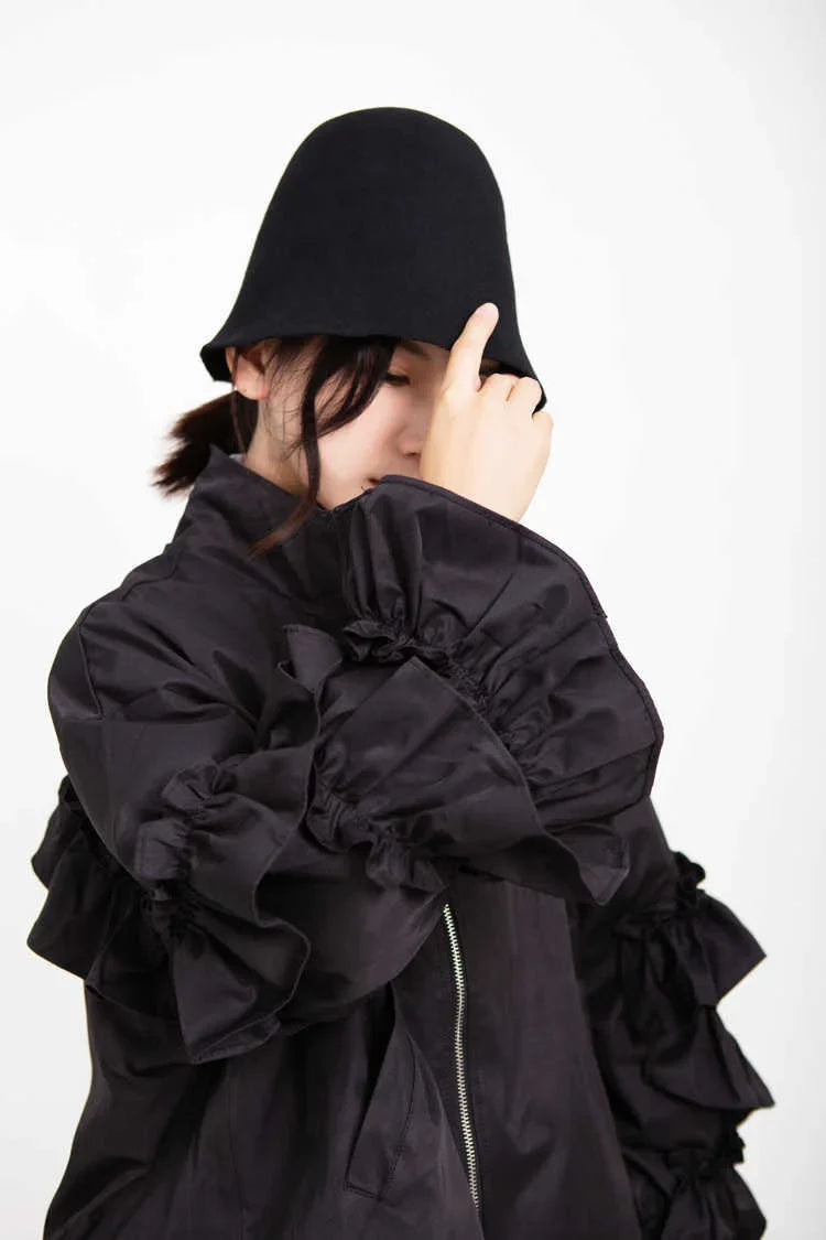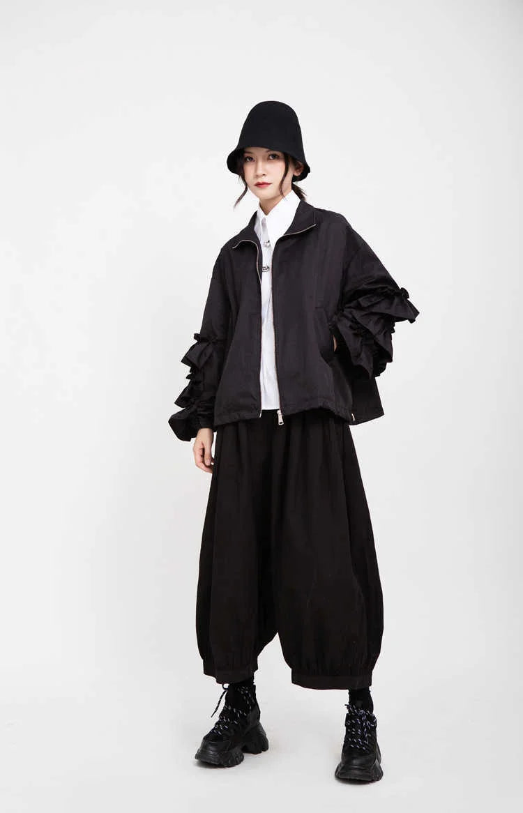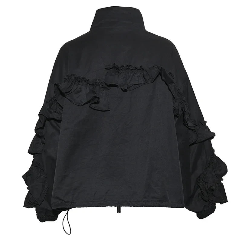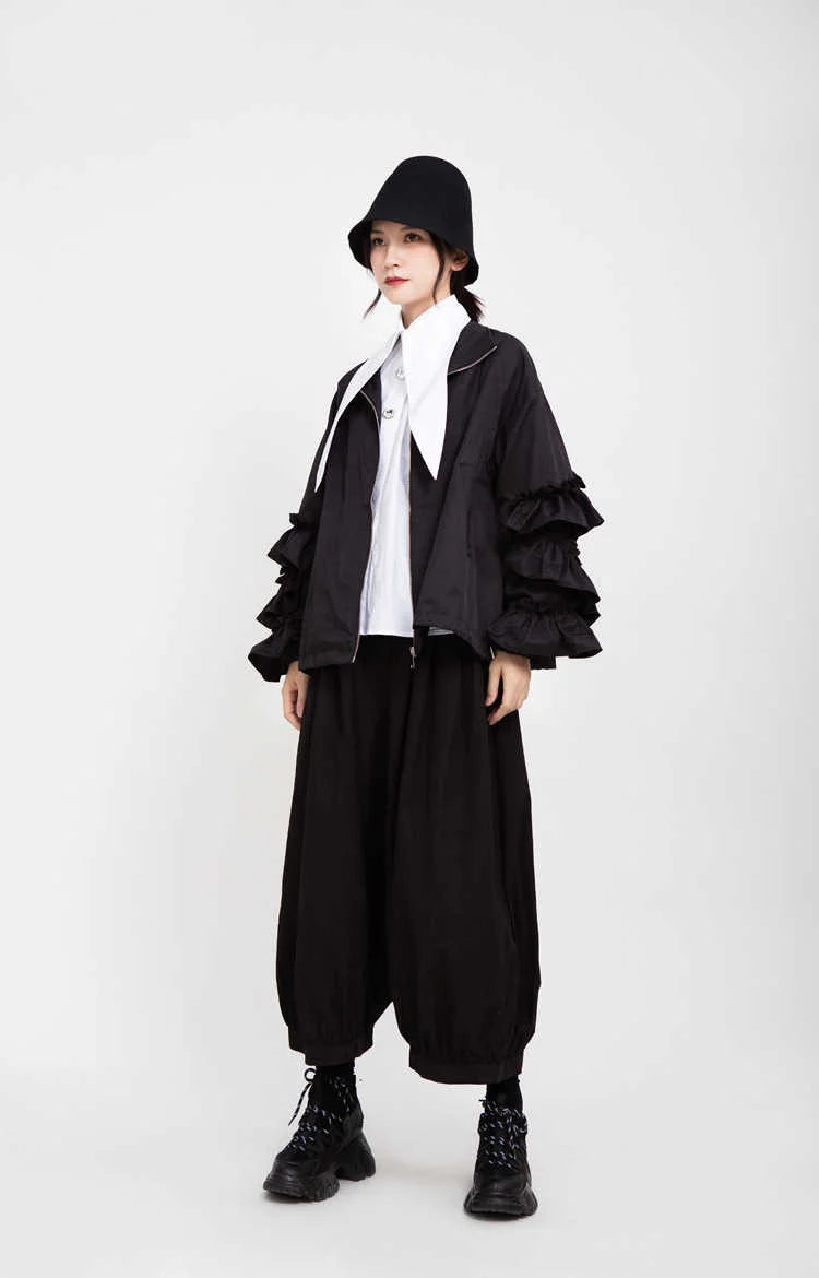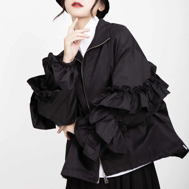 For the woman who commands attention with every detail. This oversized jacket features dramatic tiered ruffled sleeves that exude elegance and sophistication.