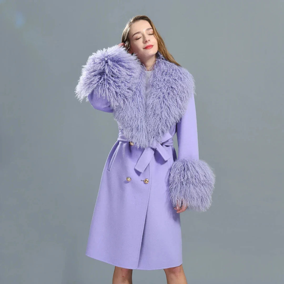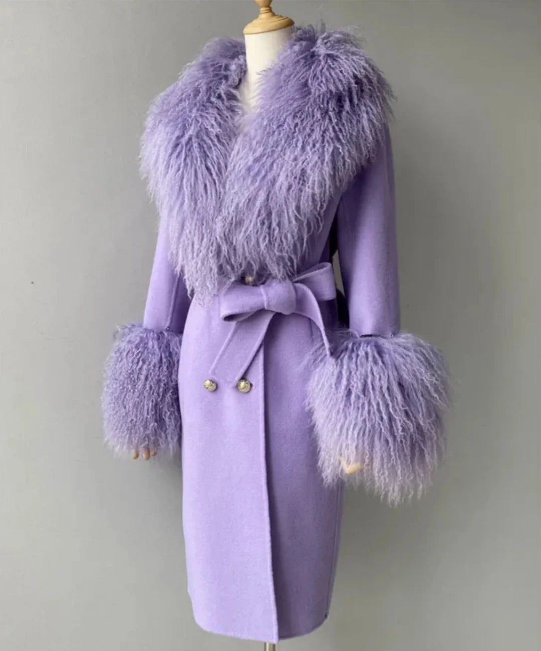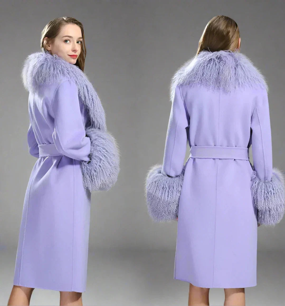 For the woman who craves luxury and timeless elegance. This cashmere and wool coat. adorned with 100% Mongolian sheep fur. wraps you in unmatched softness and designer-level sophistication.