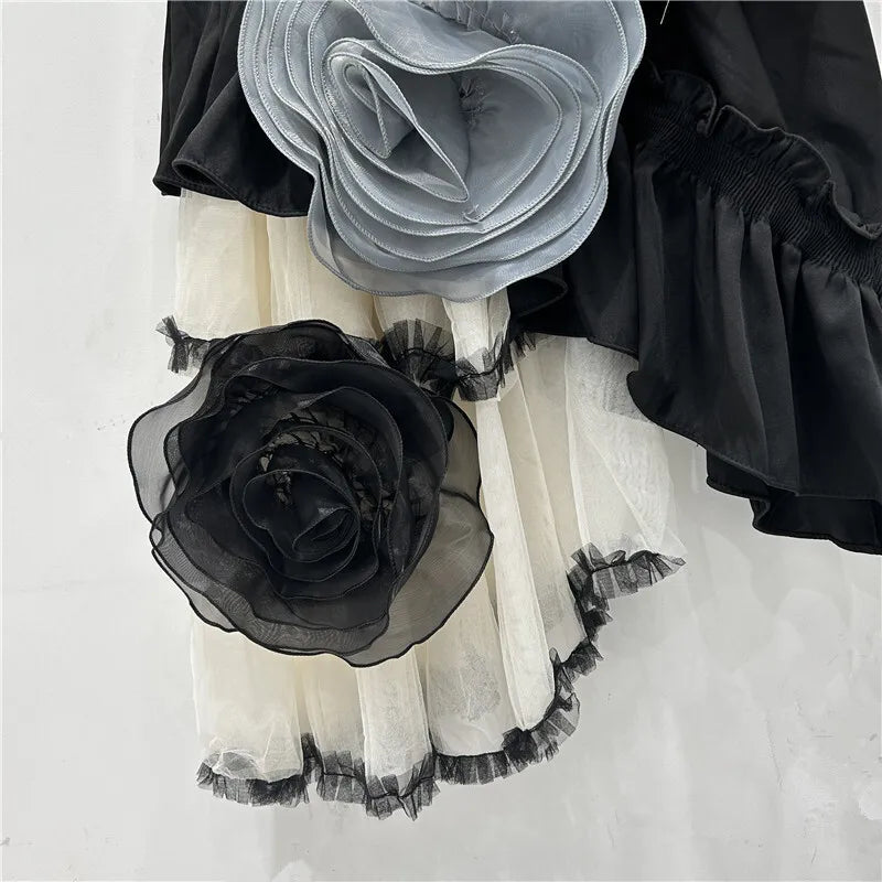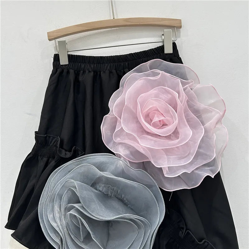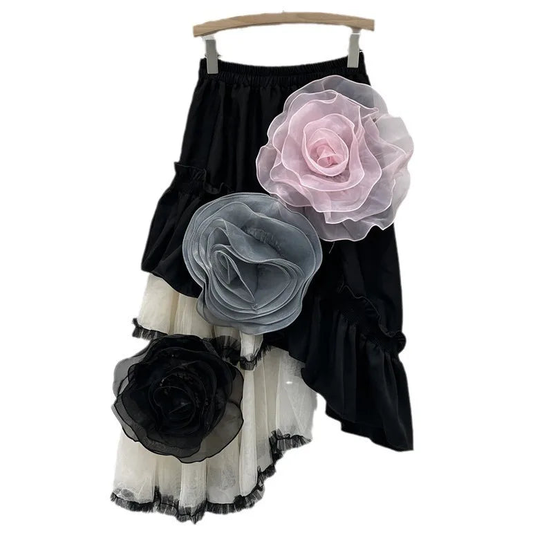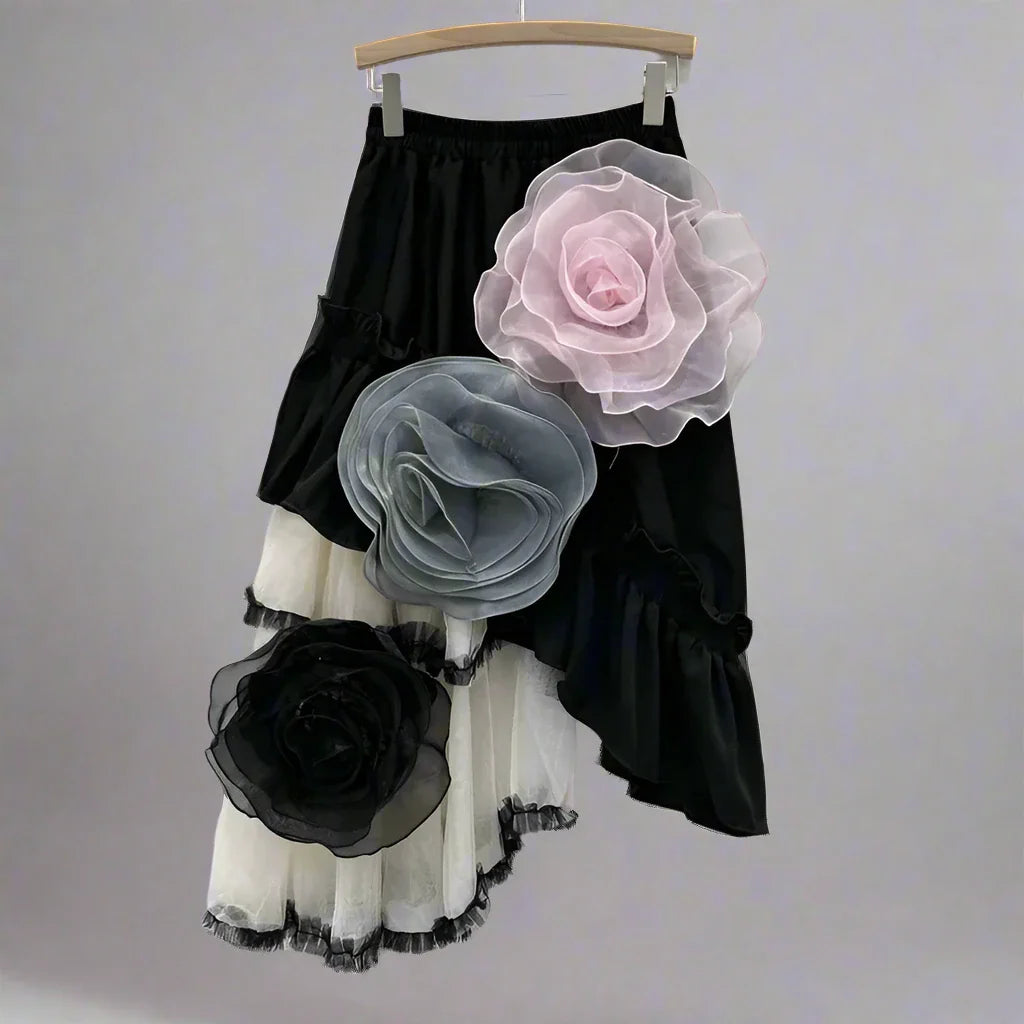 For the woman who loves to stand out with flair. This striking skirt features oversized 3D floral appliqués and an asymmetric hemline. making it perfect for both daytime events and evening outings.
