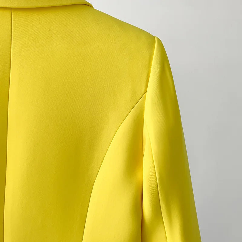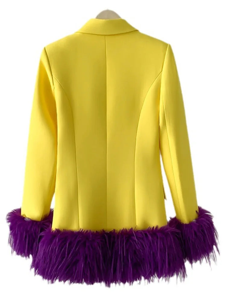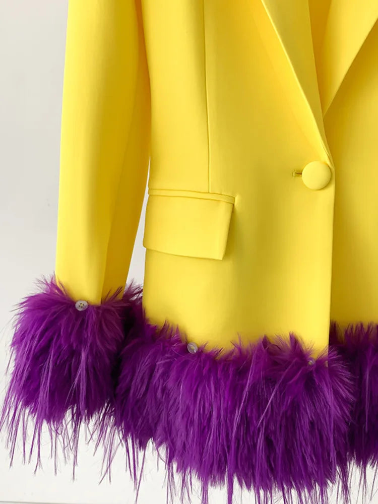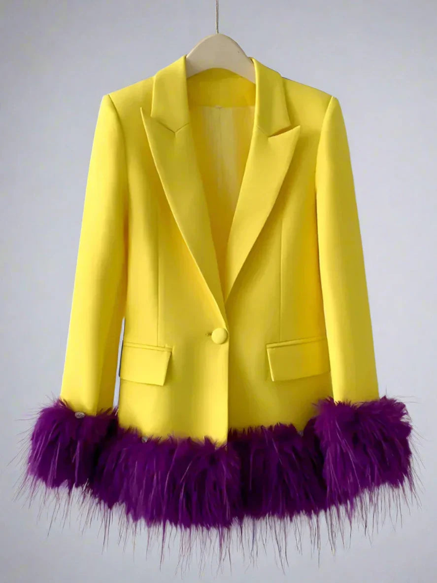 This vibrant yellow blazer is the epitome of elegance and luxury. featuring deep purple feathers at the hem and sleeve ends for a bold. sophisticated twist.