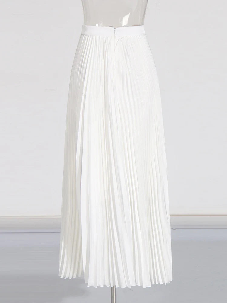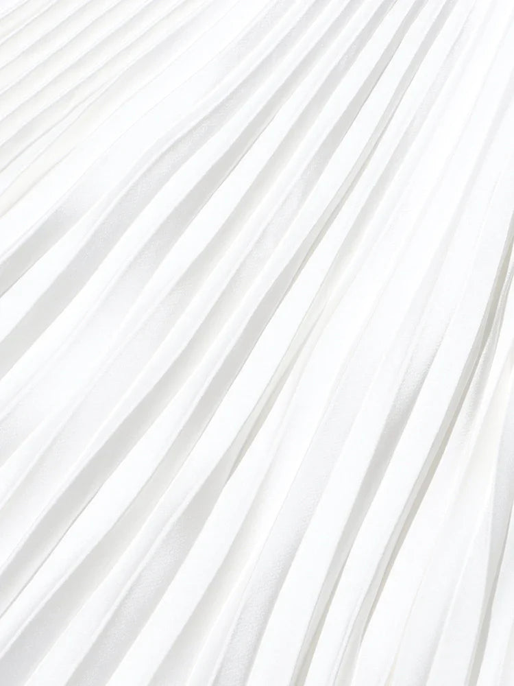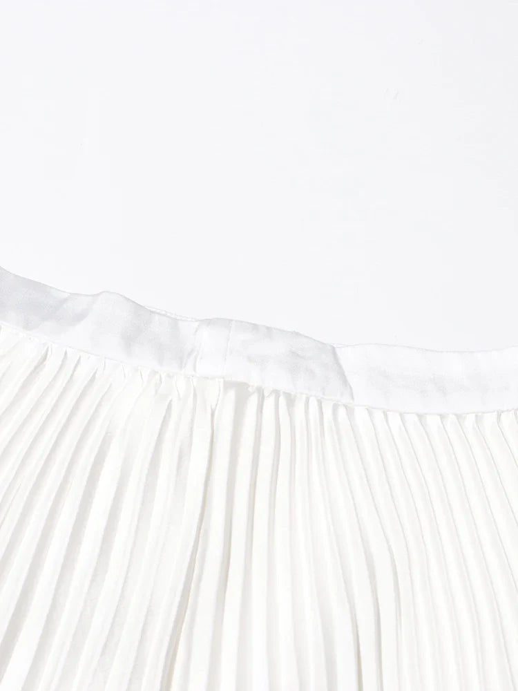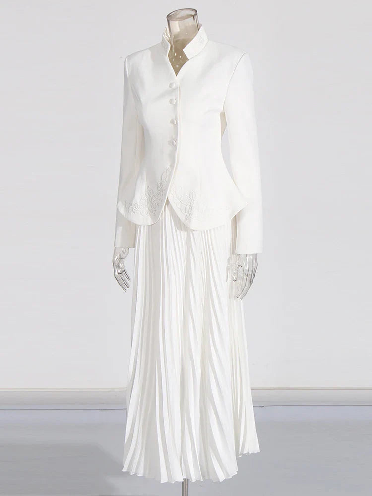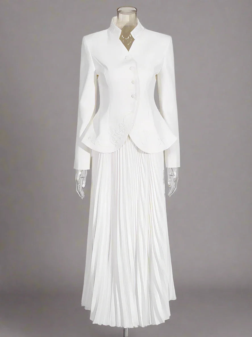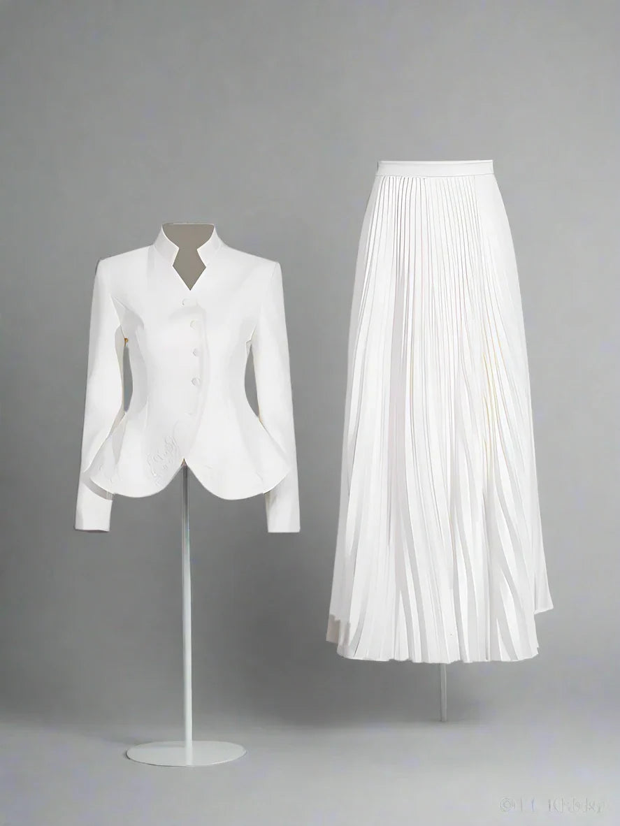 This chic all-white 2-piece set combines elegance with comfort. The tailored blazer pairs perfectly with the pleated long midi skirt for a stylish. timeless look.