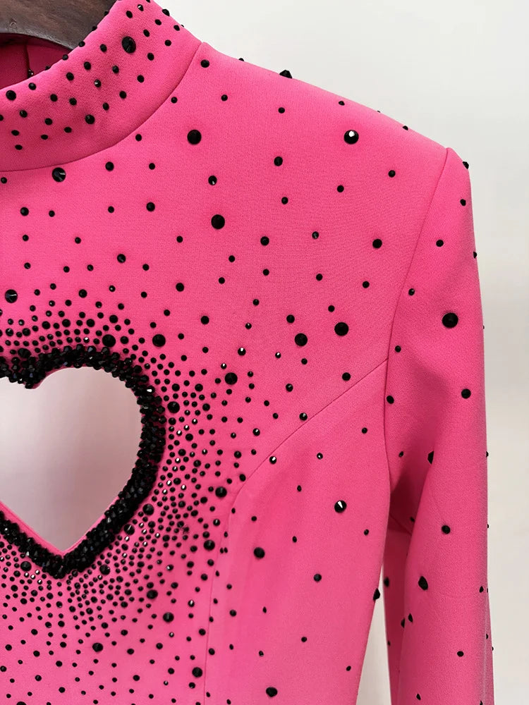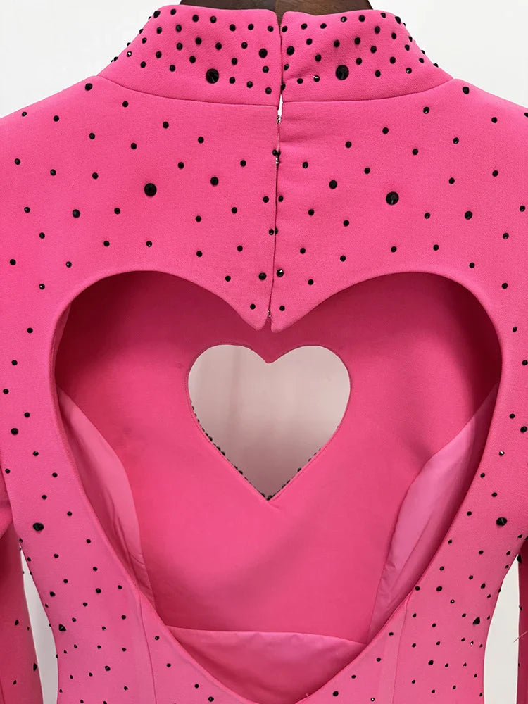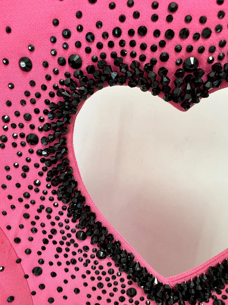 Designed for standout moments. this full-length gown features bold heart-shaped cut-outs and shimmering black rhinestones. The sleek silhouette and long sleeves strike the perfect balance between drama and elegance.