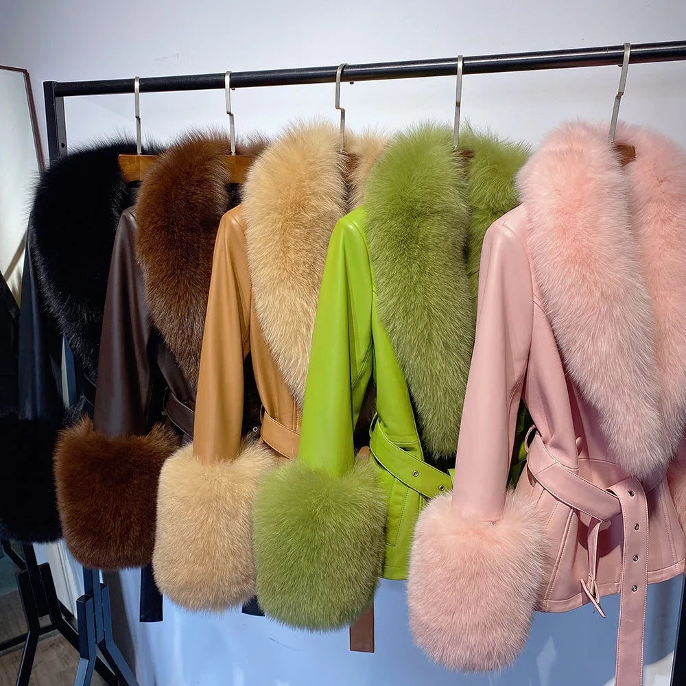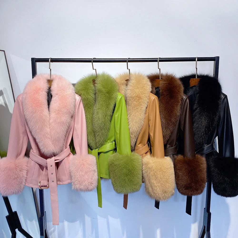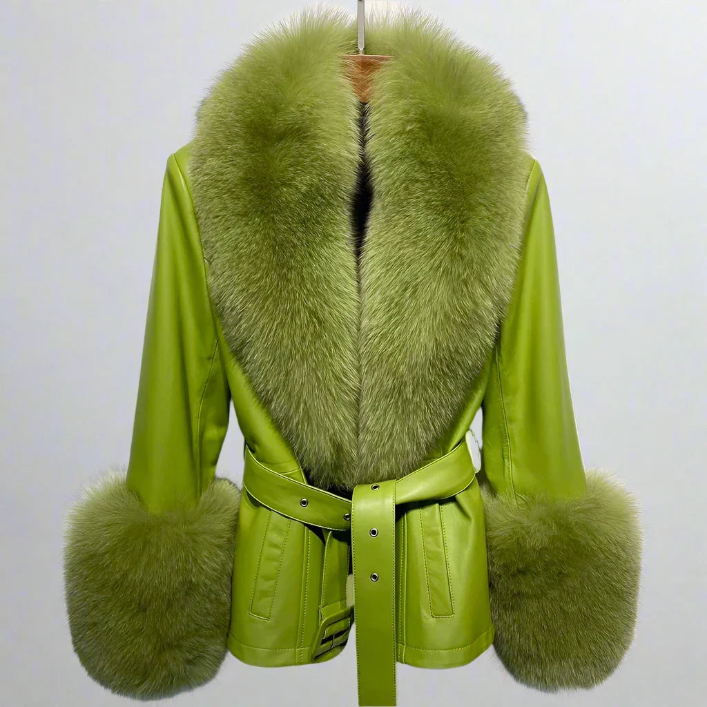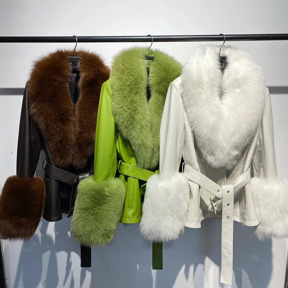 Women's Luxury Leather Coat with Genuine Fox Fur Collar