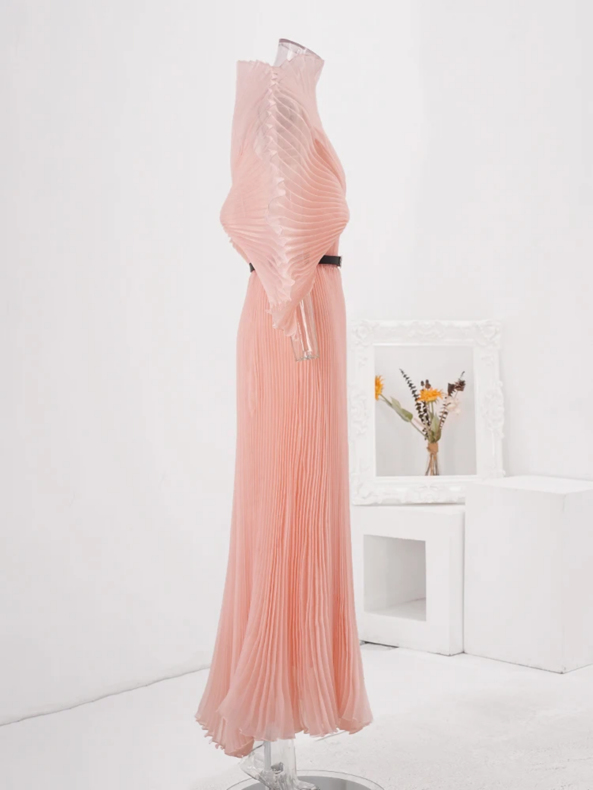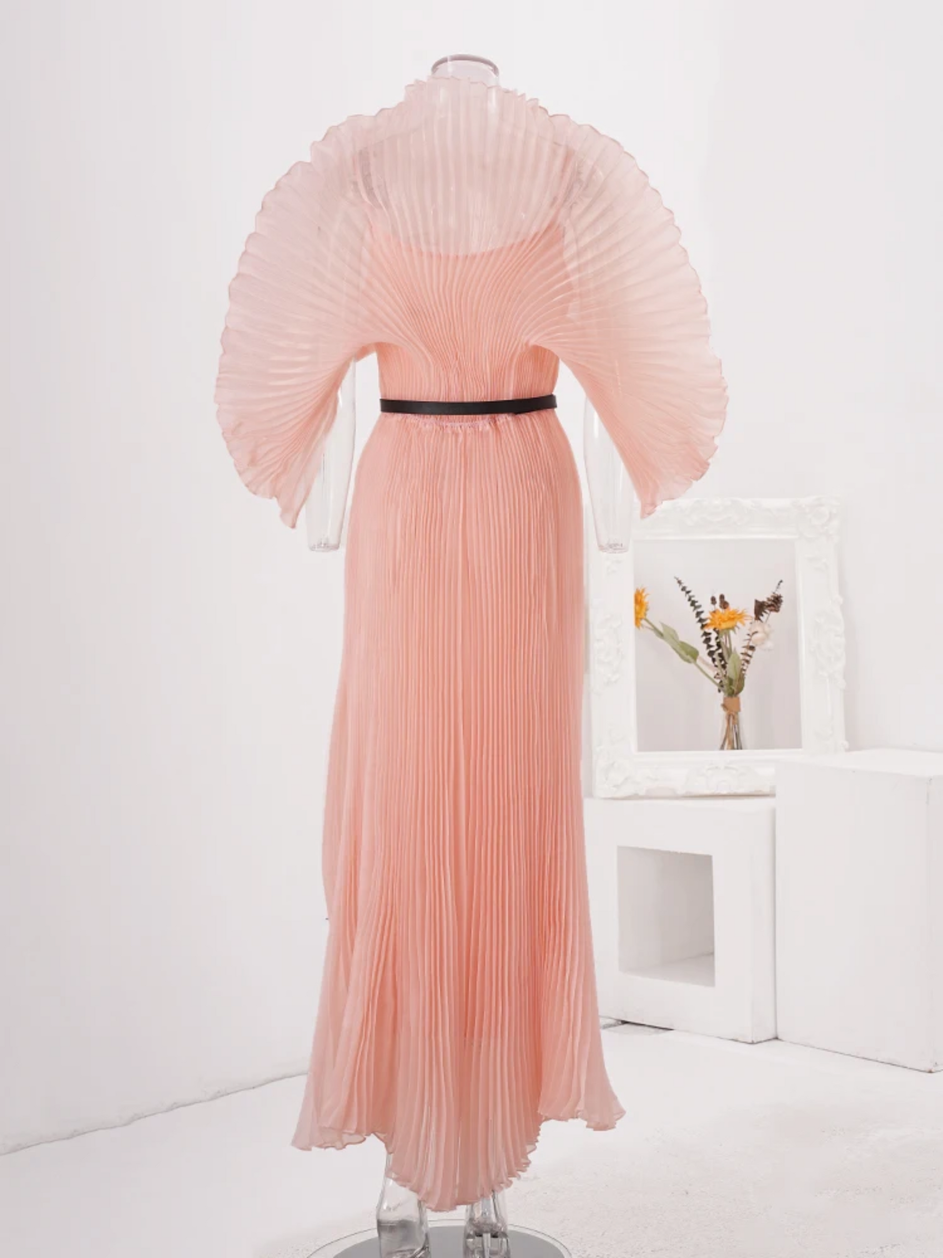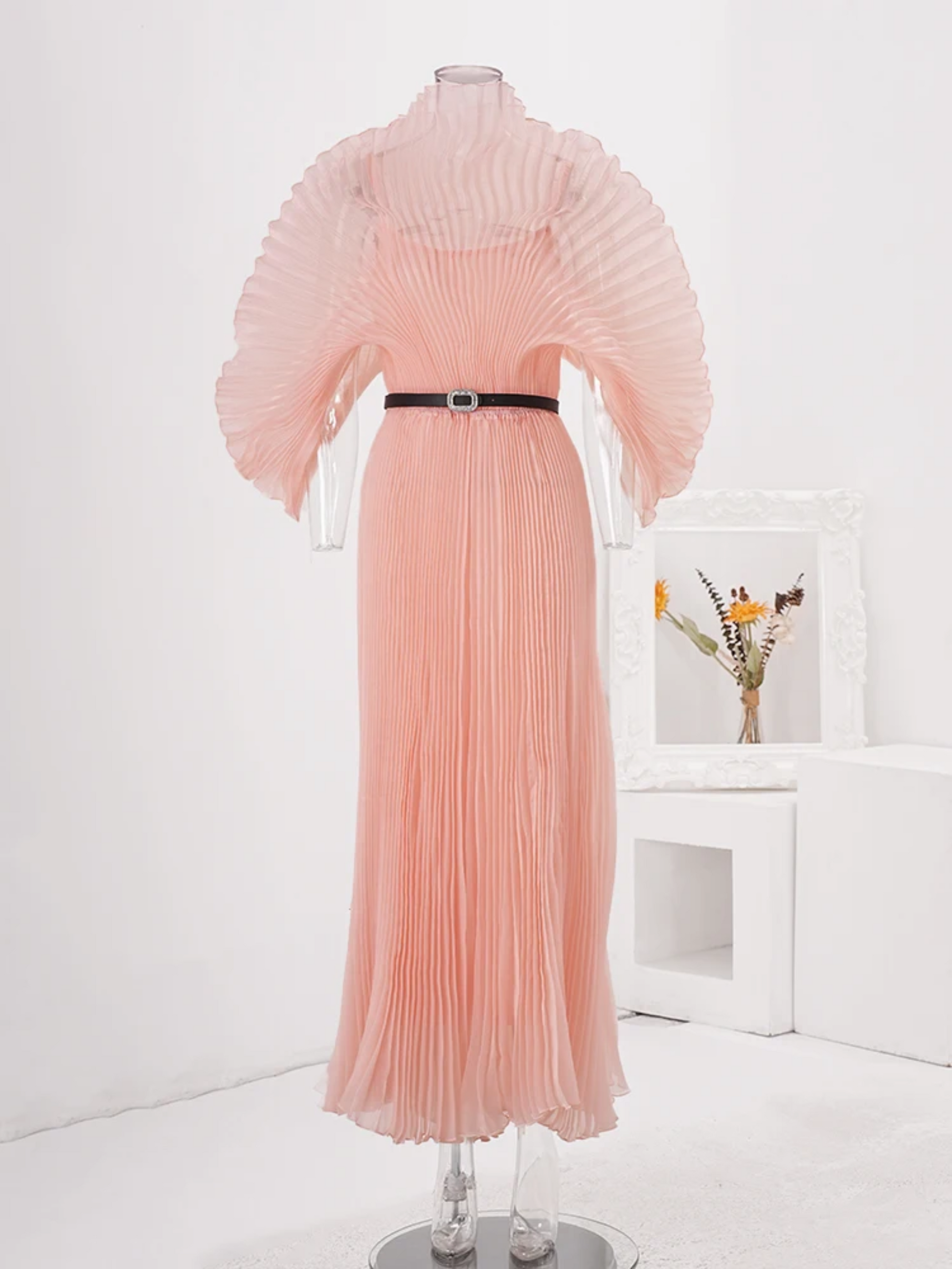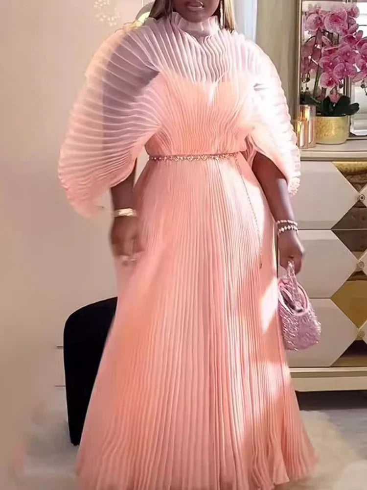 Unveil timeless elegance with this maxi dress. designed to make an impression. Featuring luxurious pleated fabric and dramatic puff-up shoulder sleeves. this dress combines modesty and style effortlessly.