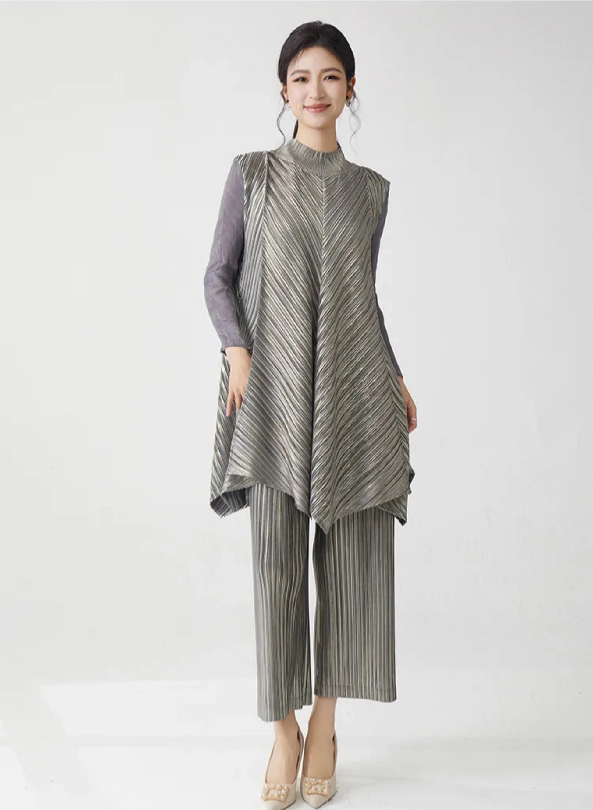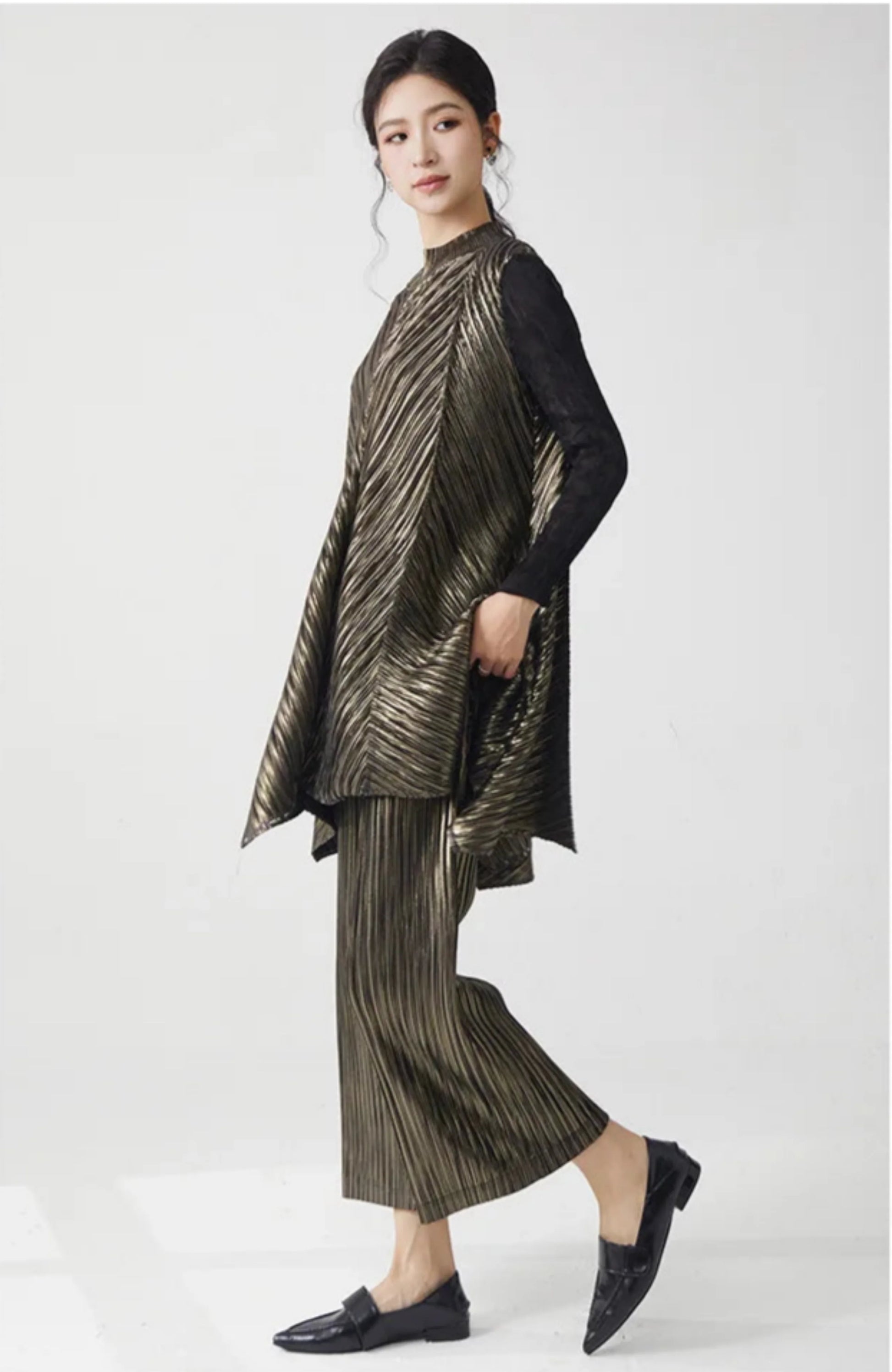 The metallic pleated tunic top paired with wide-leg pants gives you the versatility to dress it up or keep it casual. Perfect for everything from formal events to relaxed outings. this set redefines modern luxury.