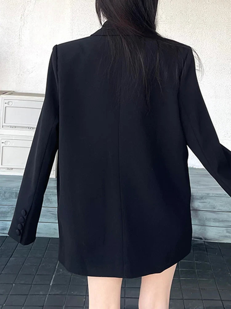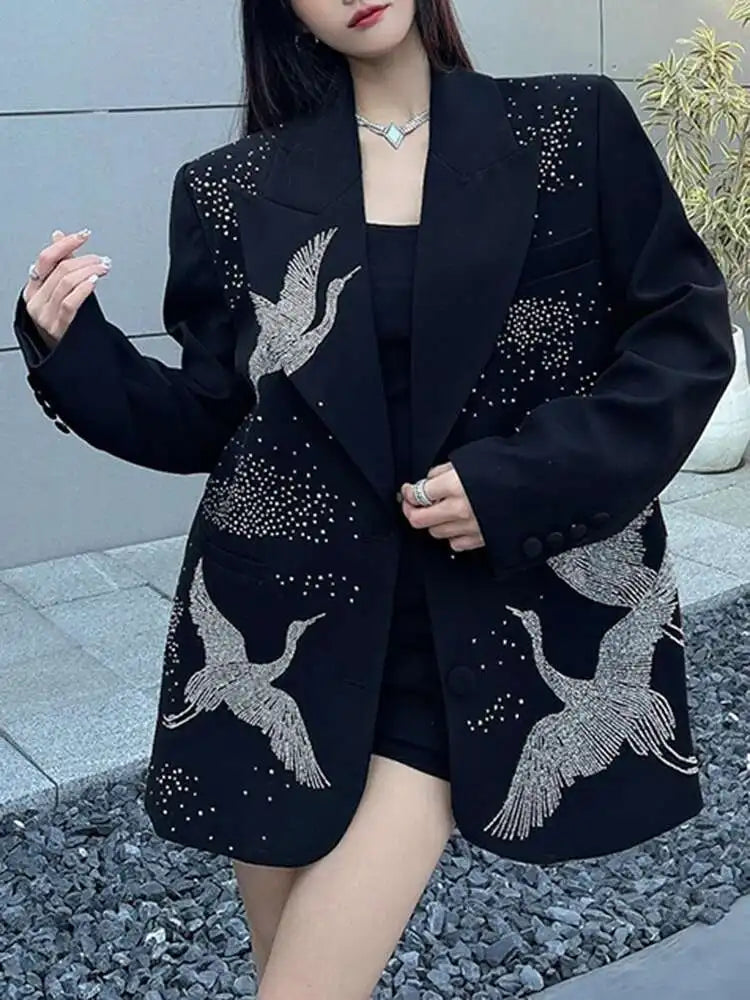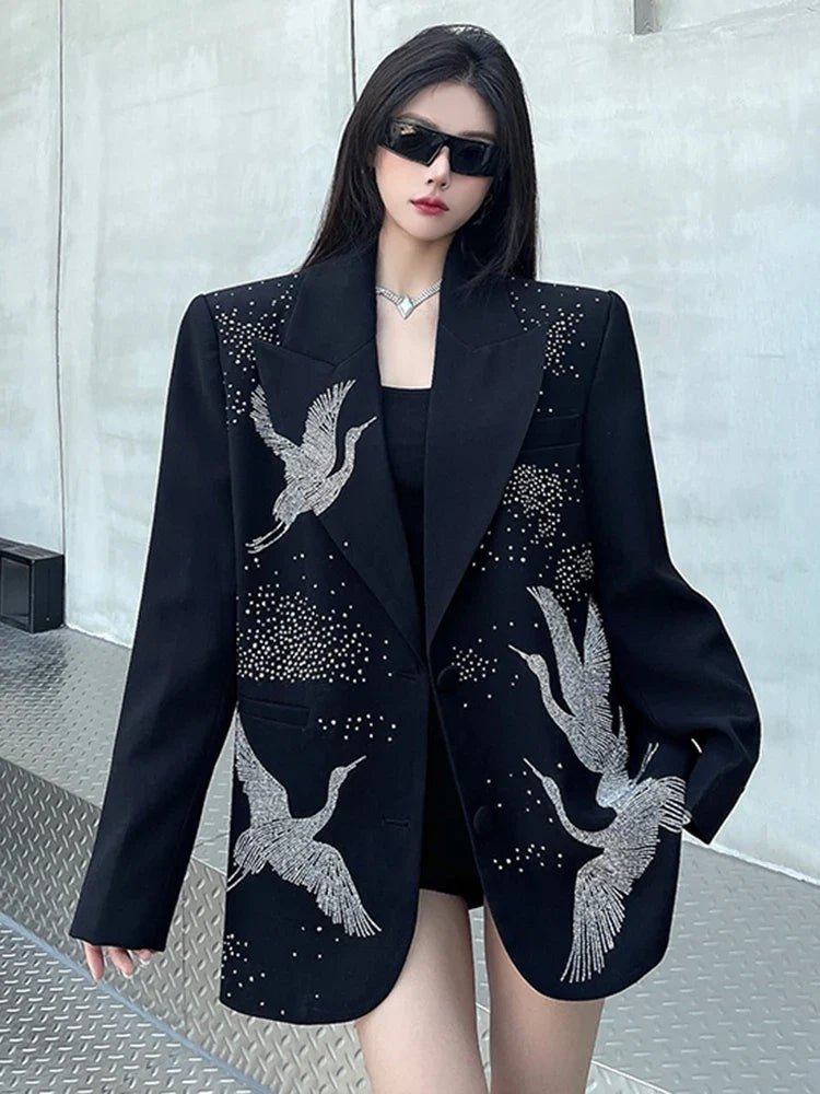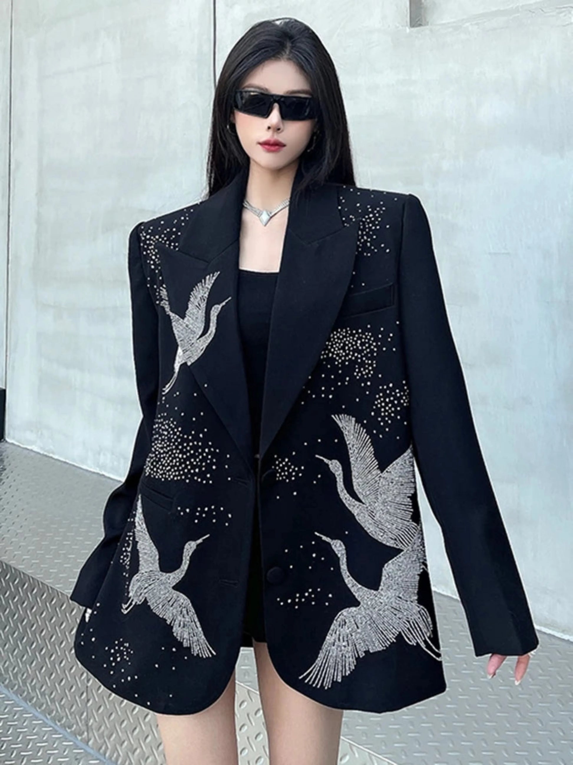 Black with subtle edge. this blazer blends oversized ease with refined details. Rhinestone cranes give a unique touch. making it perfect for day-to-night wear. A standout piece for anyone who wants bold style without the noise.