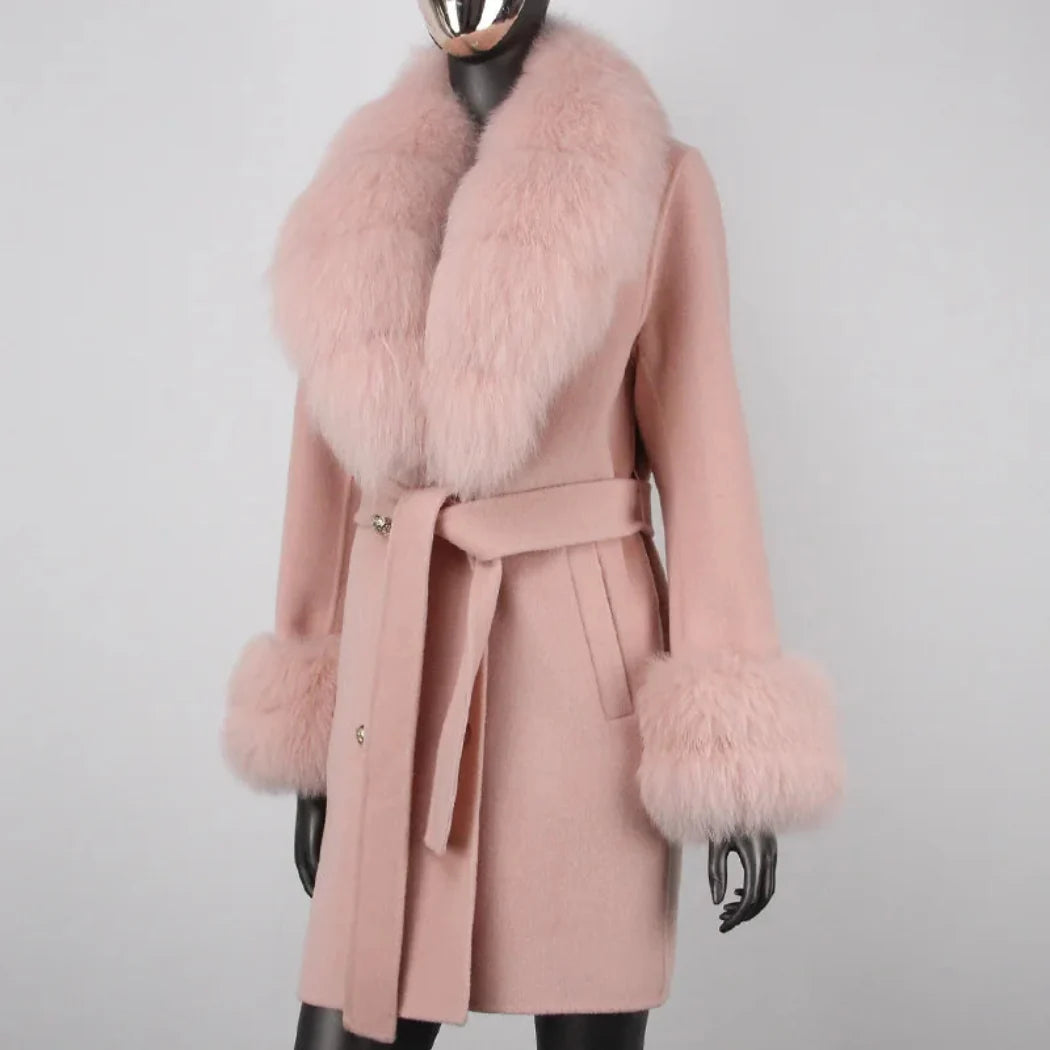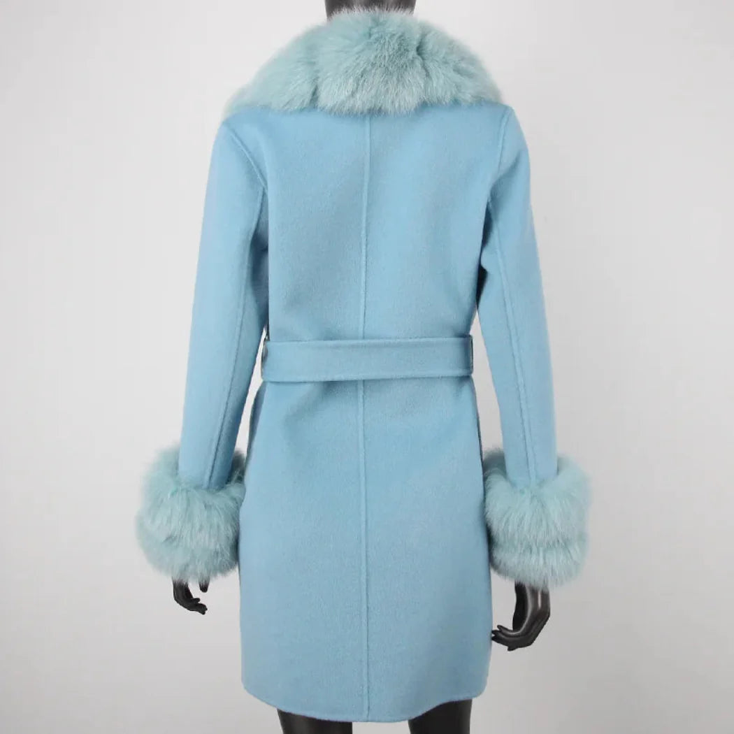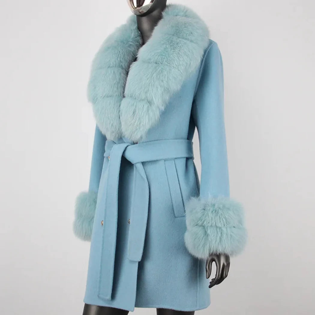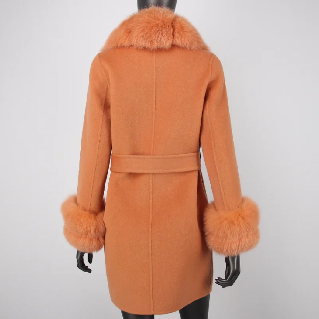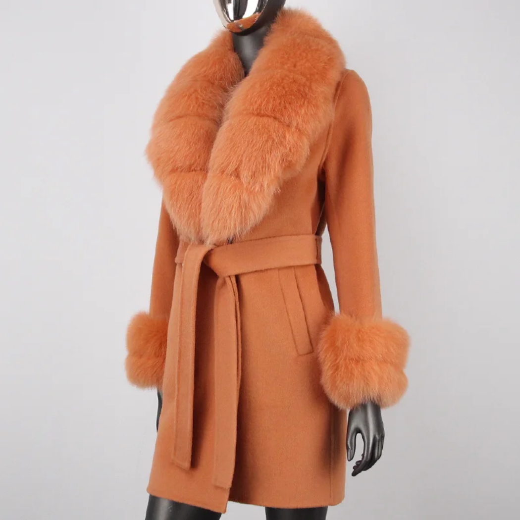 This coat offers luxurious warmth and exceptional comfort in a petite design. Made with a premium blend of 90% wool and 10% cashmere. it features real. fluffy. hand-dyed fox fur trim.