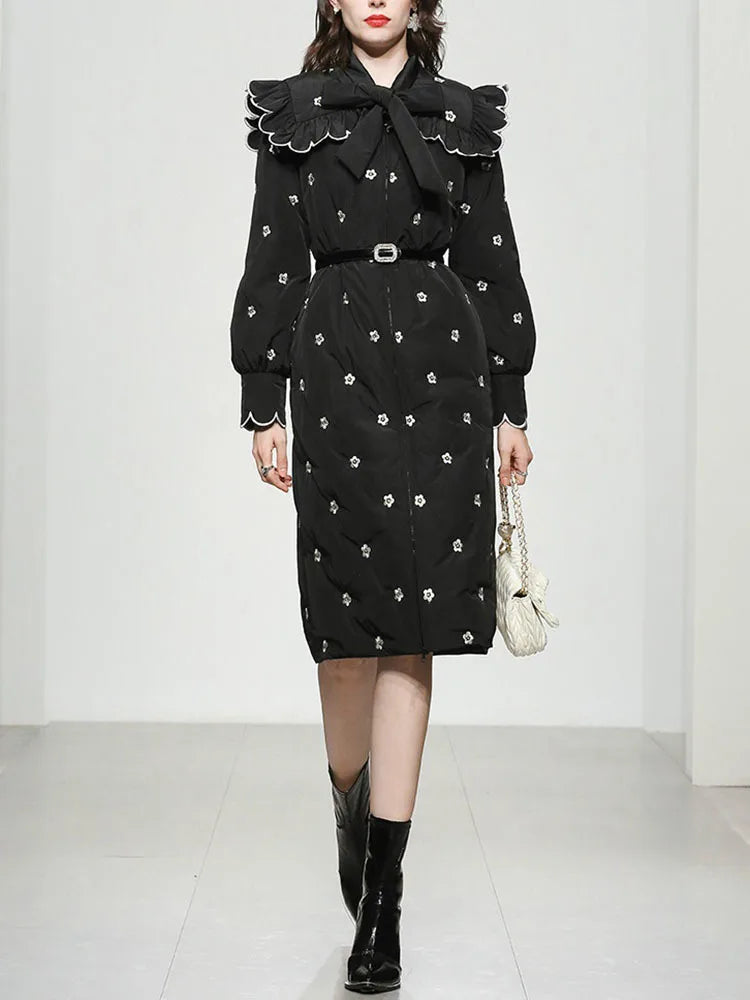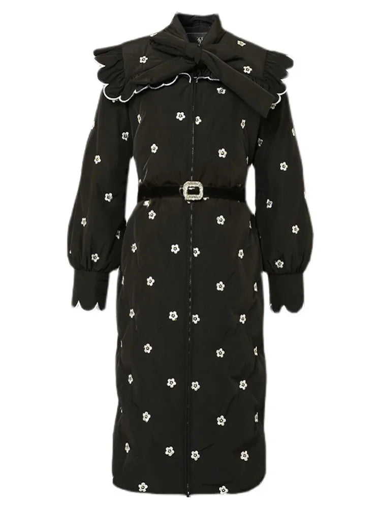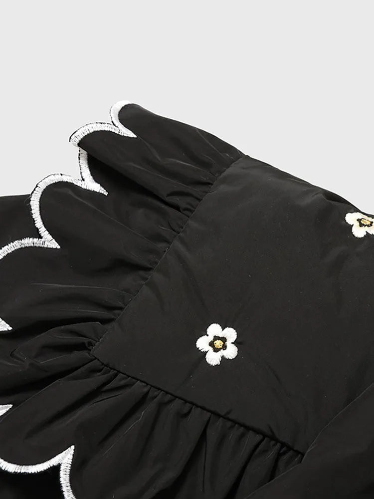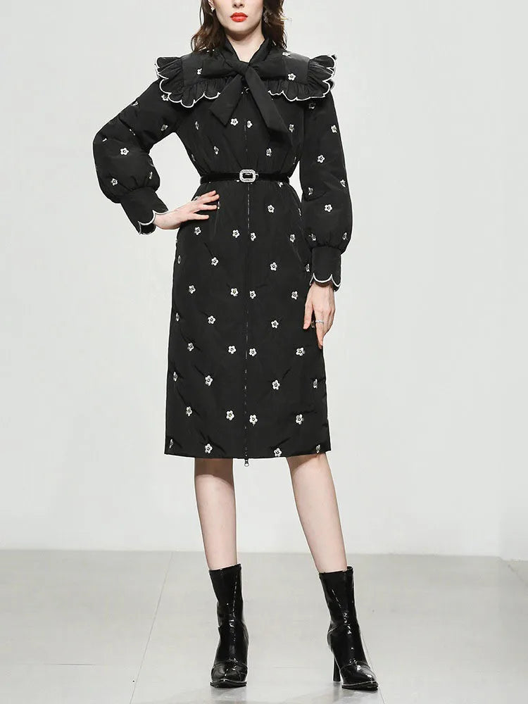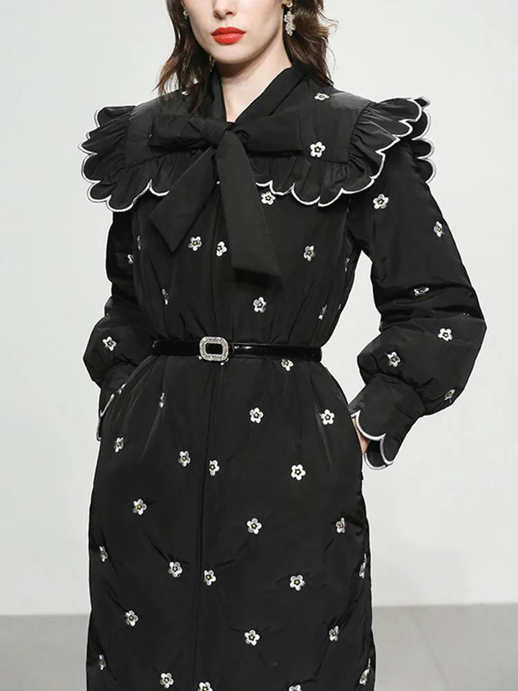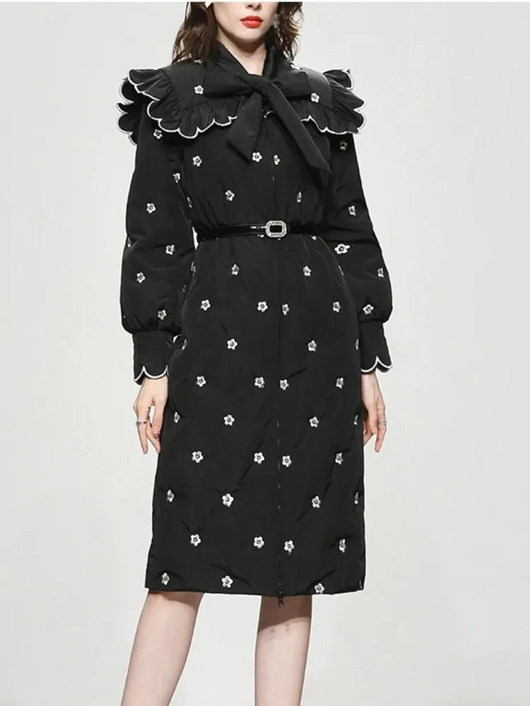 This Women's Petite Floral Long Coat offers a chic and stylish way to stay warm this winter. Designed for petite figures. this long black coat features elegant floral details and a classic sailor collar. Elevate your winter style—get yours now.