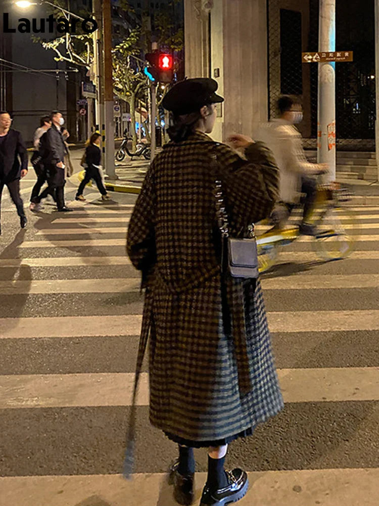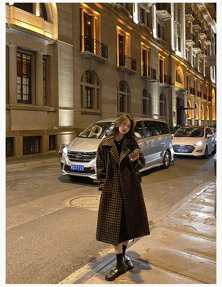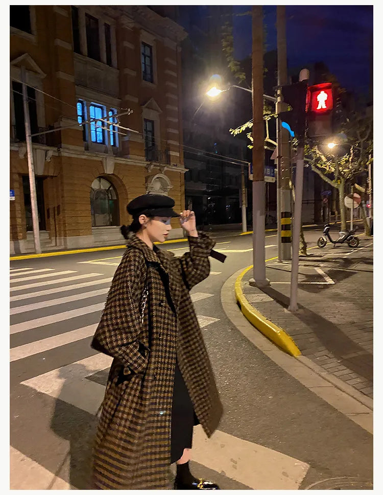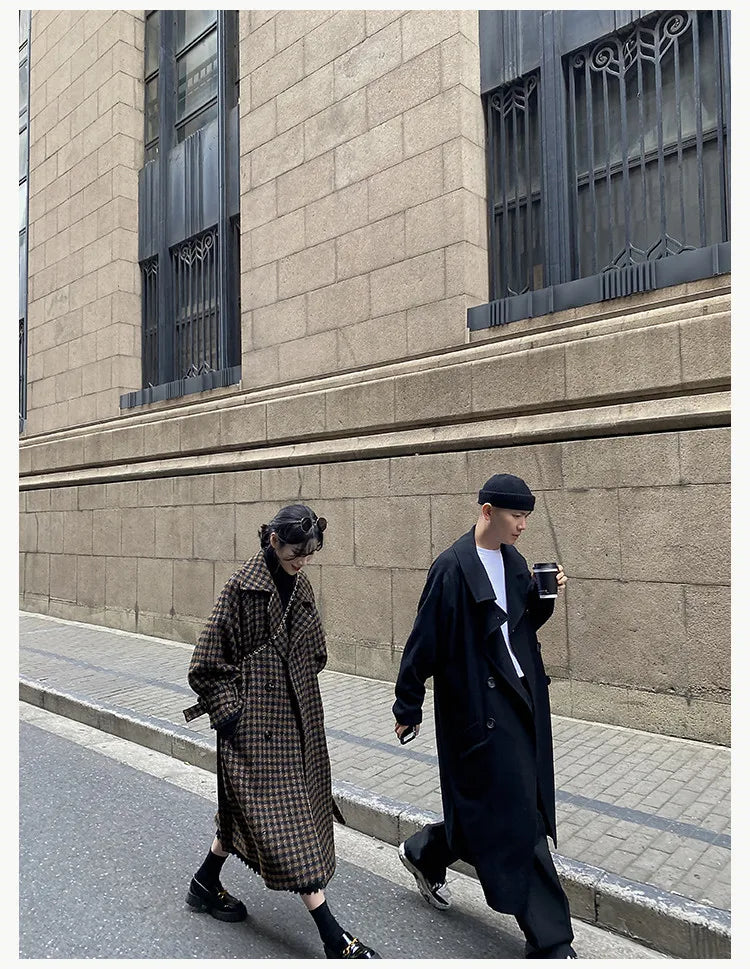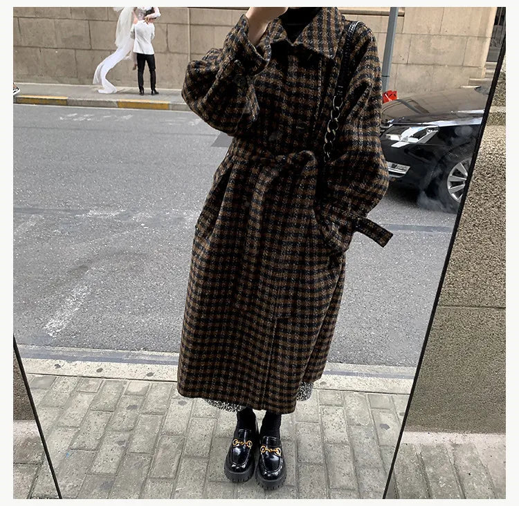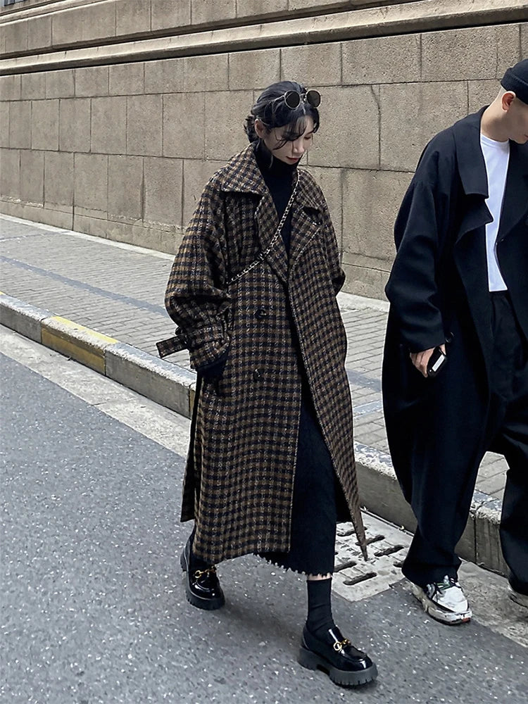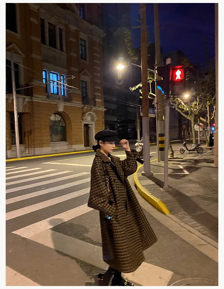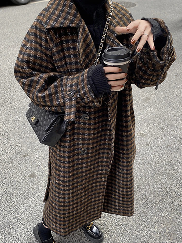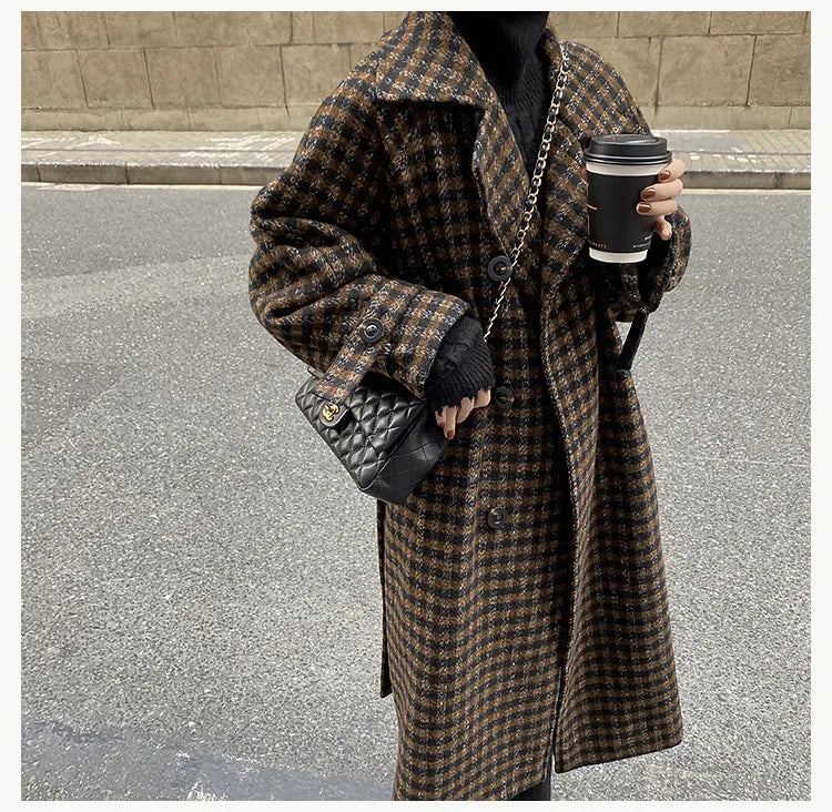 Wrap up in timeless style with this brown plaid woolen trench. designed for warmth and elegance on the chilliest days.