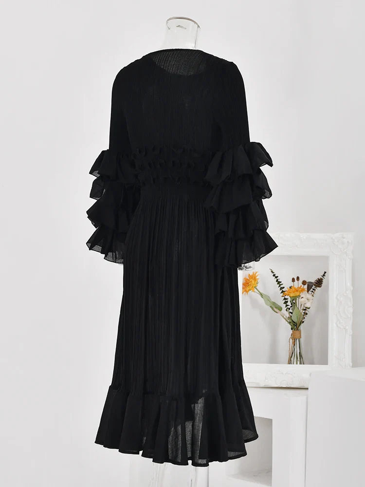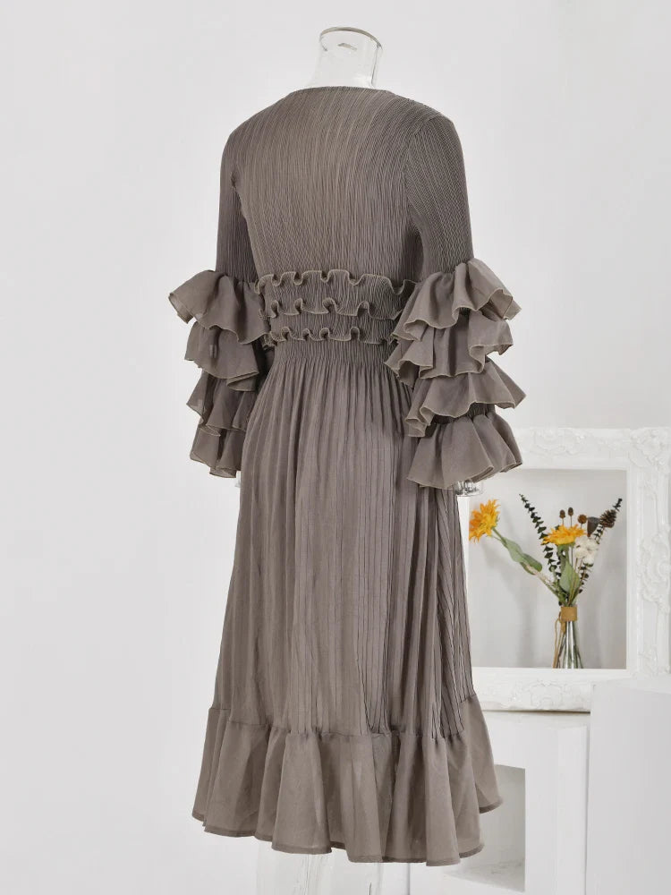 This dress captures the essence of femininity and grace. With a beautifully pleated bodice and delicate flutter sleeves. it drapes effortlessly over the body. creating a soft silhouette.