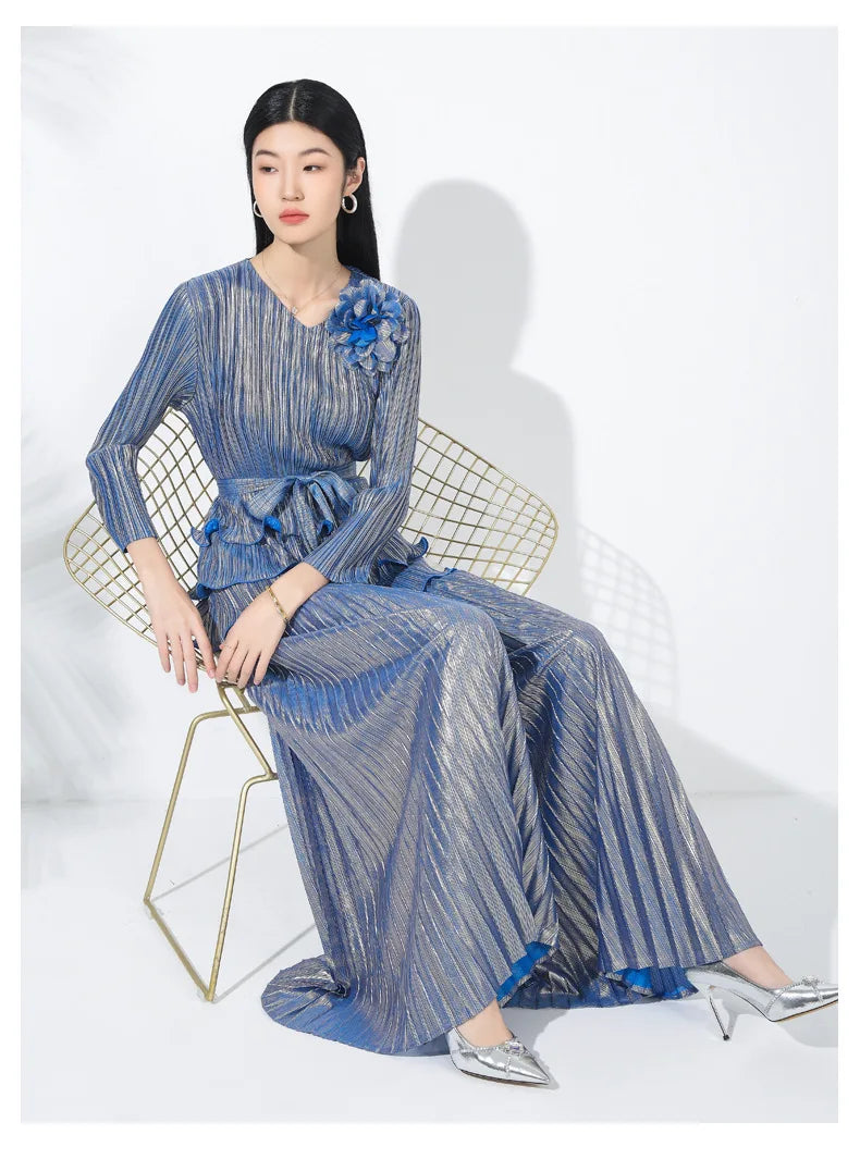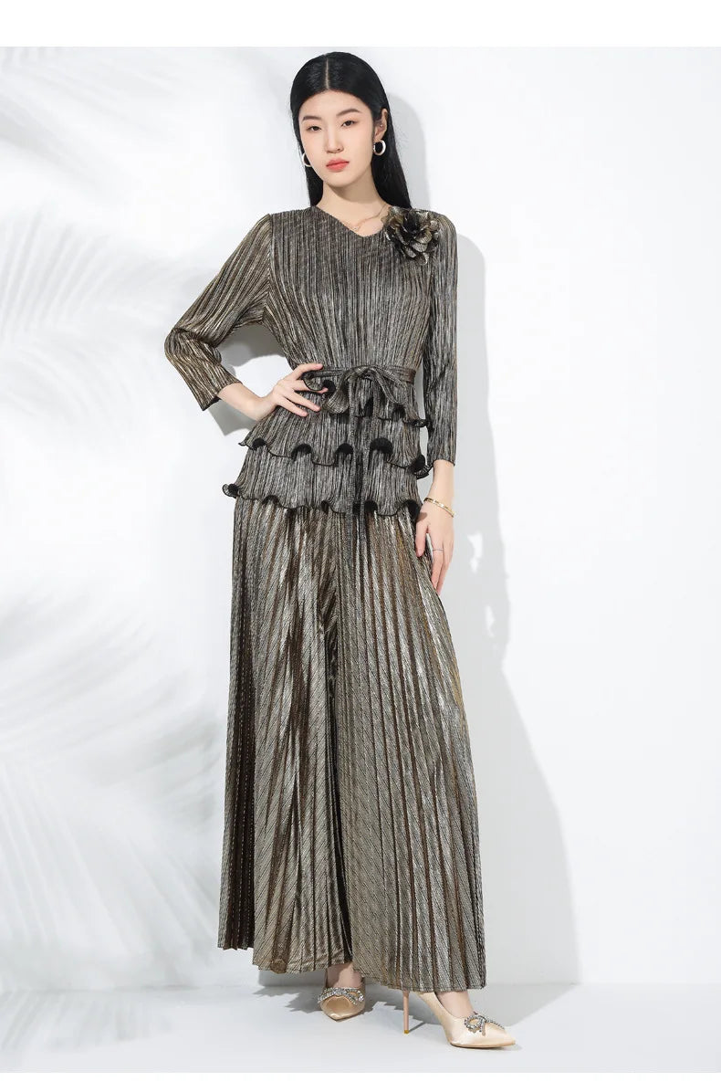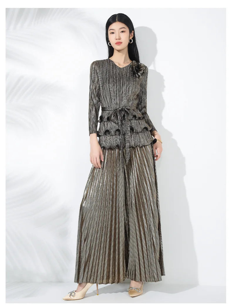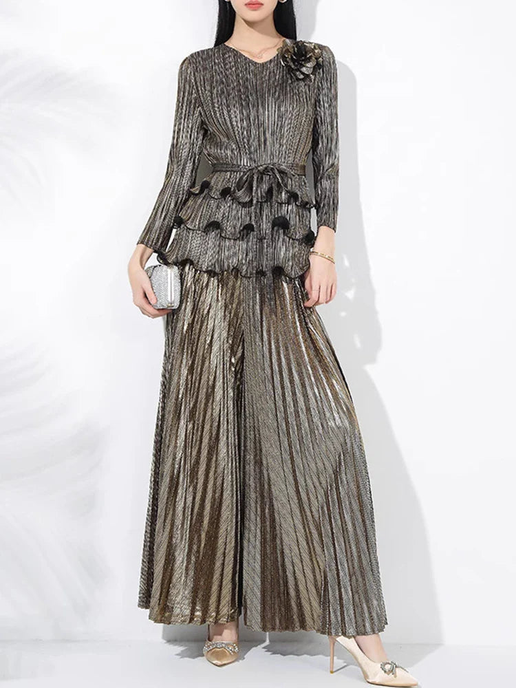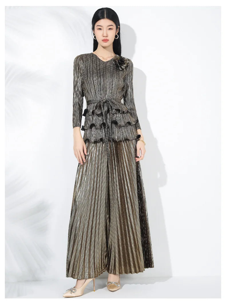 An everyday staple. this pleated set blends graceful style with unmatched comfort. The wide-leg pants feature an elastic waistband for ease. while the shimmery top and ruffle accents add a touch of elegance for any occasion.
