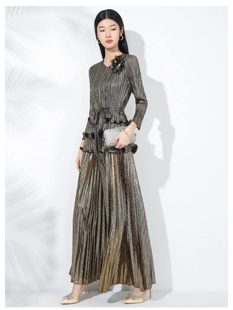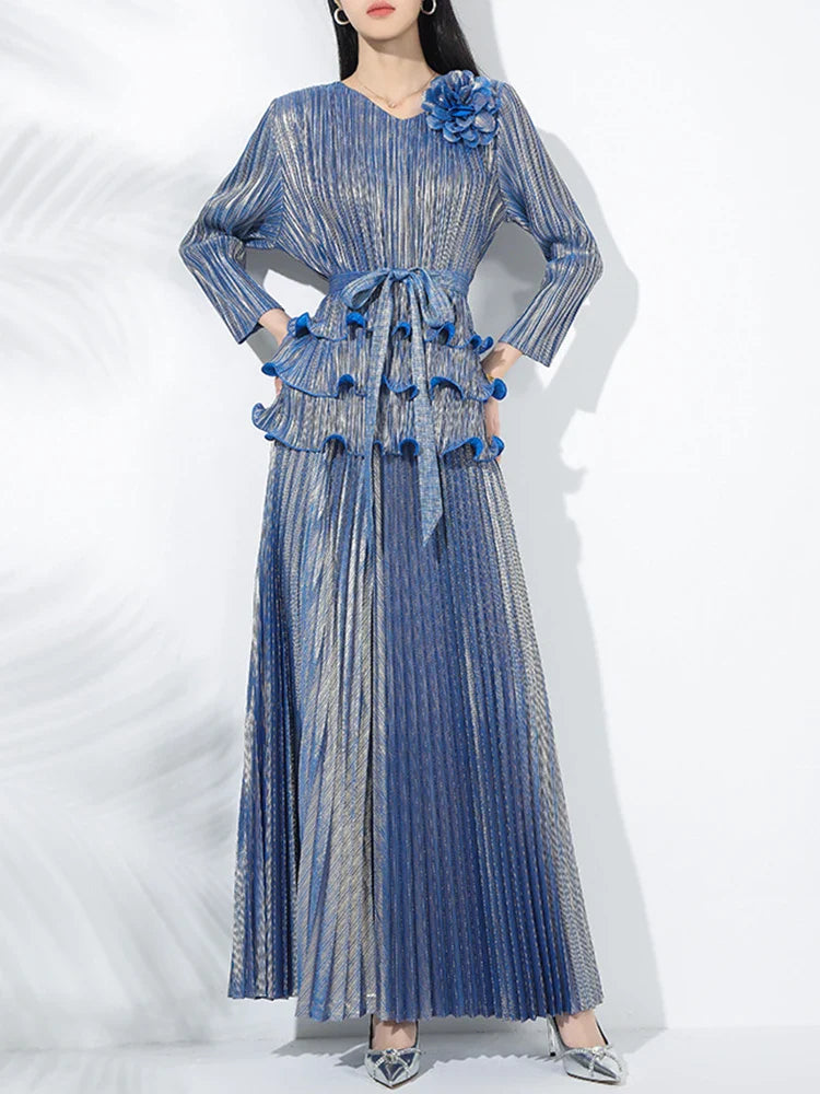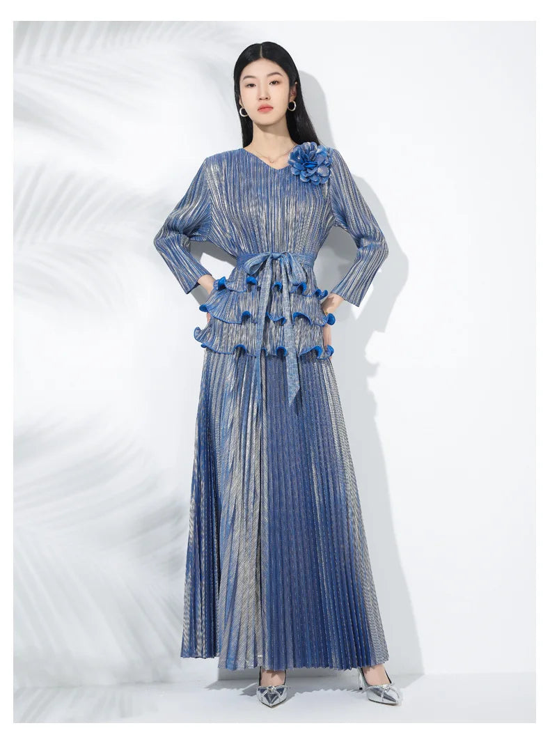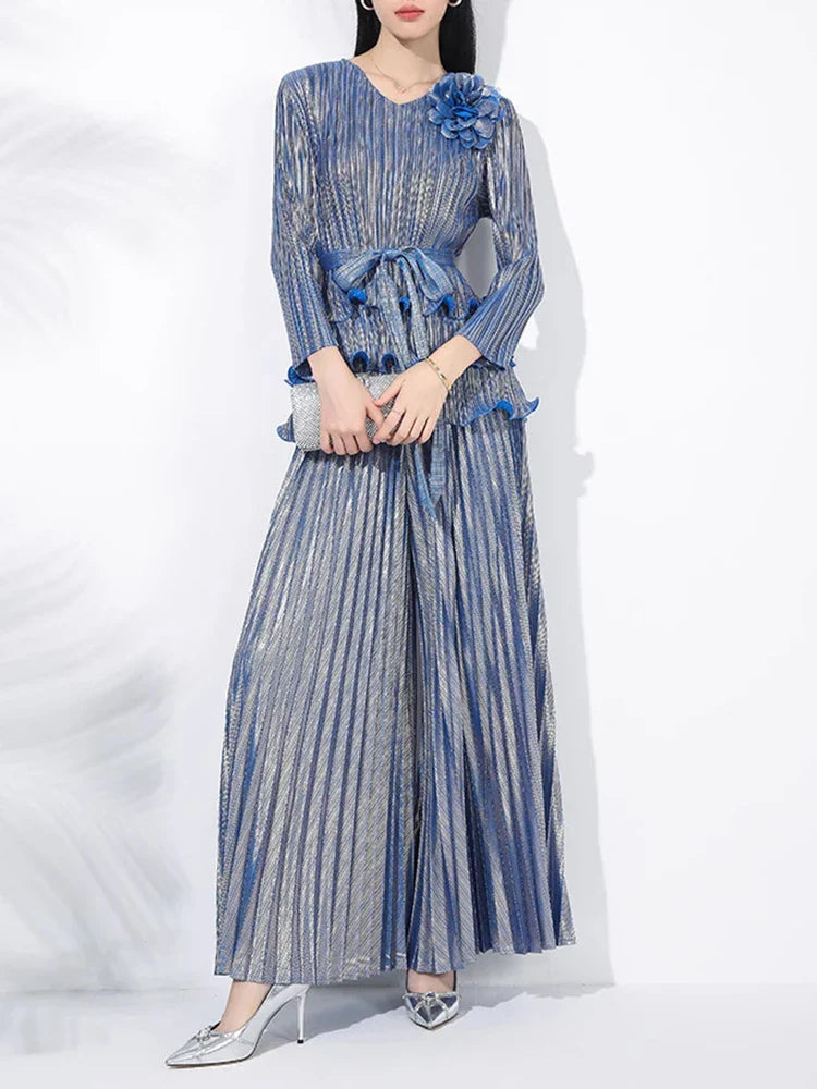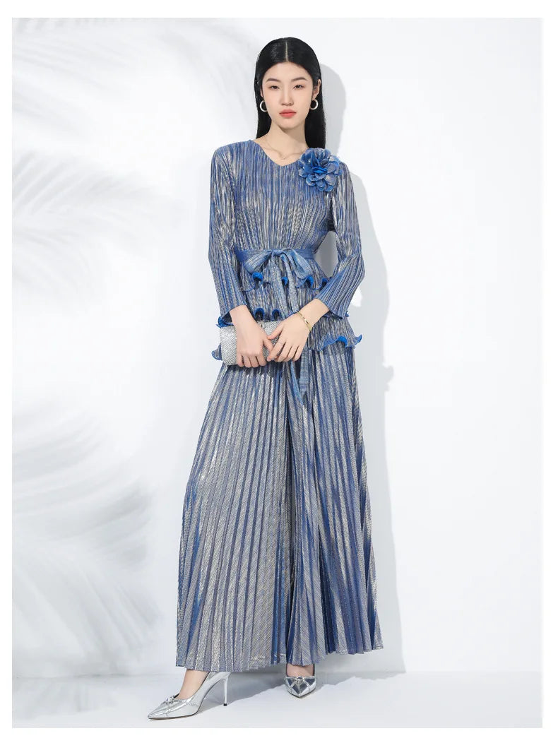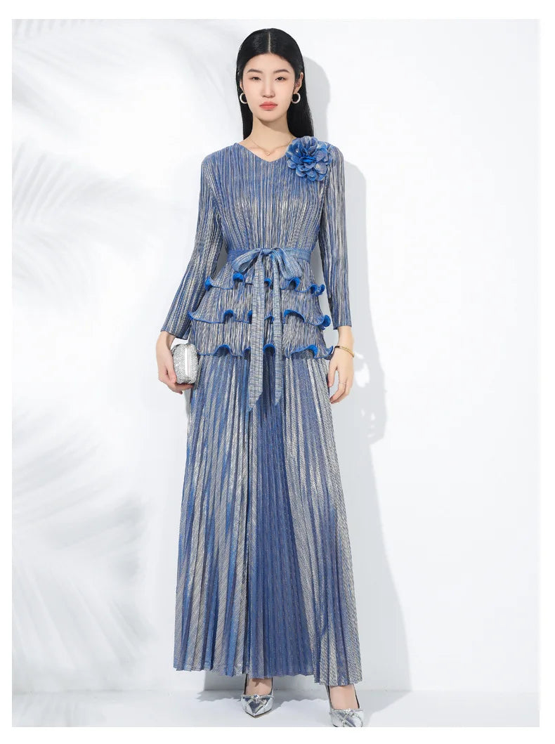 An everyday staple. this pleated set blends graceful style with unmatched comfort. The wide-leg pants feature an elastic waistband for ease. while the shimmery top and ruffle accents add a touch of elegance for any occasion.