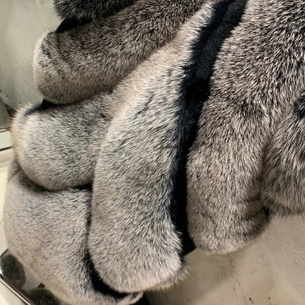 A masterpiece of warmth and luxury. this full-length tiered fox fur coat wraps you in a cozy embrace.