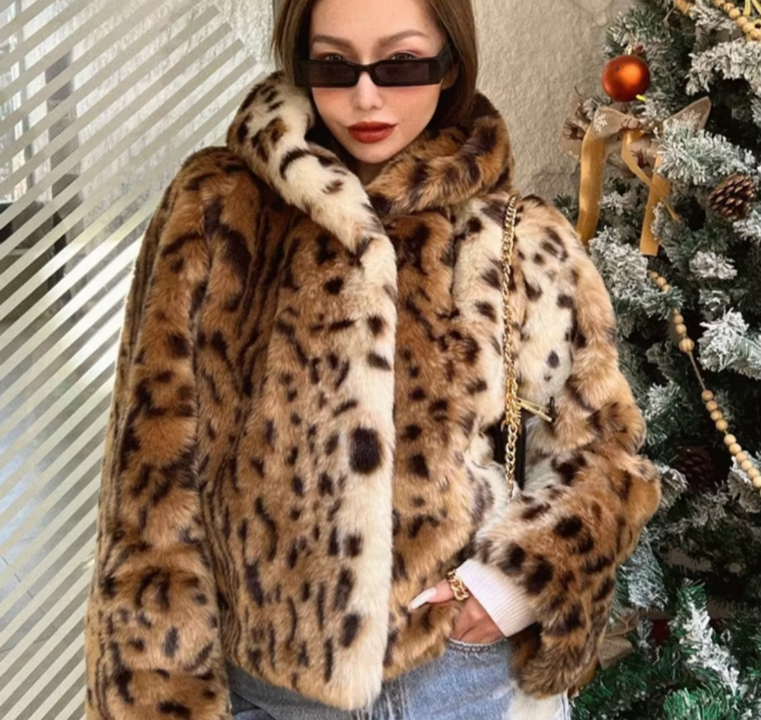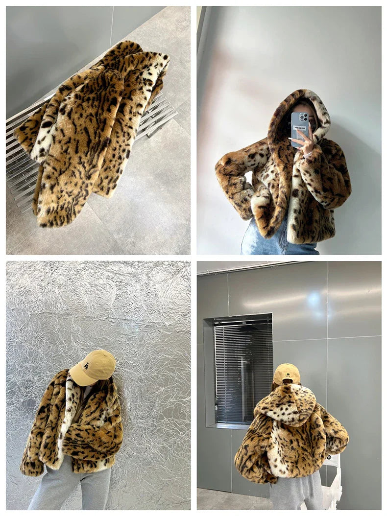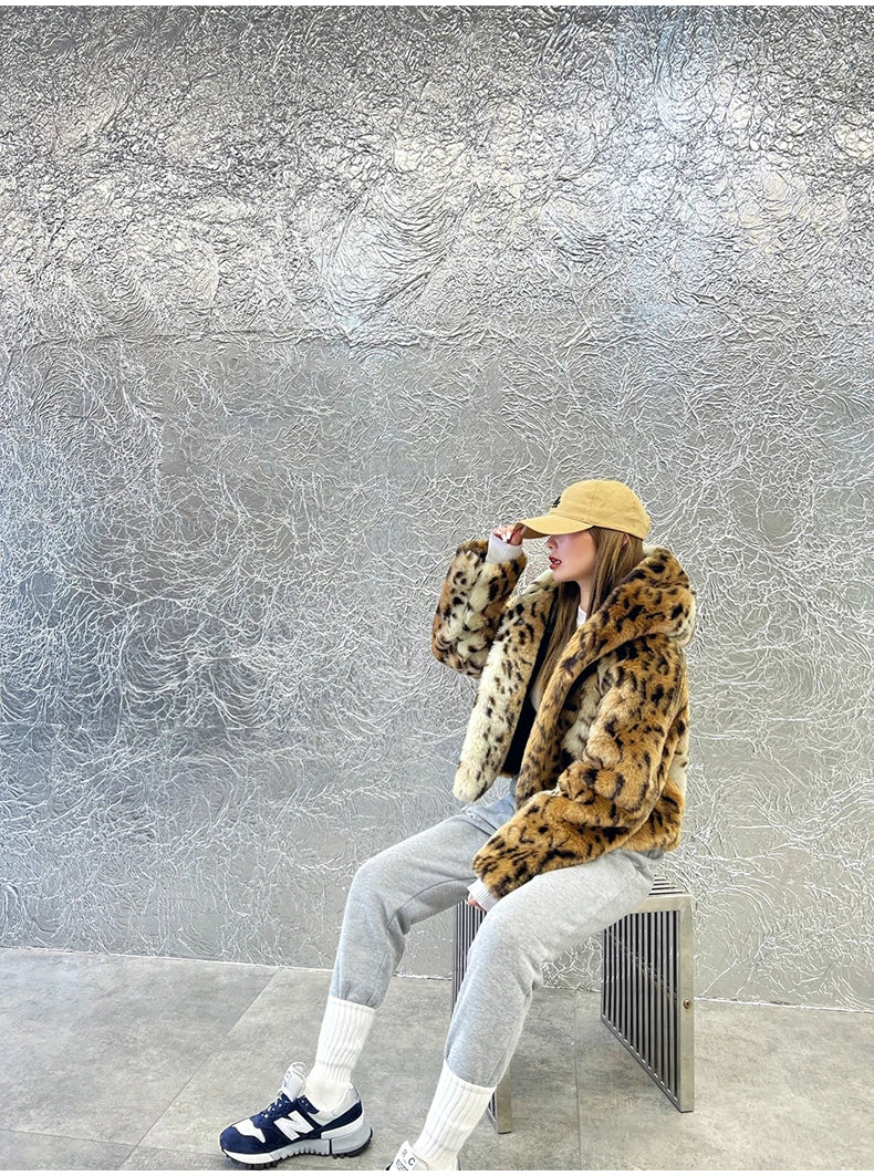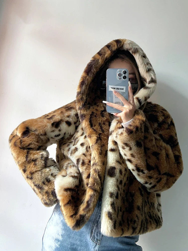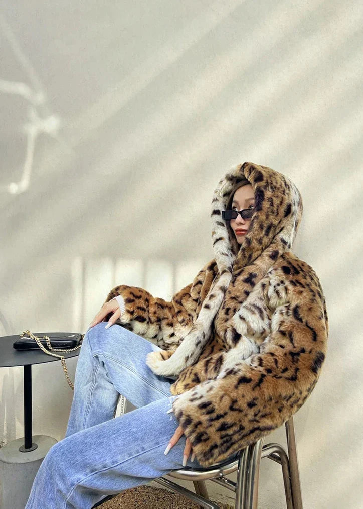 A blend of bold style and cozy luxury. this cropped leopard print faux fur hoodie coat wraps you in warmth while keeping your look effortlessly chic.