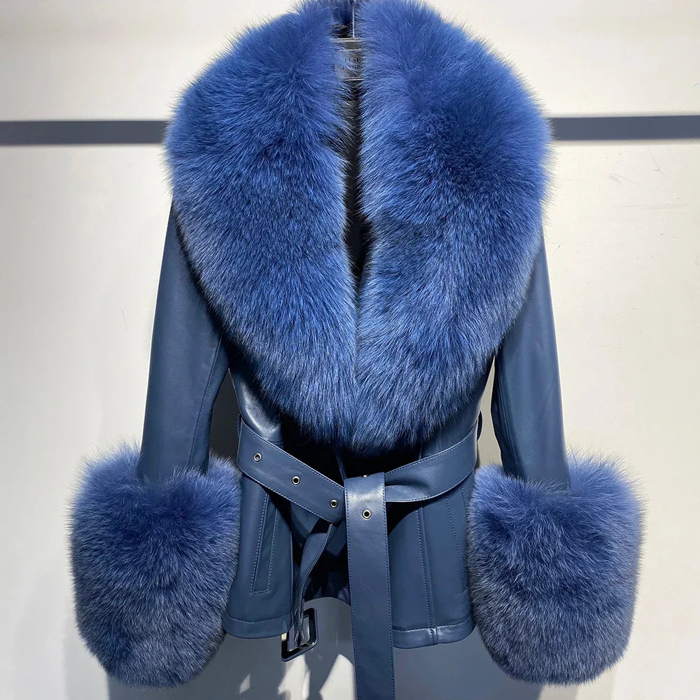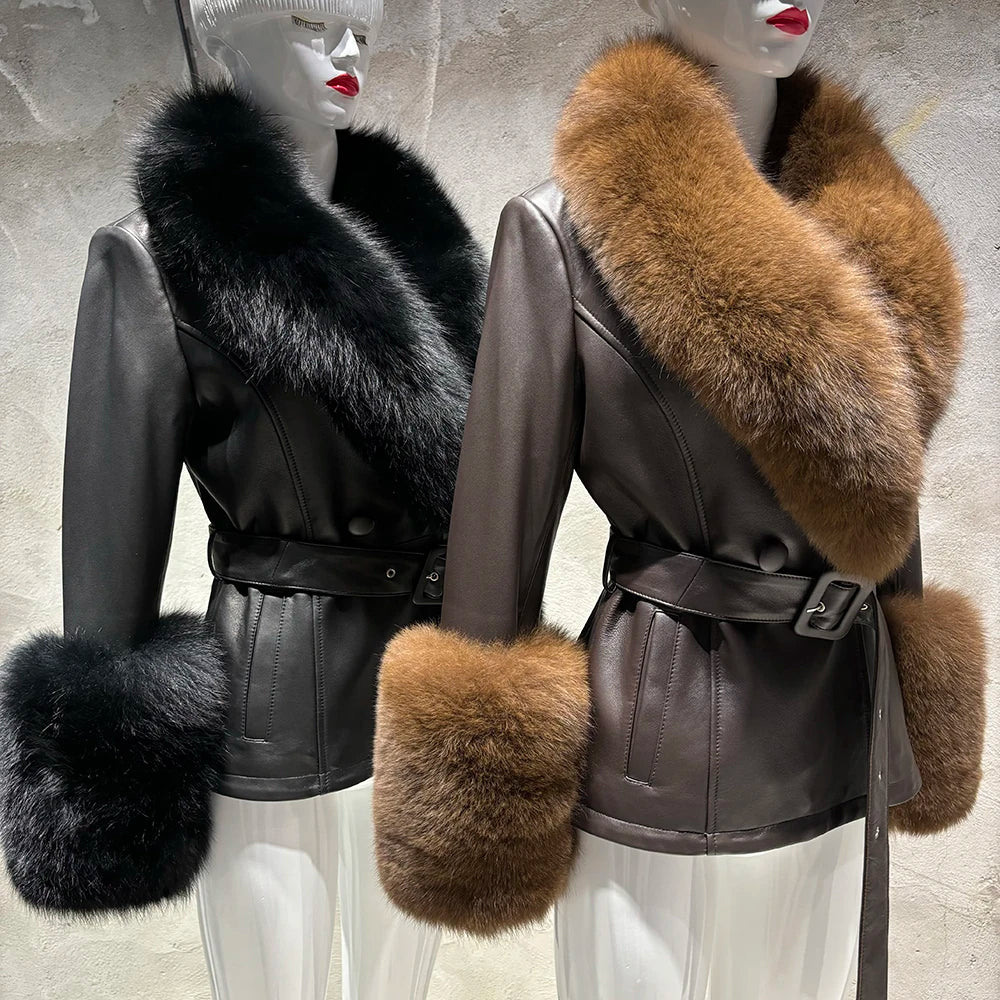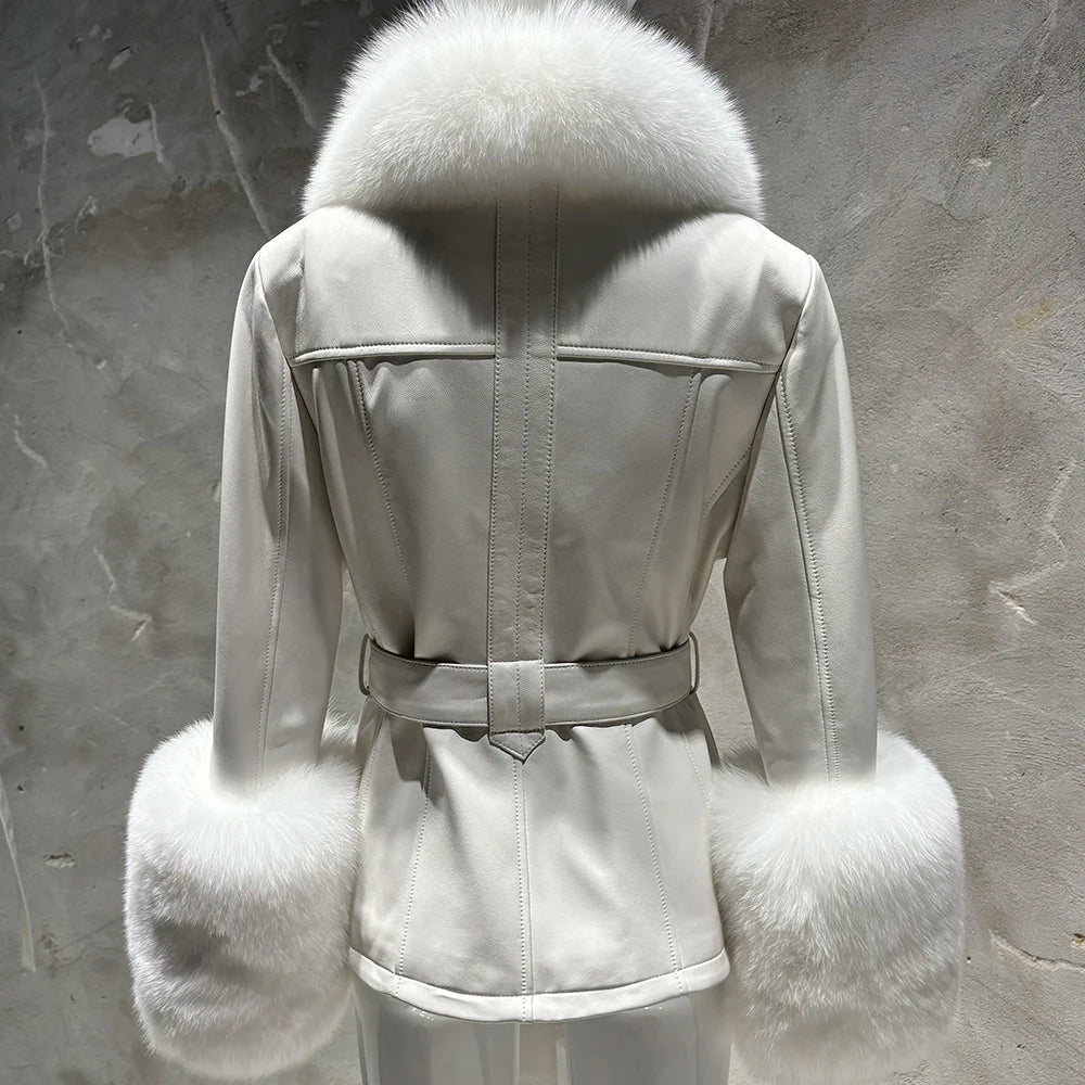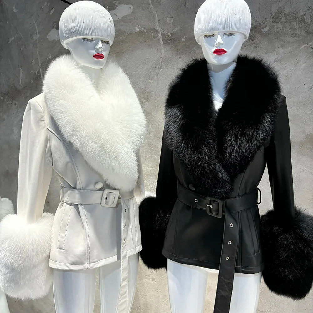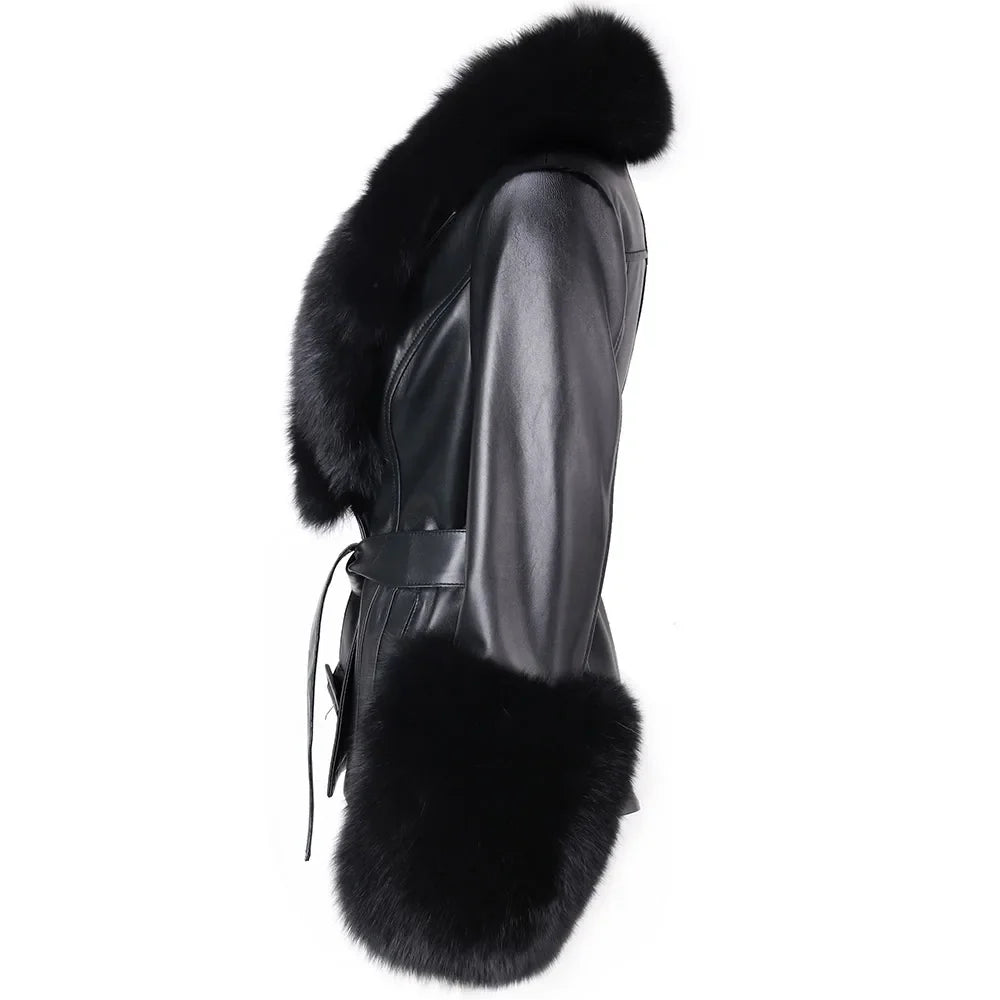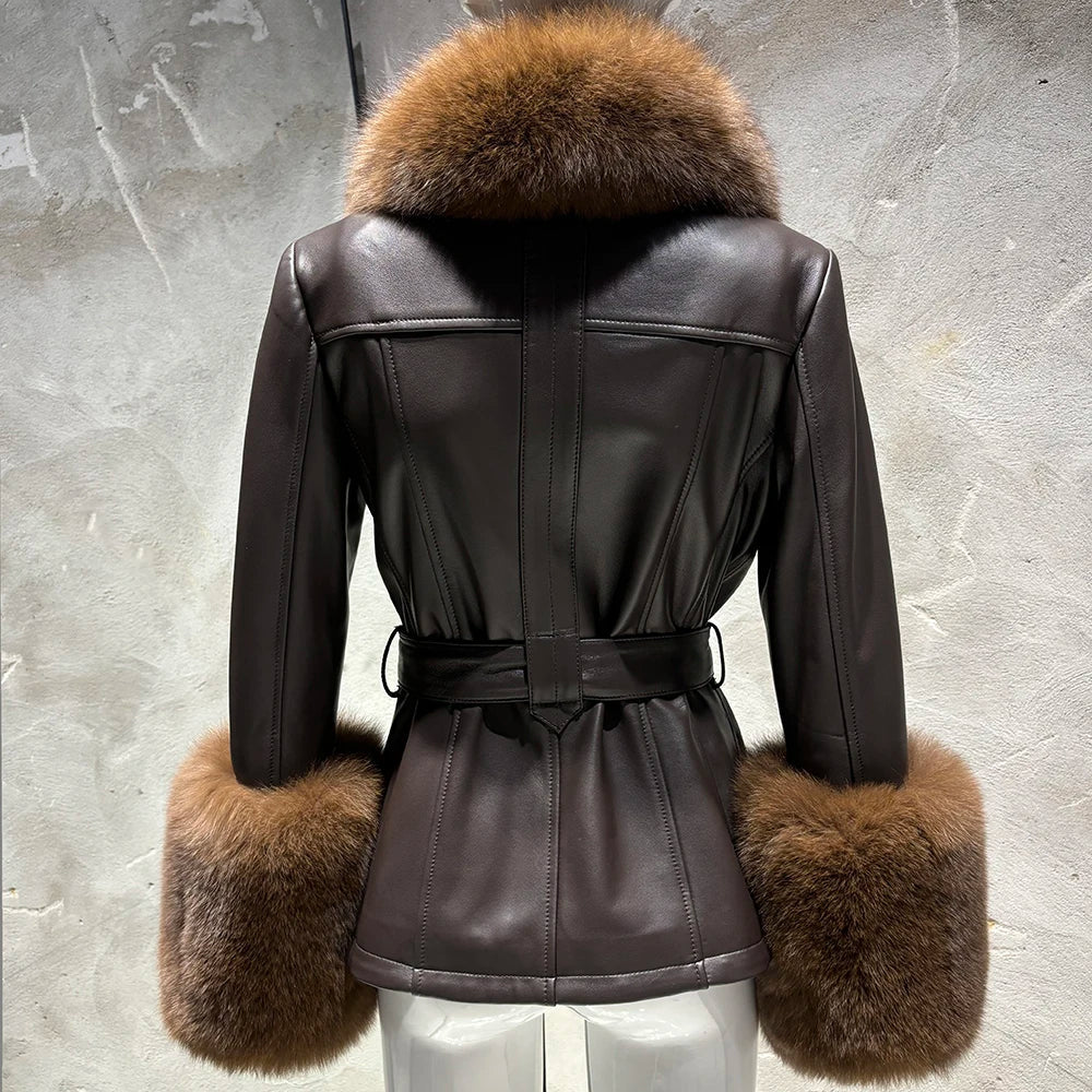 Women's Premium Fox Fur Collar Leather Winter Jacket Coat